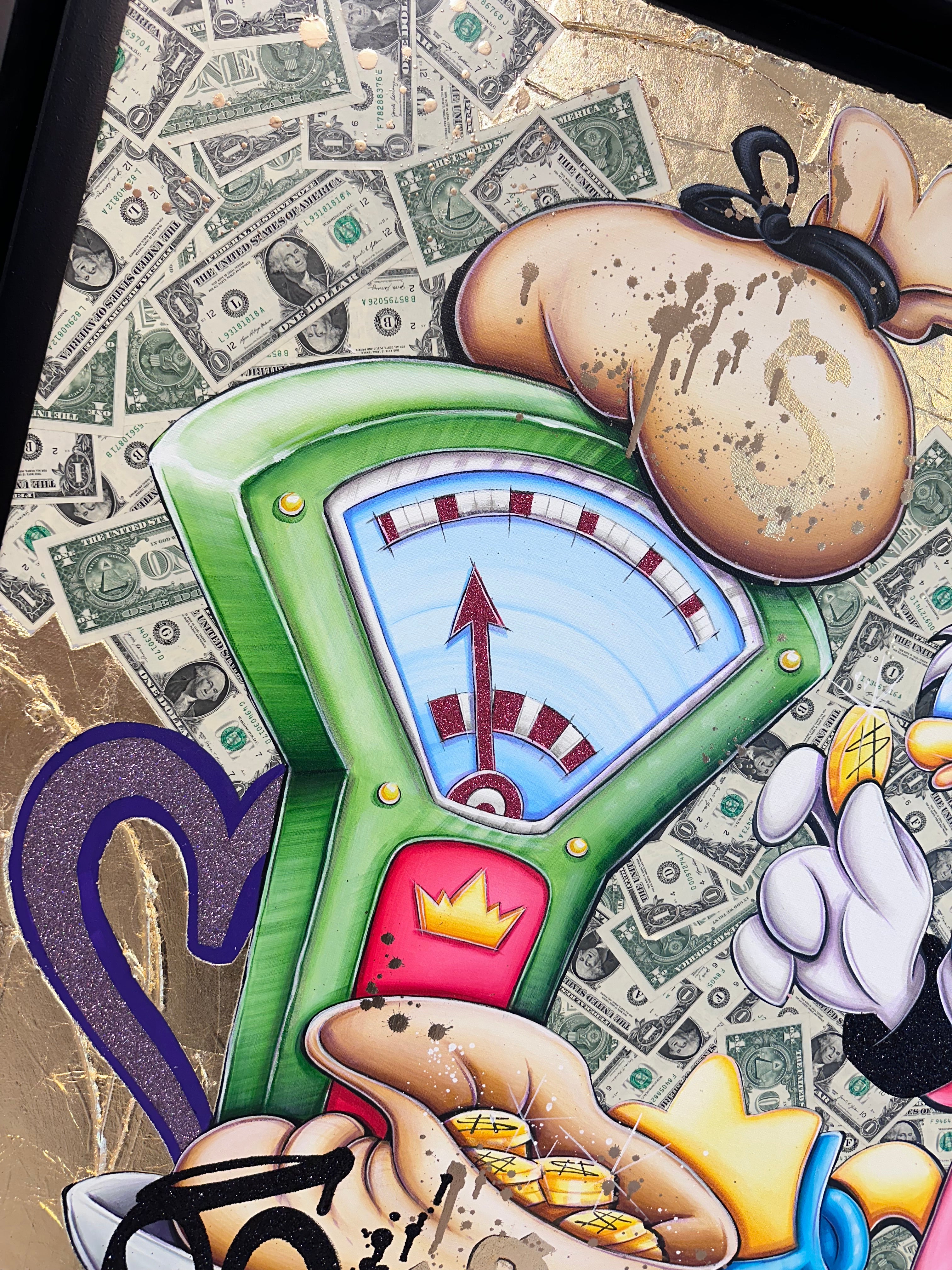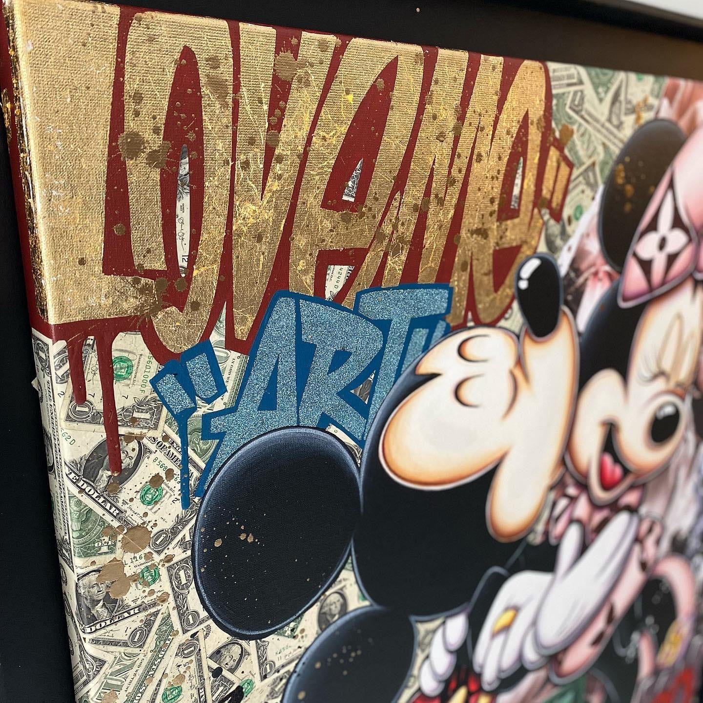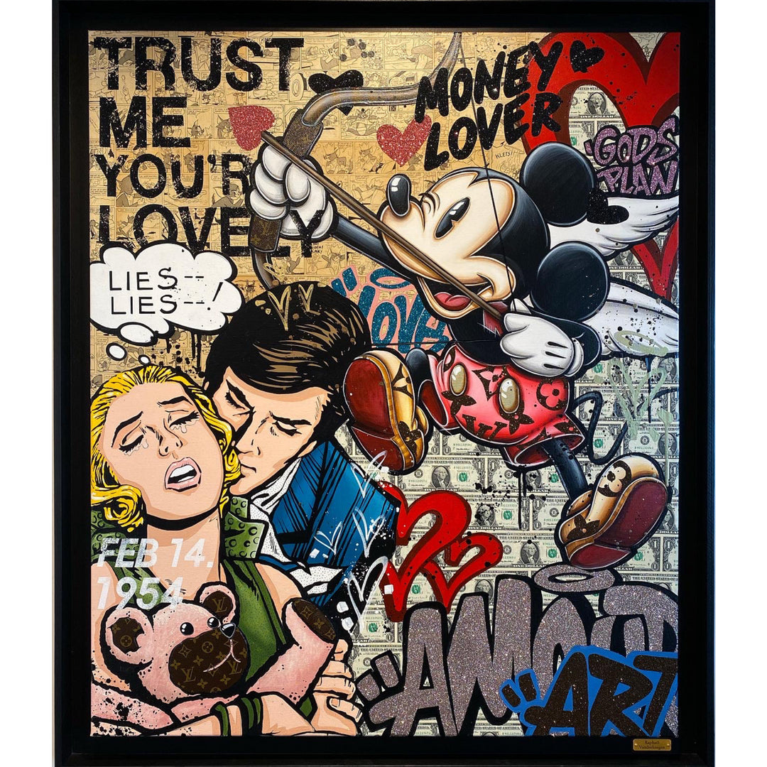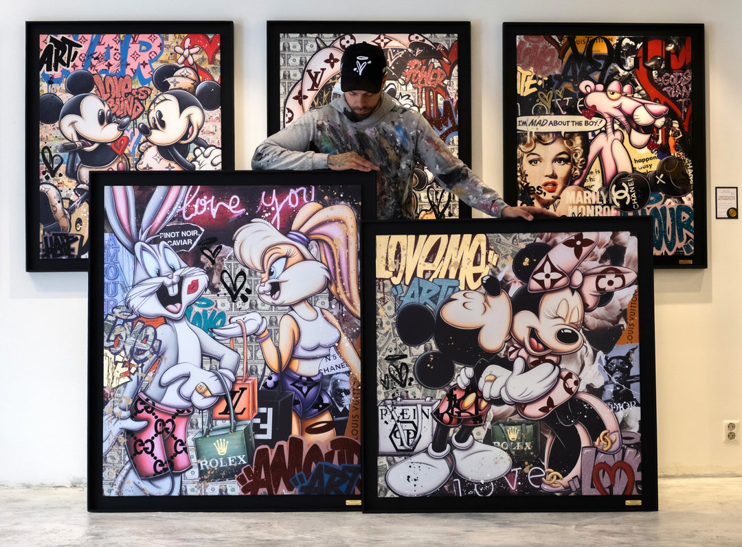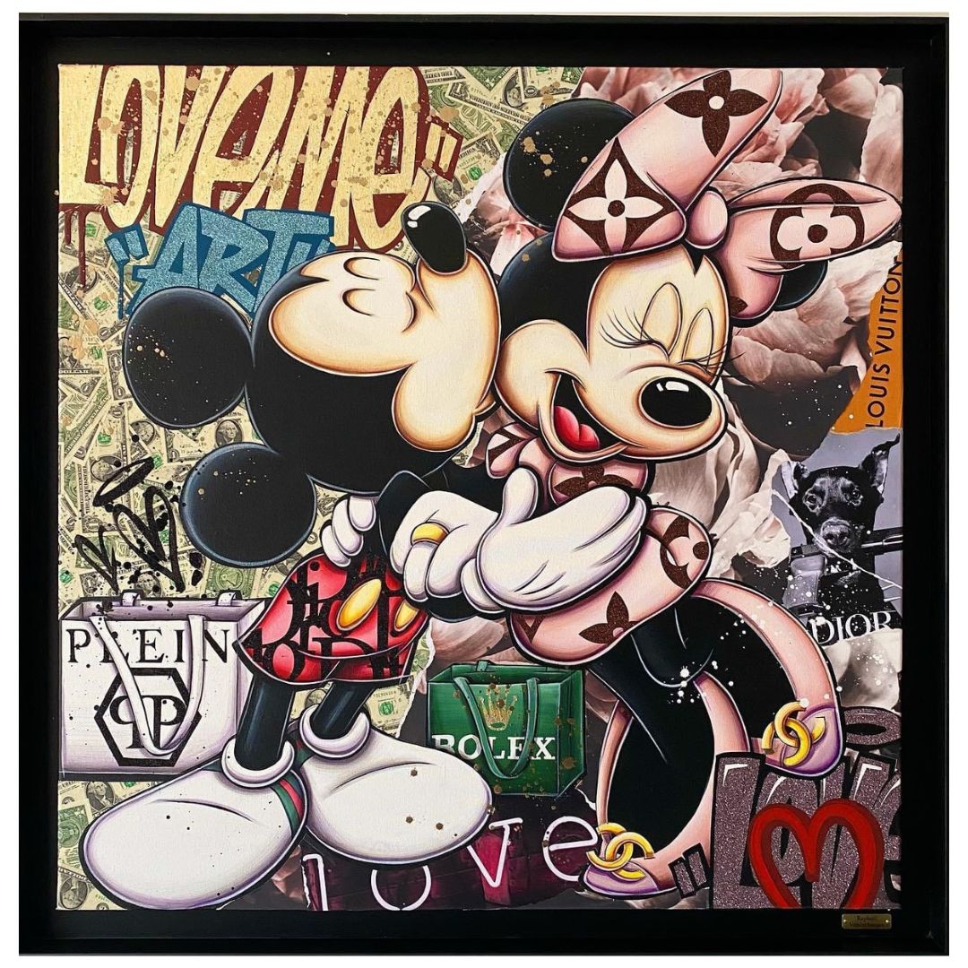 A common thread running through his paintings are the subjects of money and love, often illustrated by popular cartoon characters.