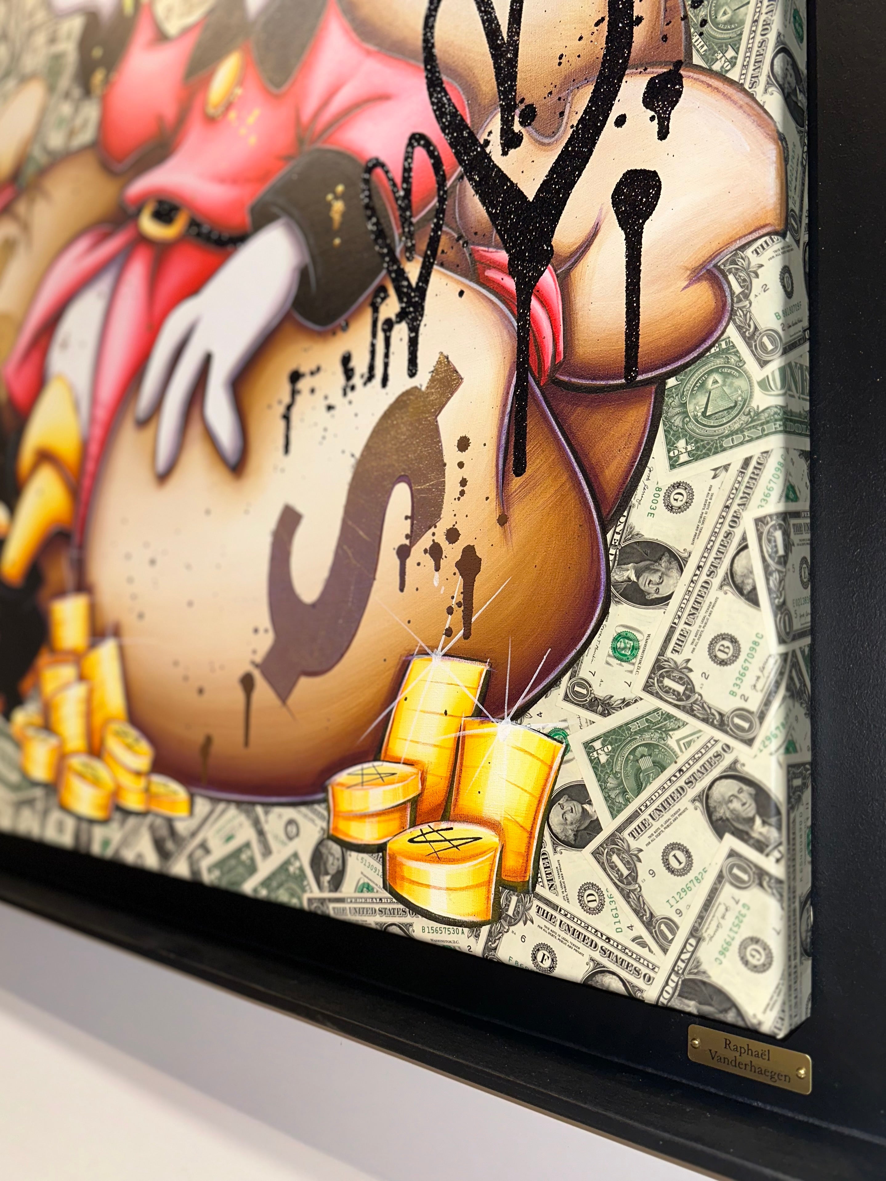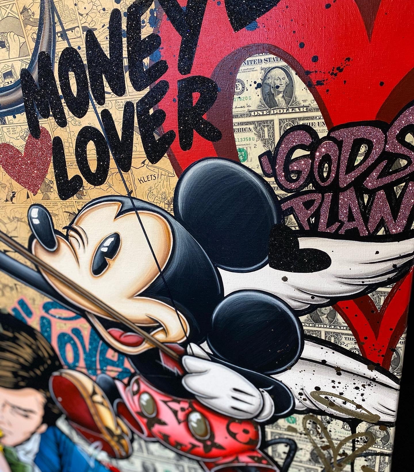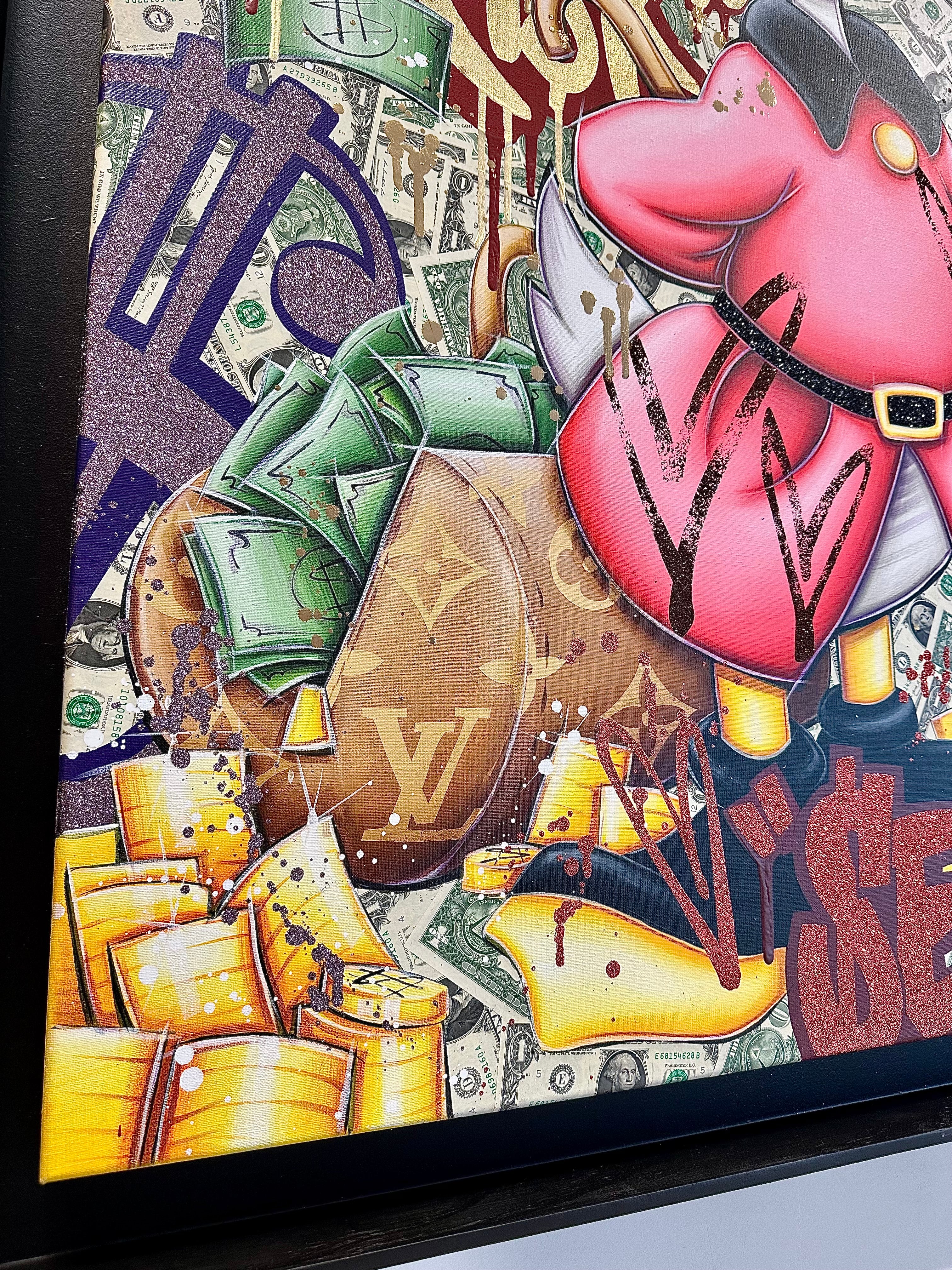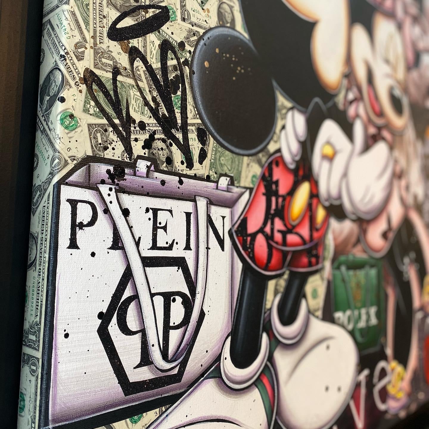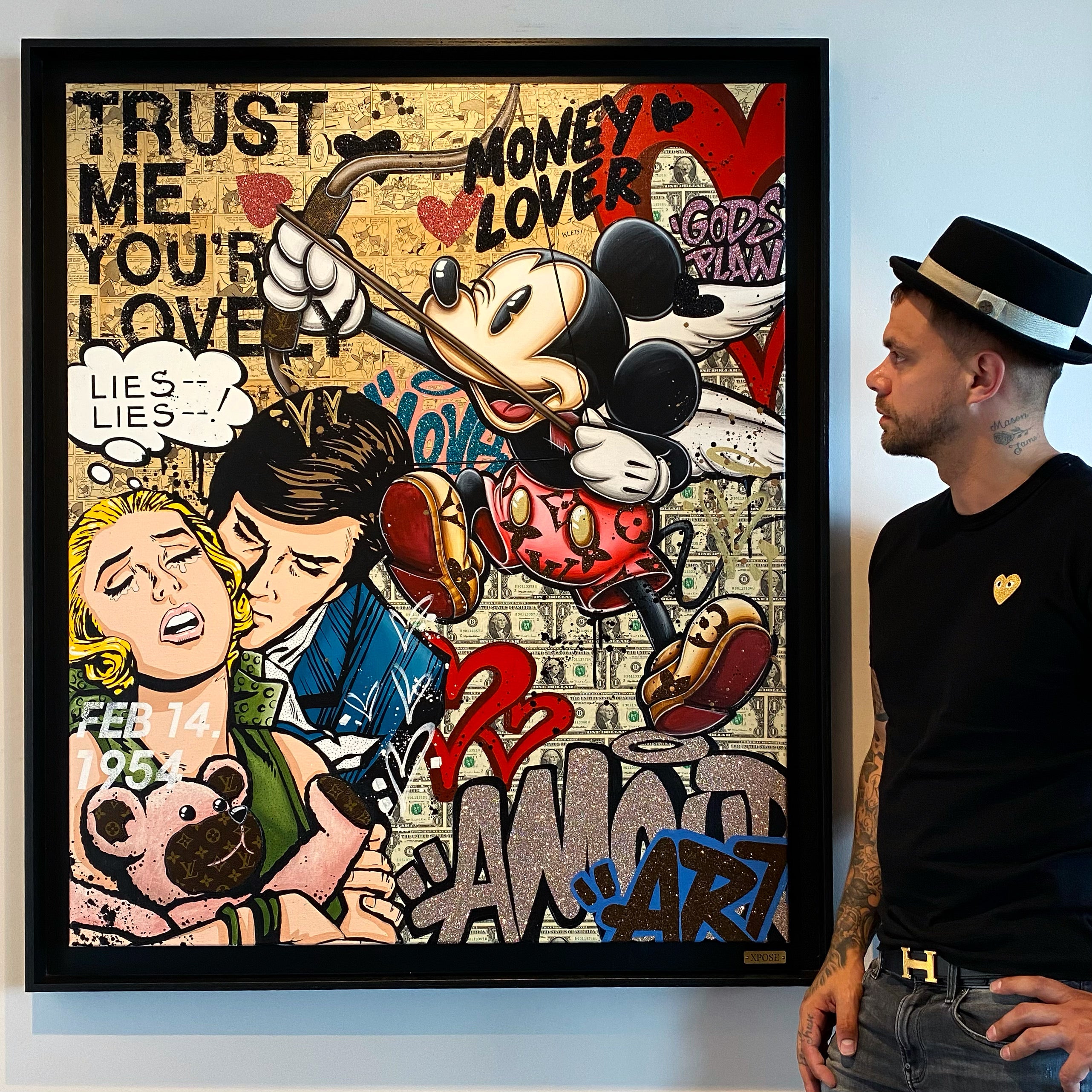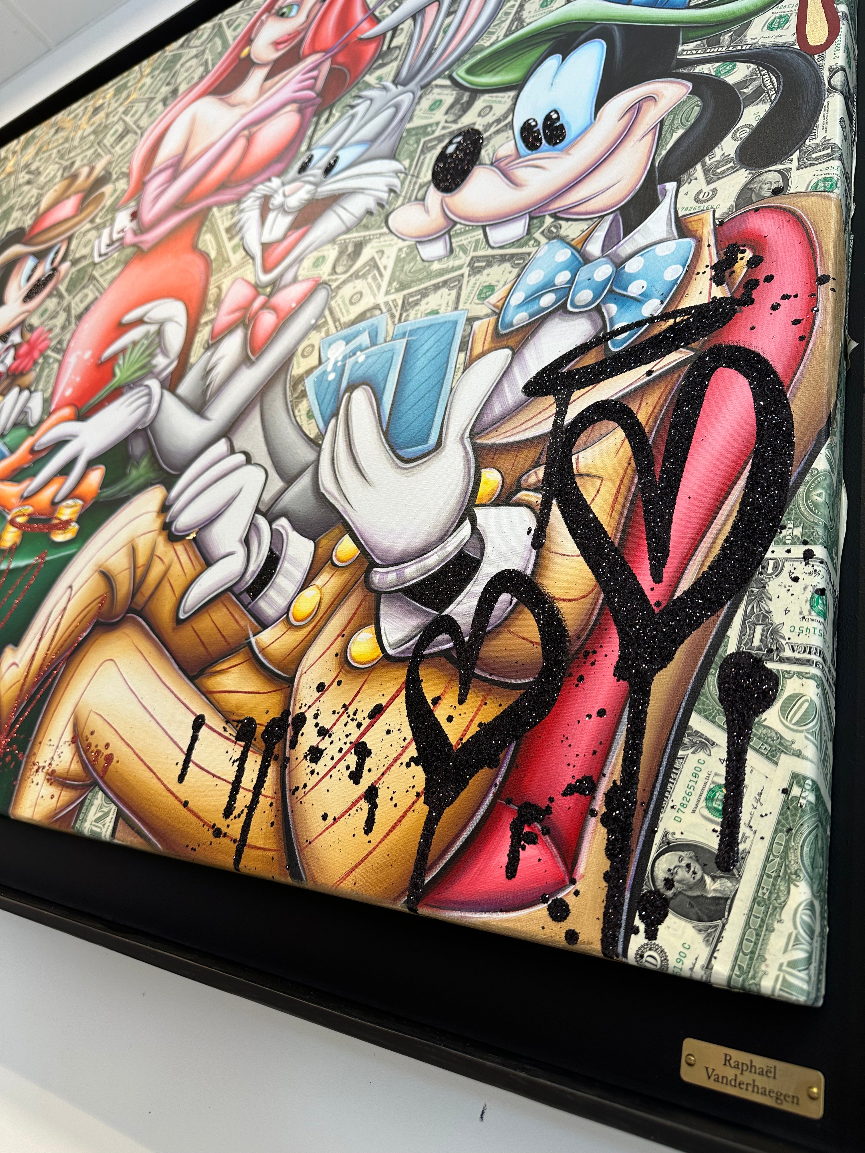 A common thread running through his paintings are the subjects of money and love, often illustrated by popular cartoon characters.