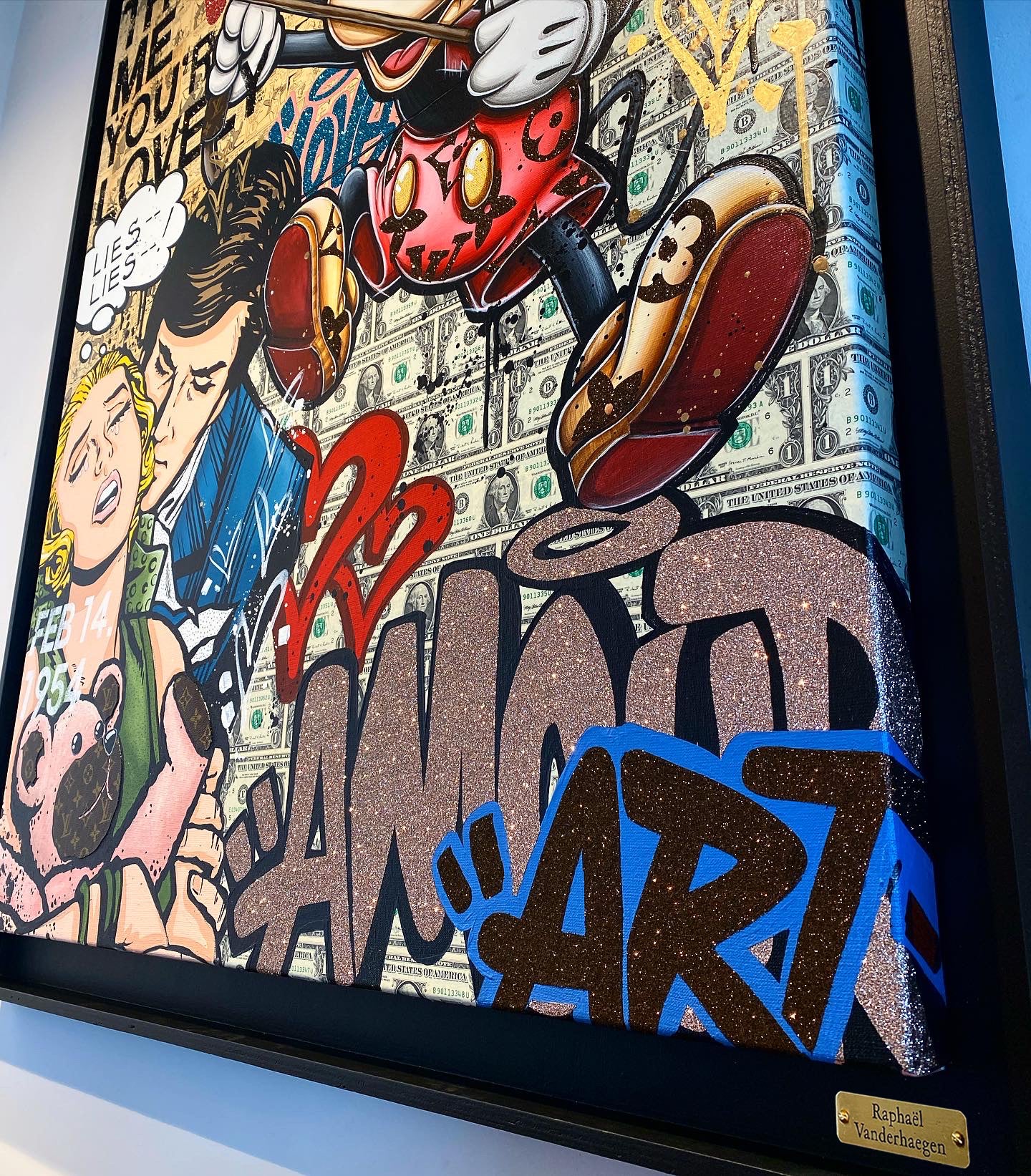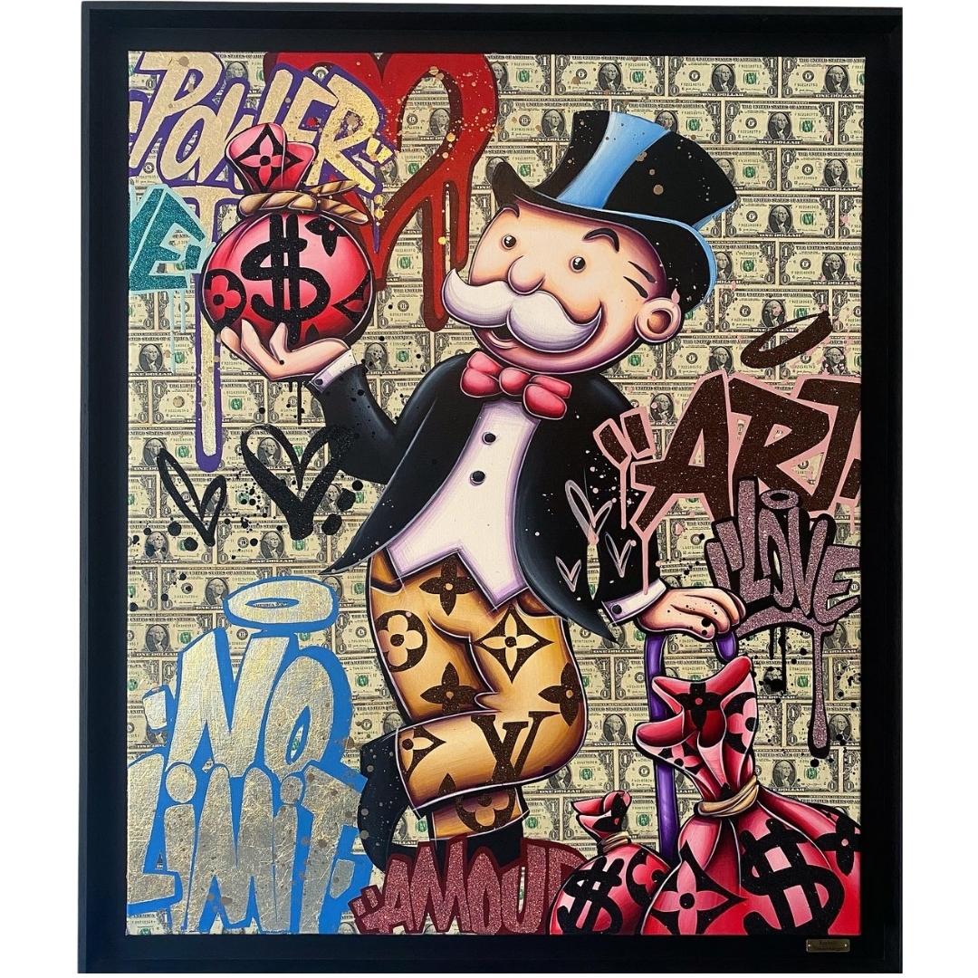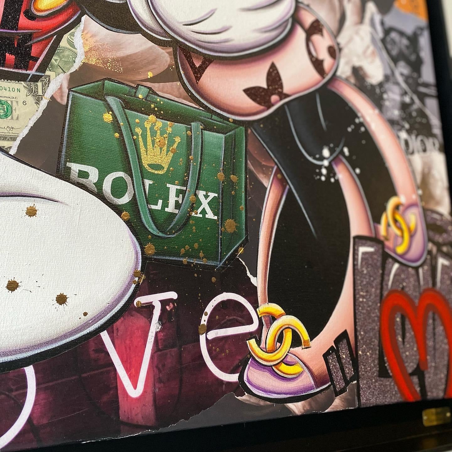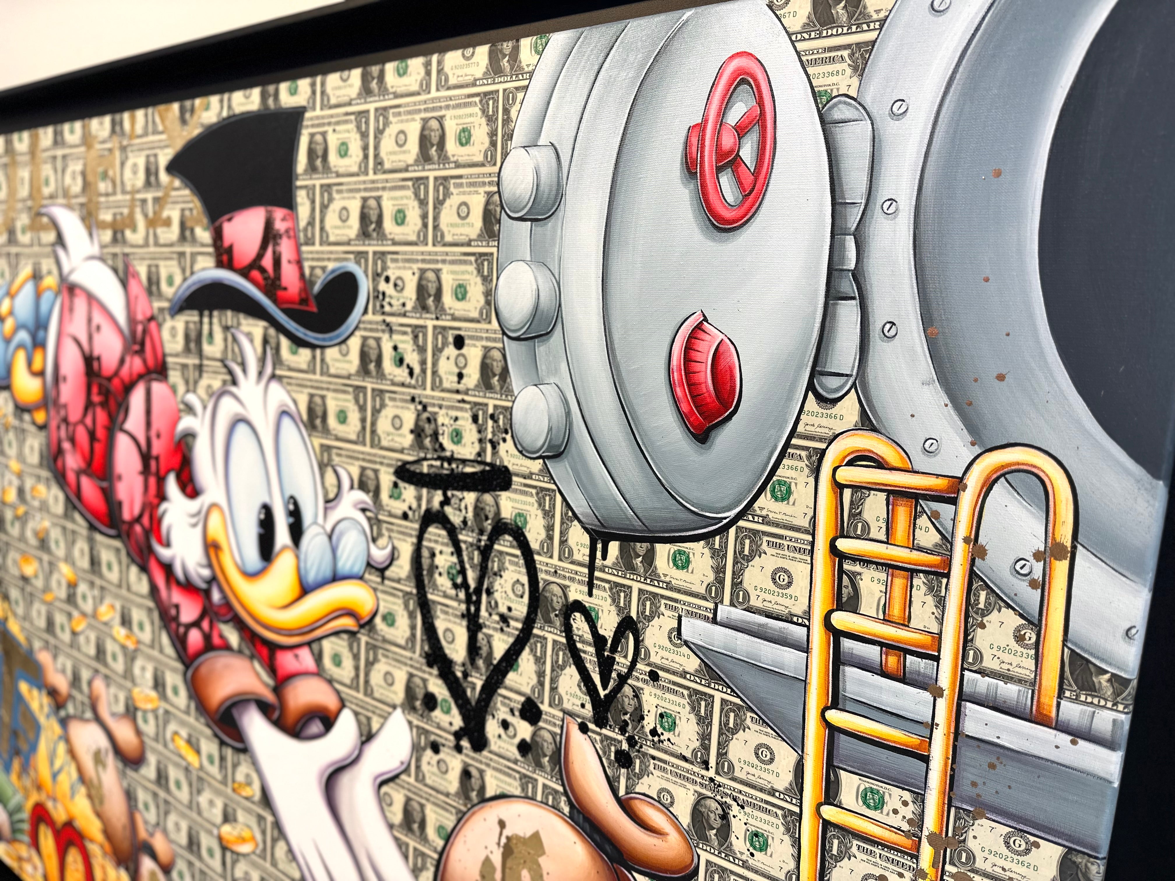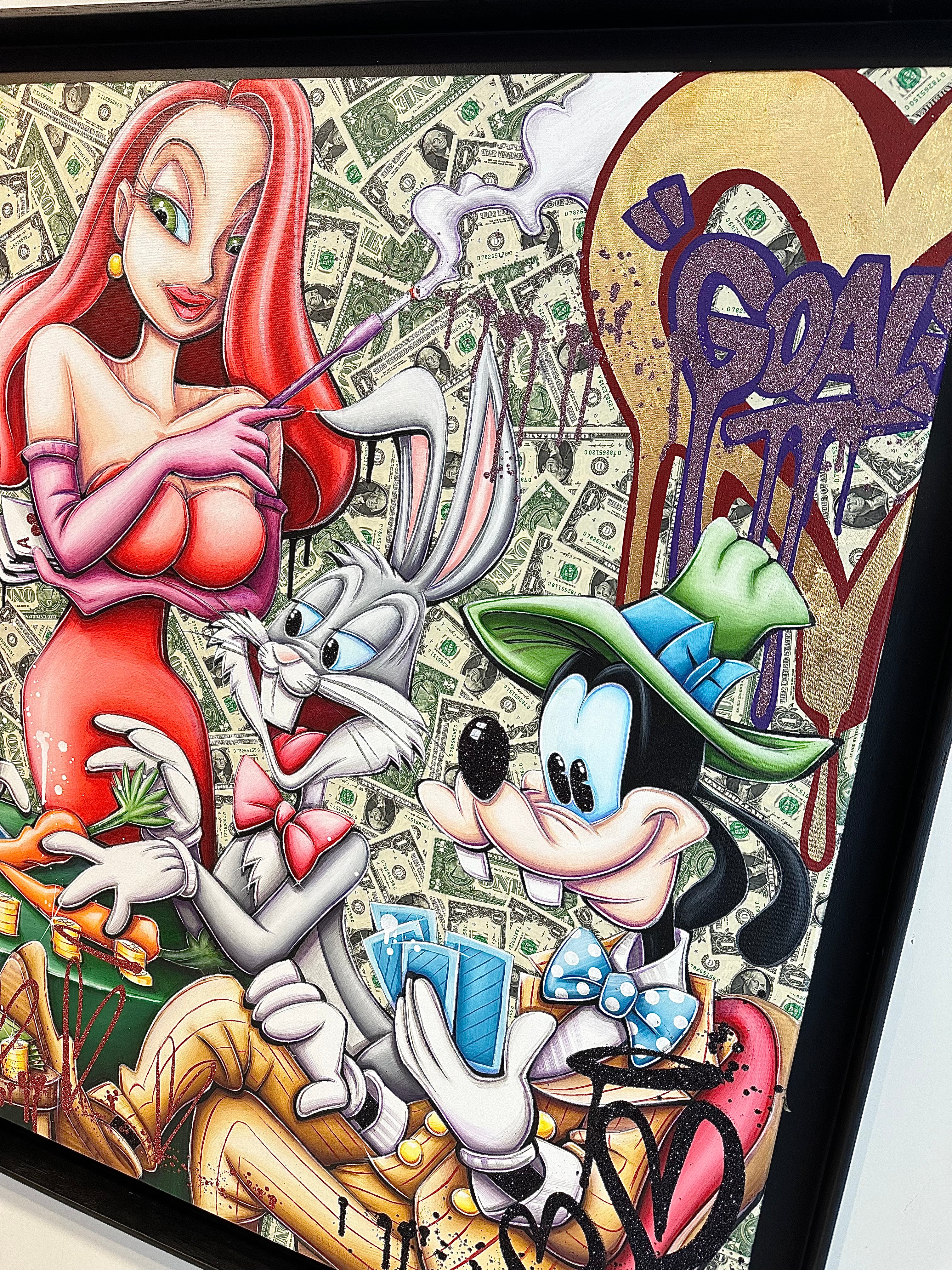 A common thread running through his paintings are the subjects of money and love, often illustrated by popular cartoon characters.