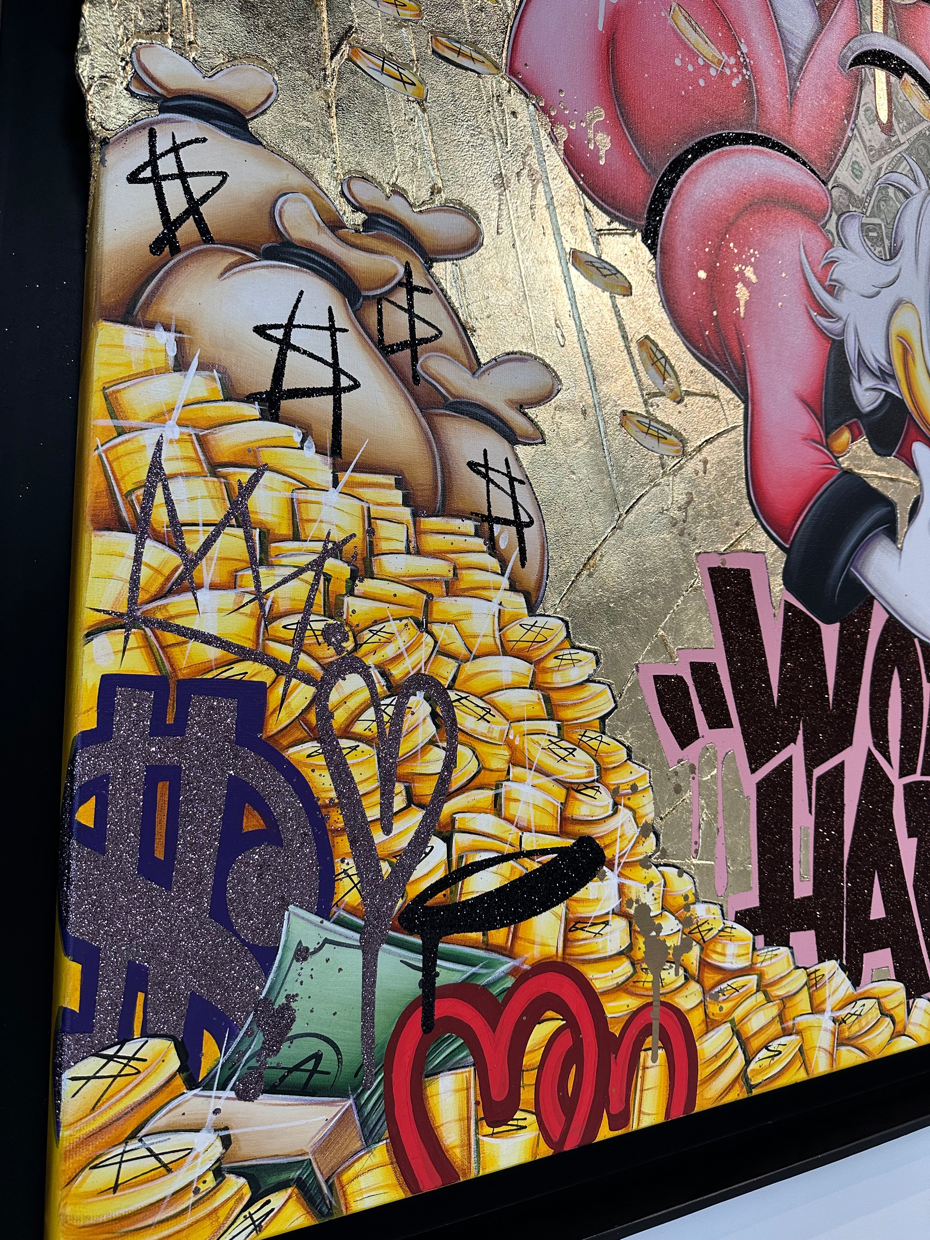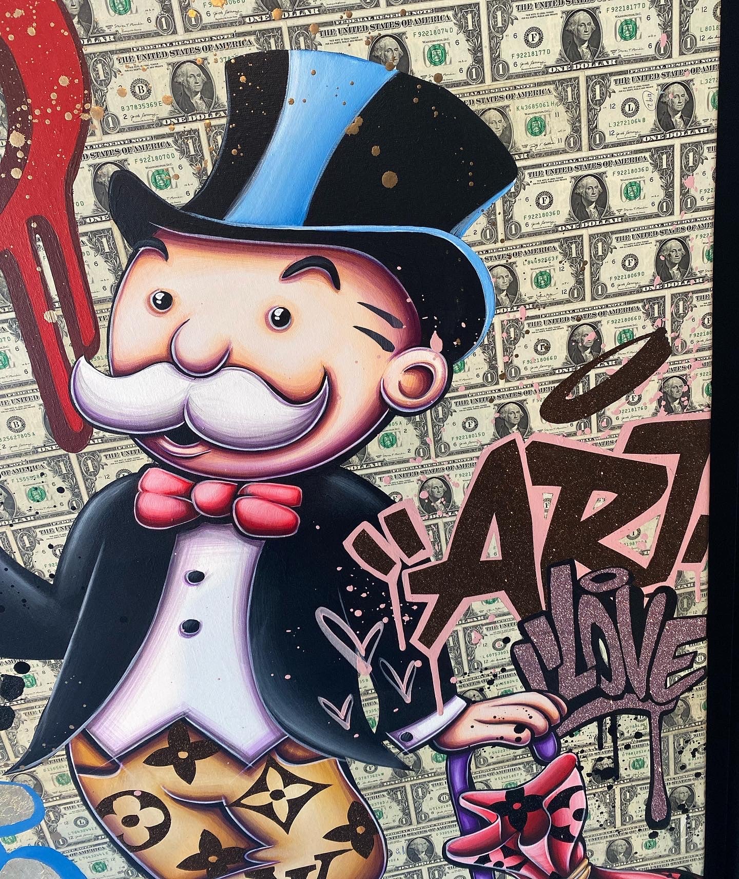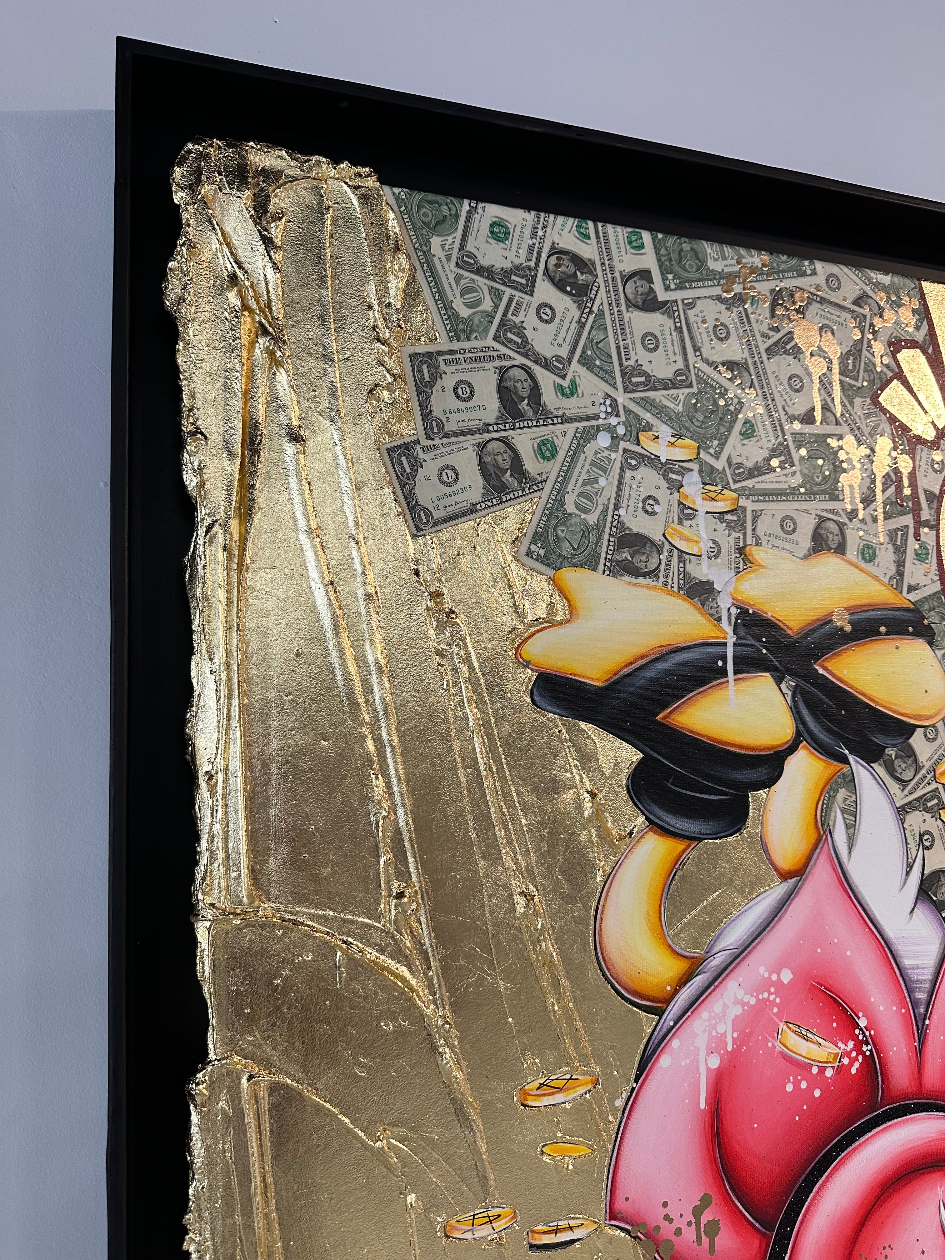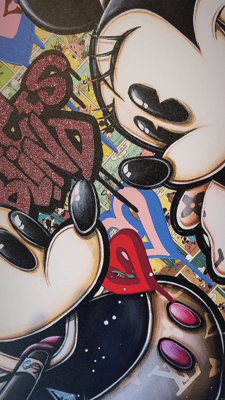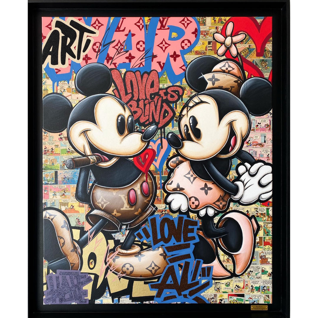A common thread running through his paintings are the subjects of money and love, often illustrated by popular cartoon characters.