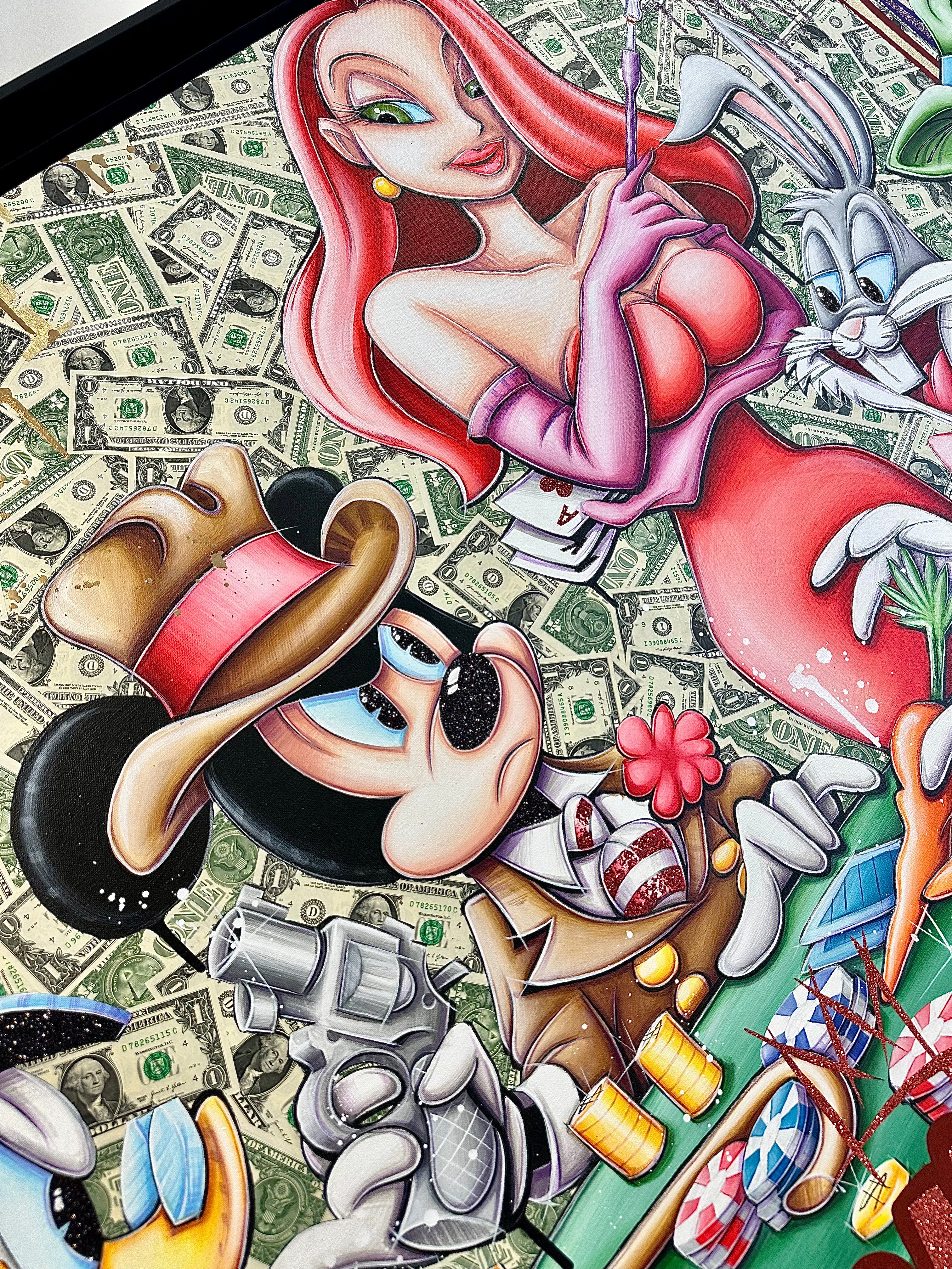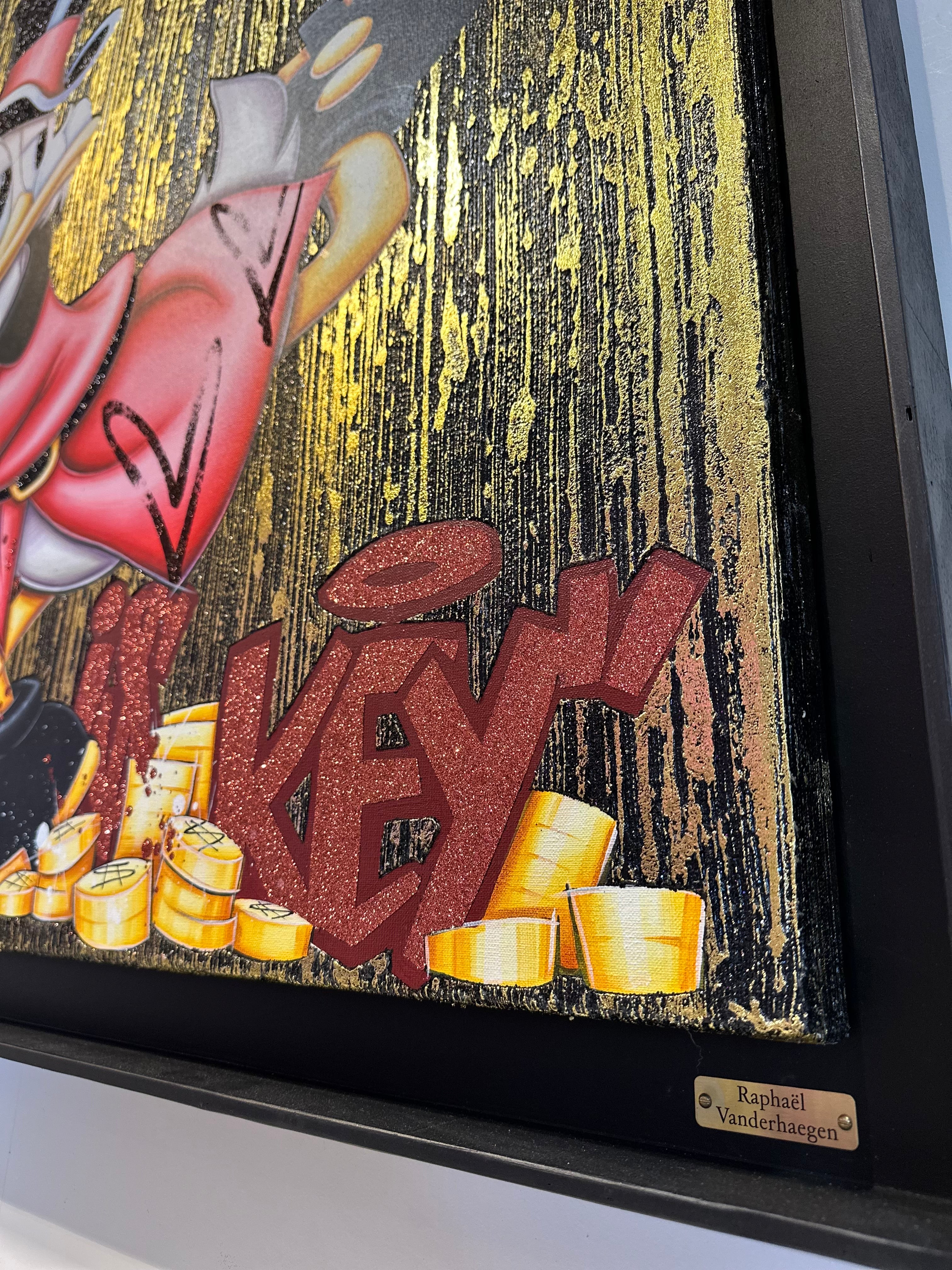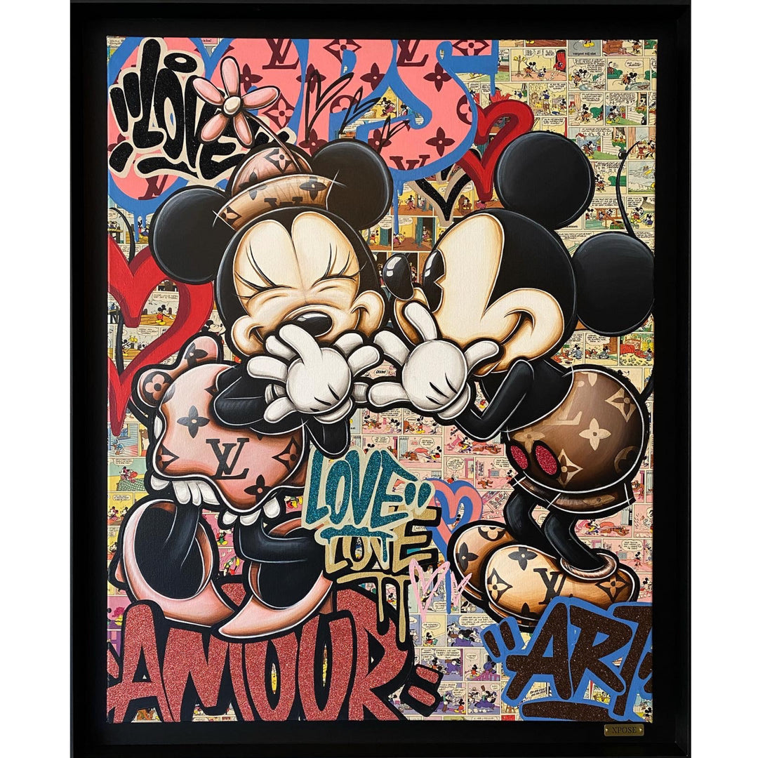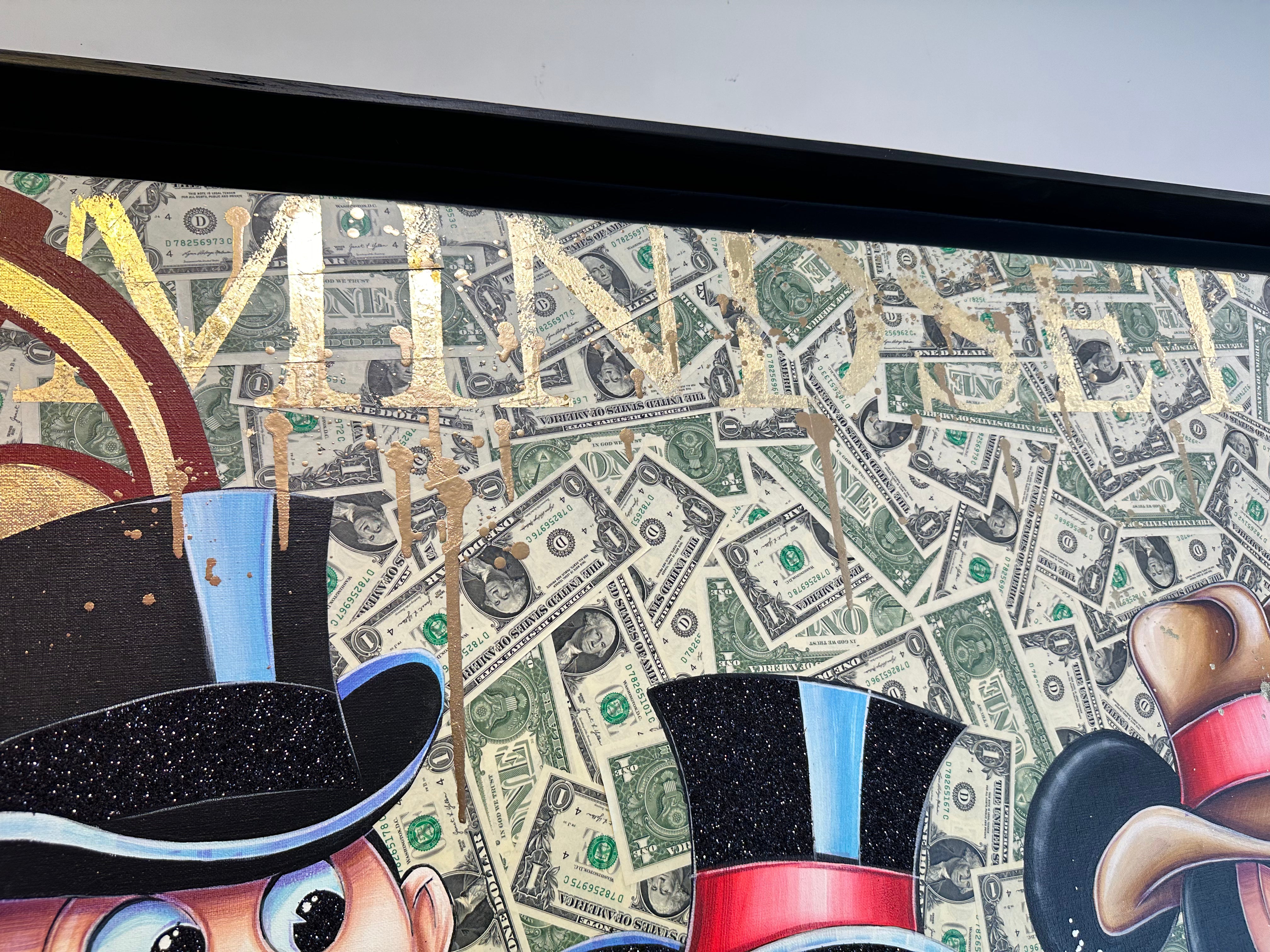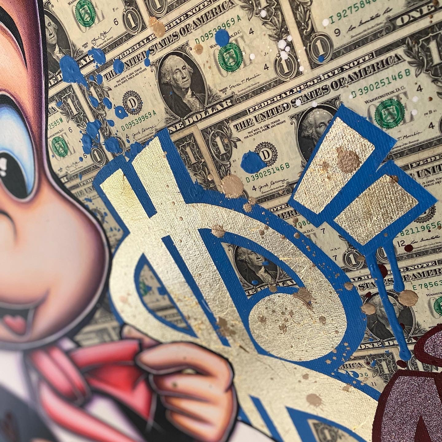 A common thread running through his paintings are the subjects of money and love, often illustrated by popular cartoon characters.