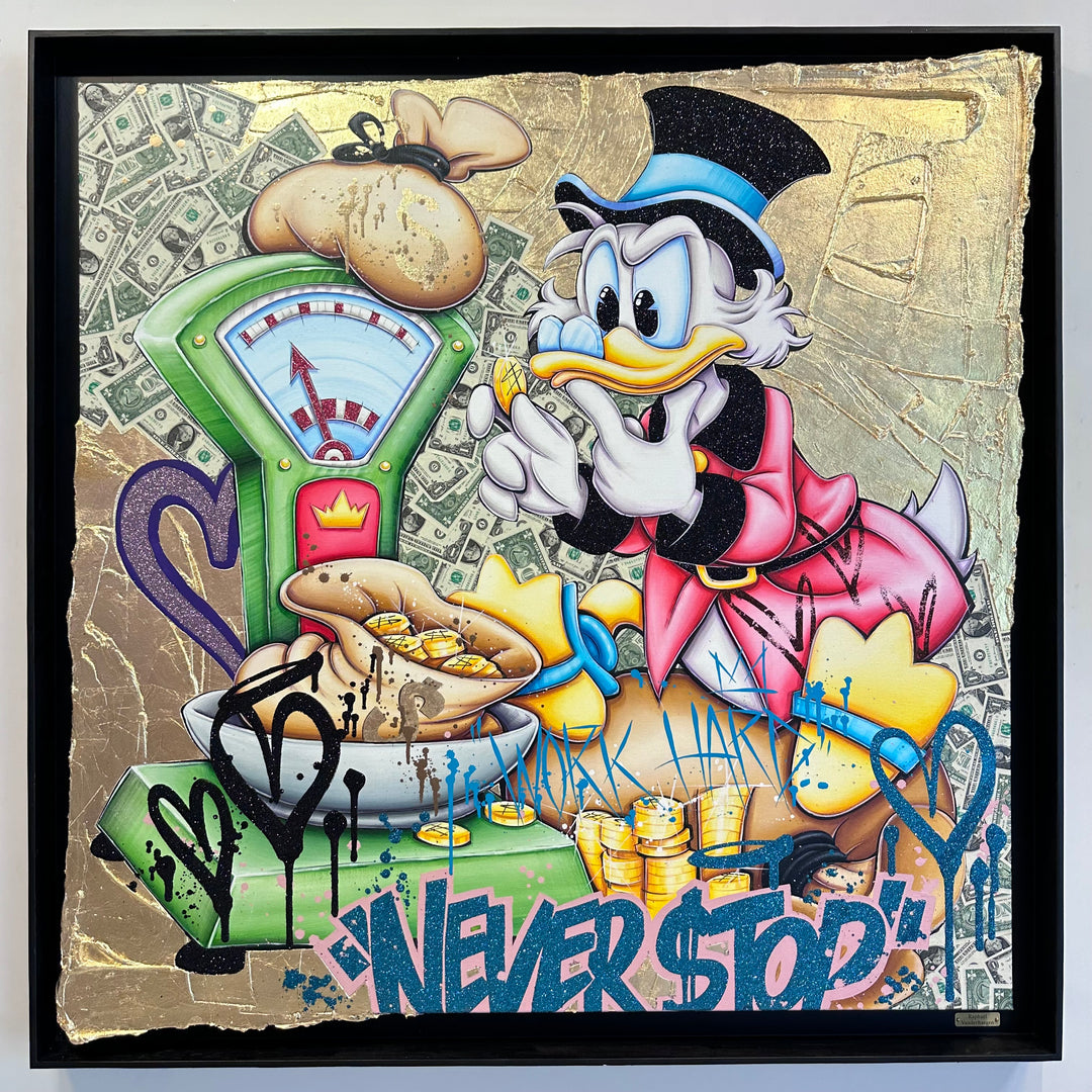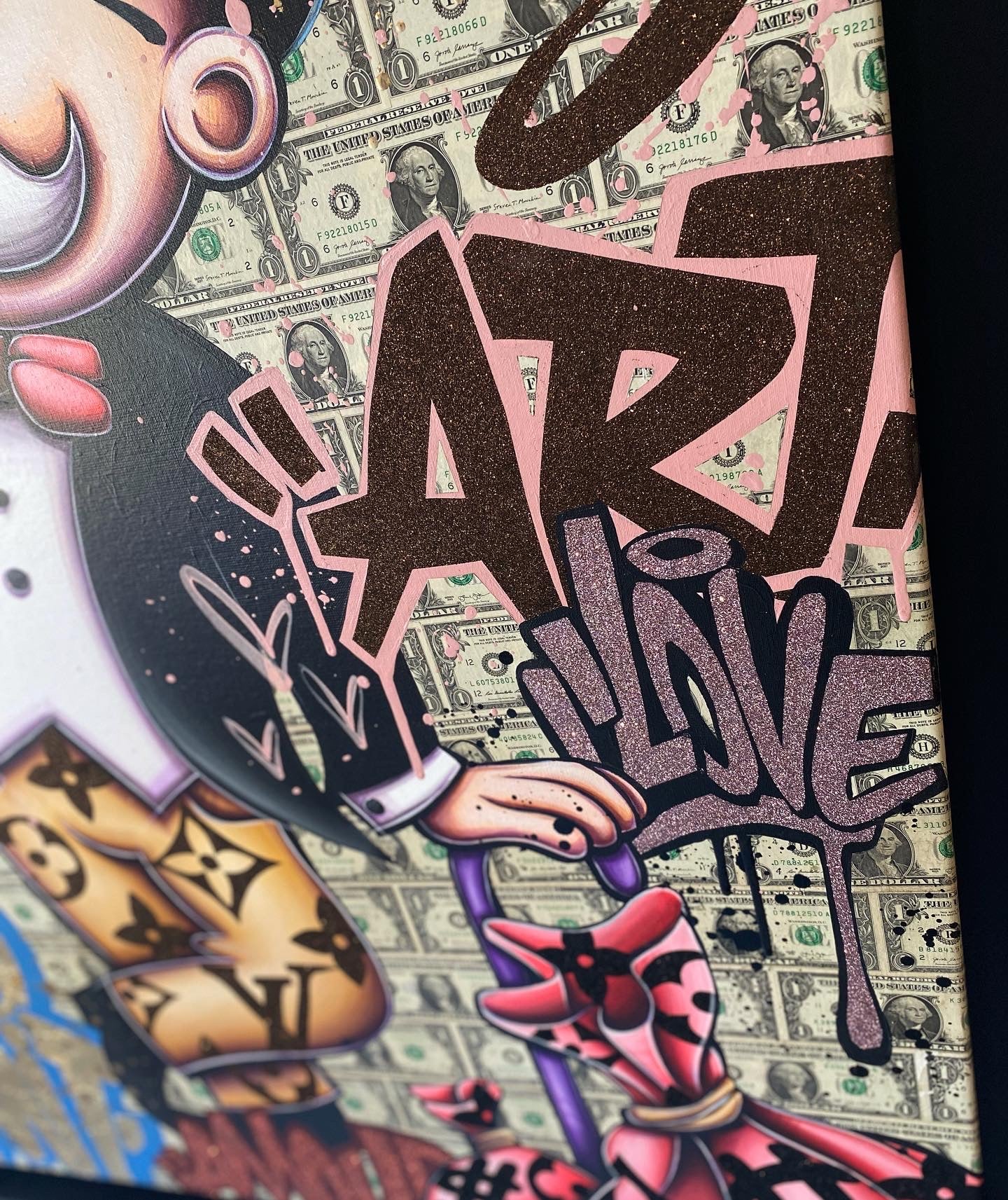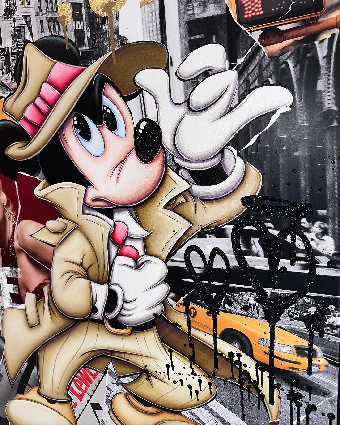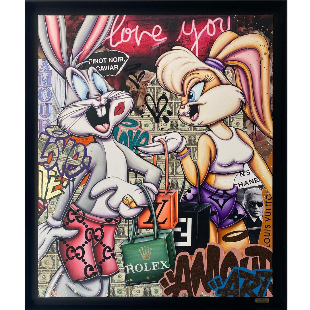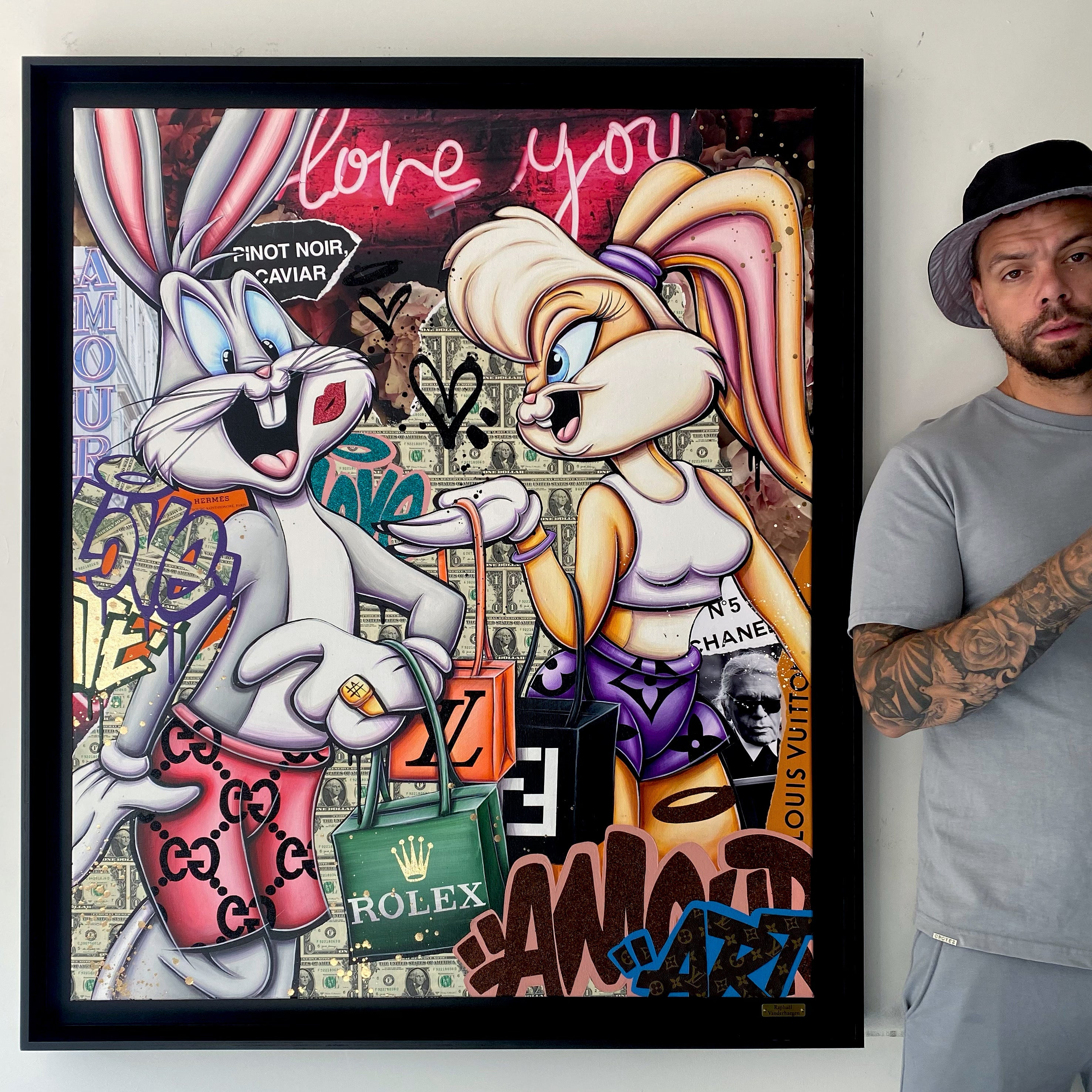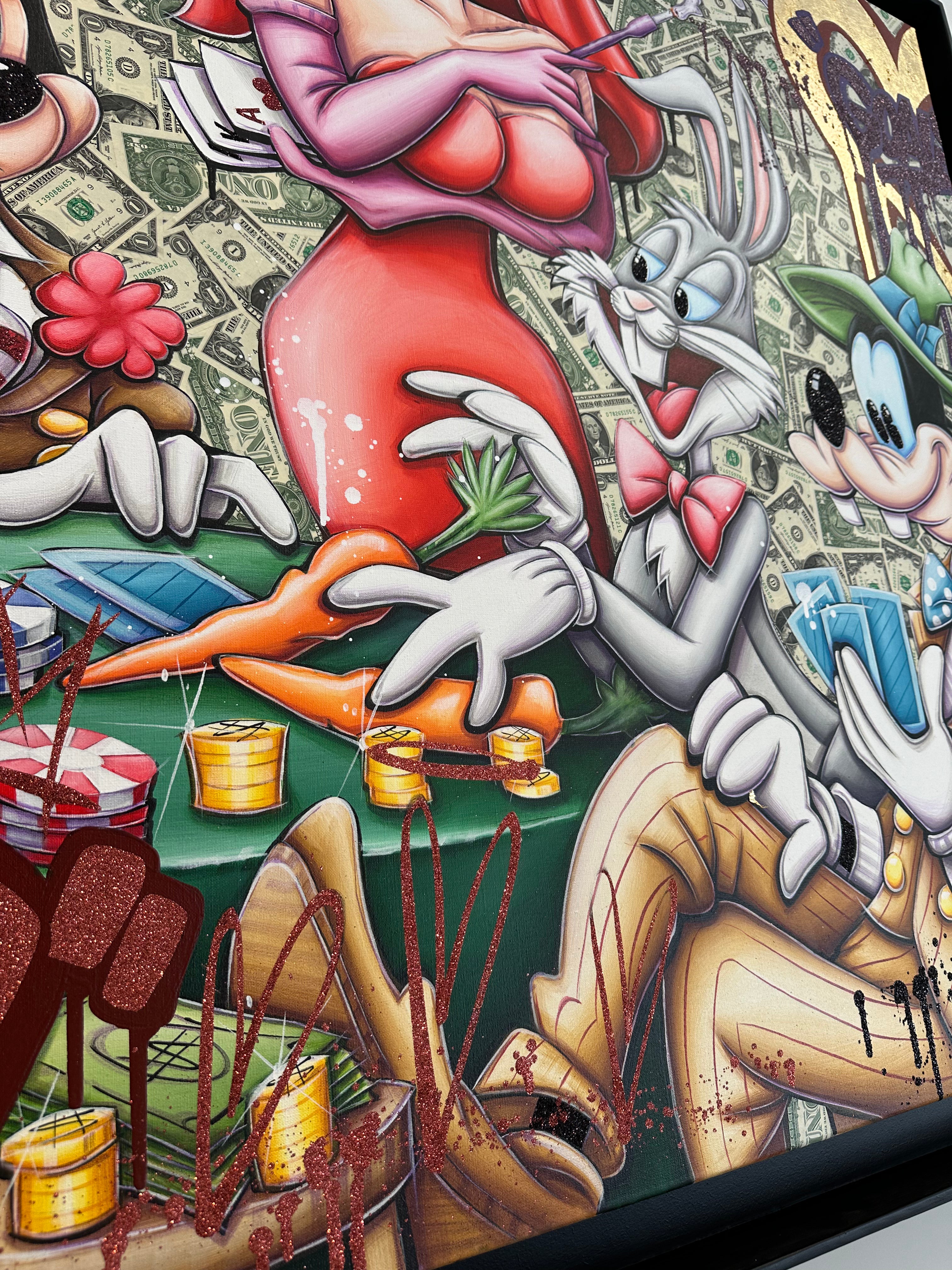 A common thread running through his paintings are the subjects of money and love, often illustrated by popular cartoon characters.