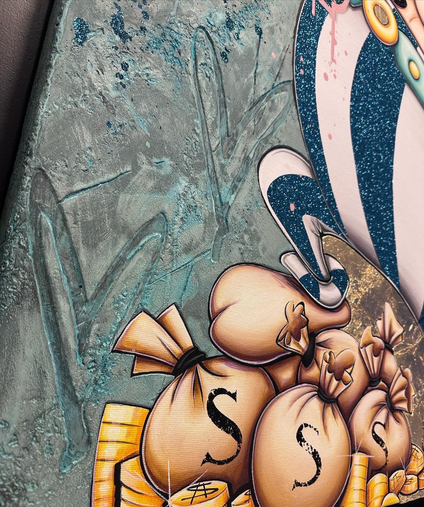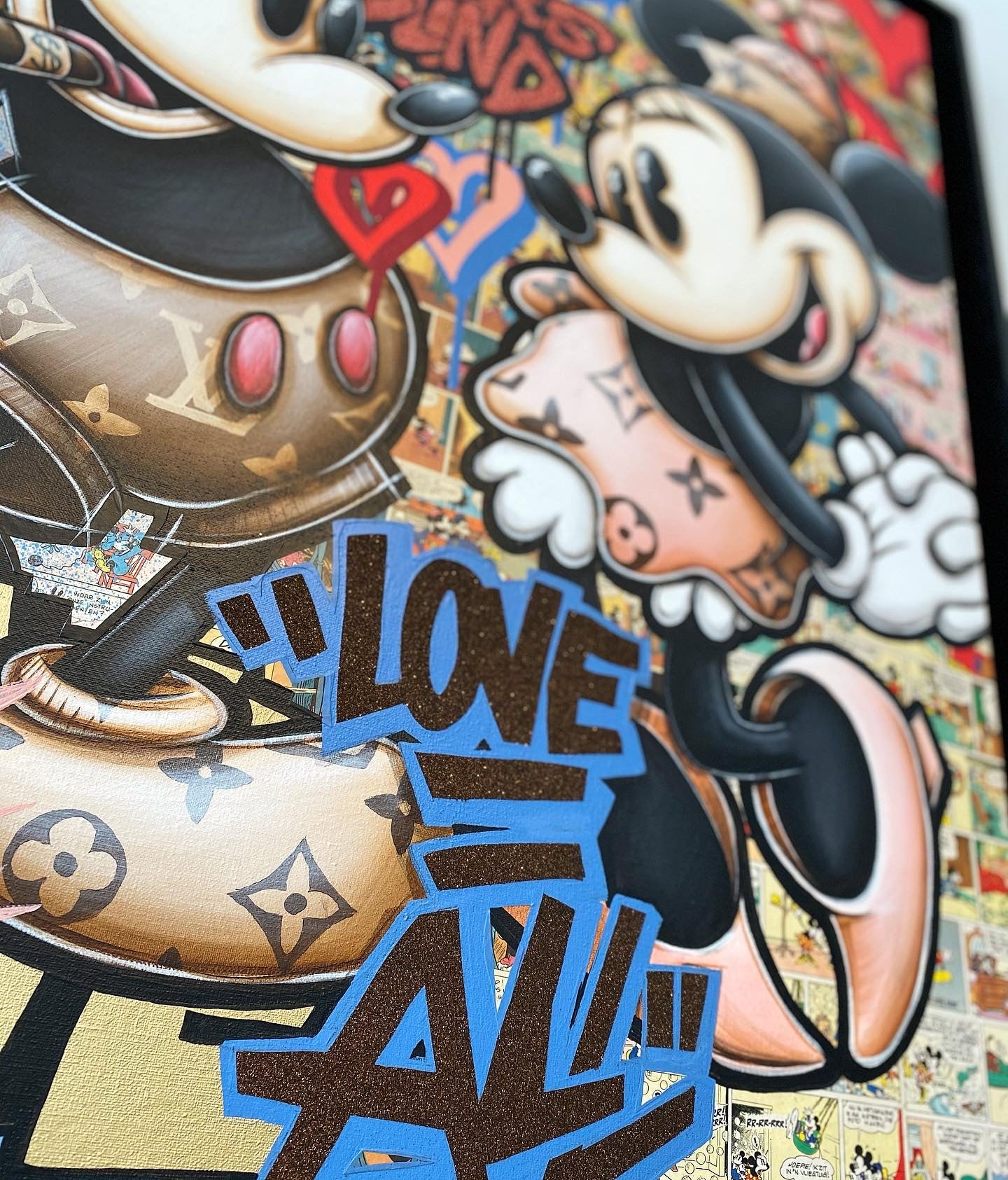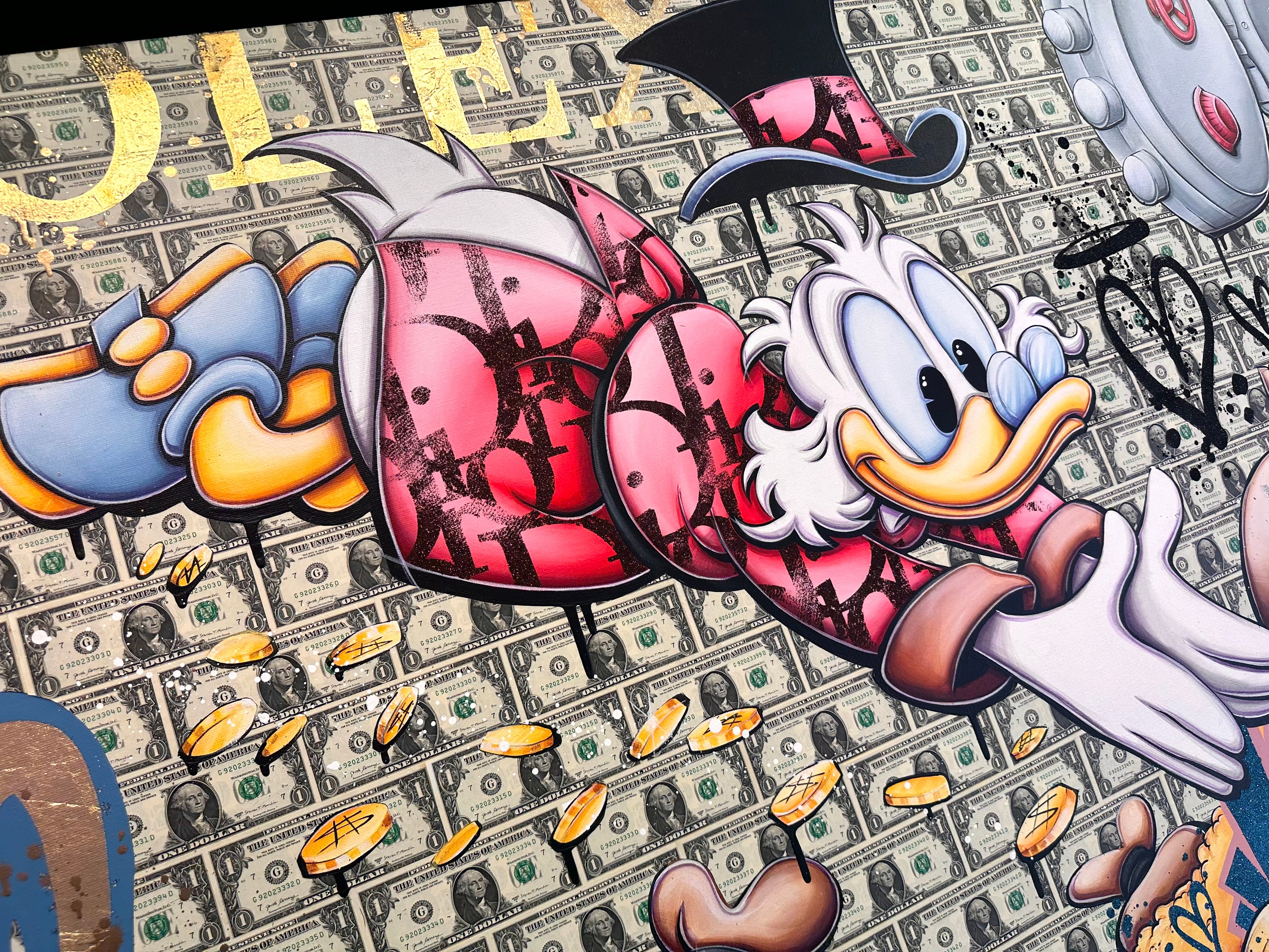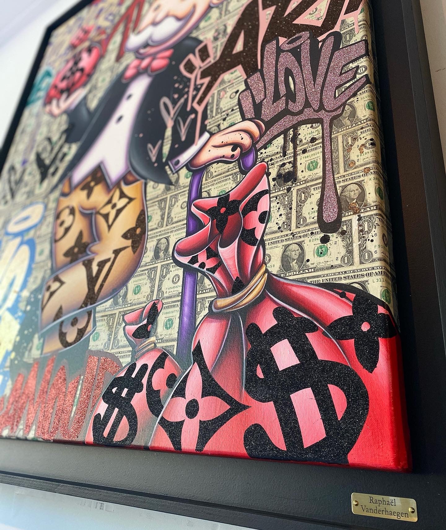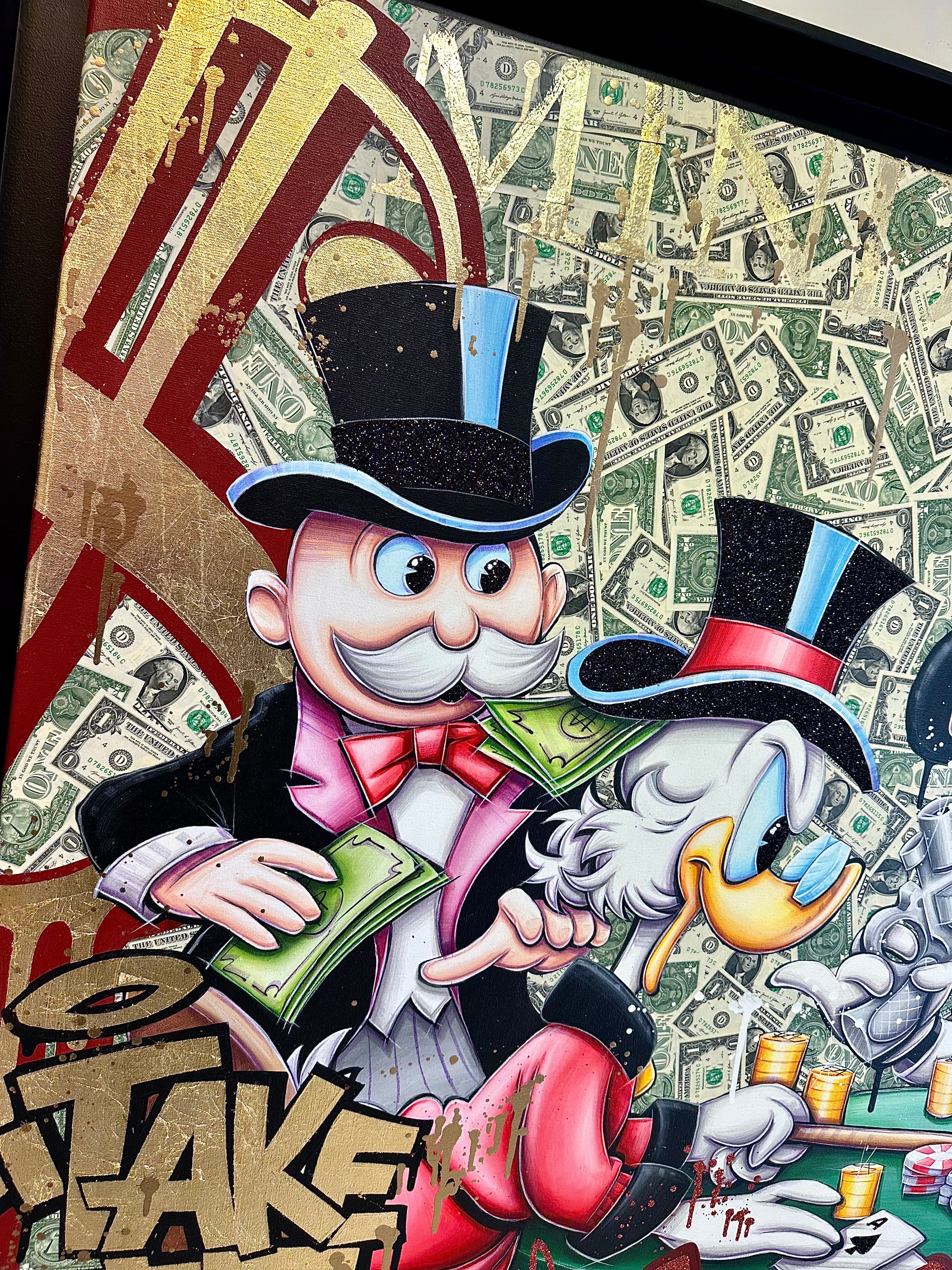 A common thread running through his paintings are the subjects of money and love, often illustrated by popular cartoon characters.