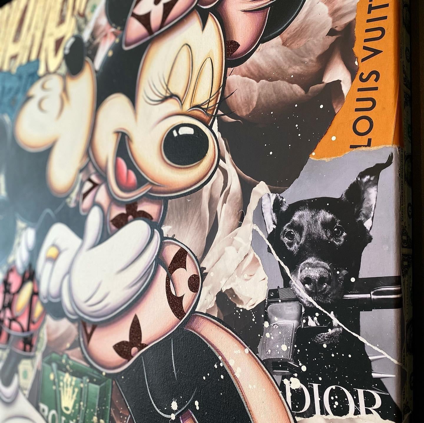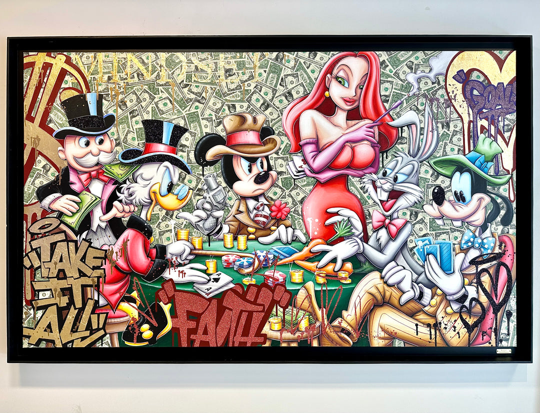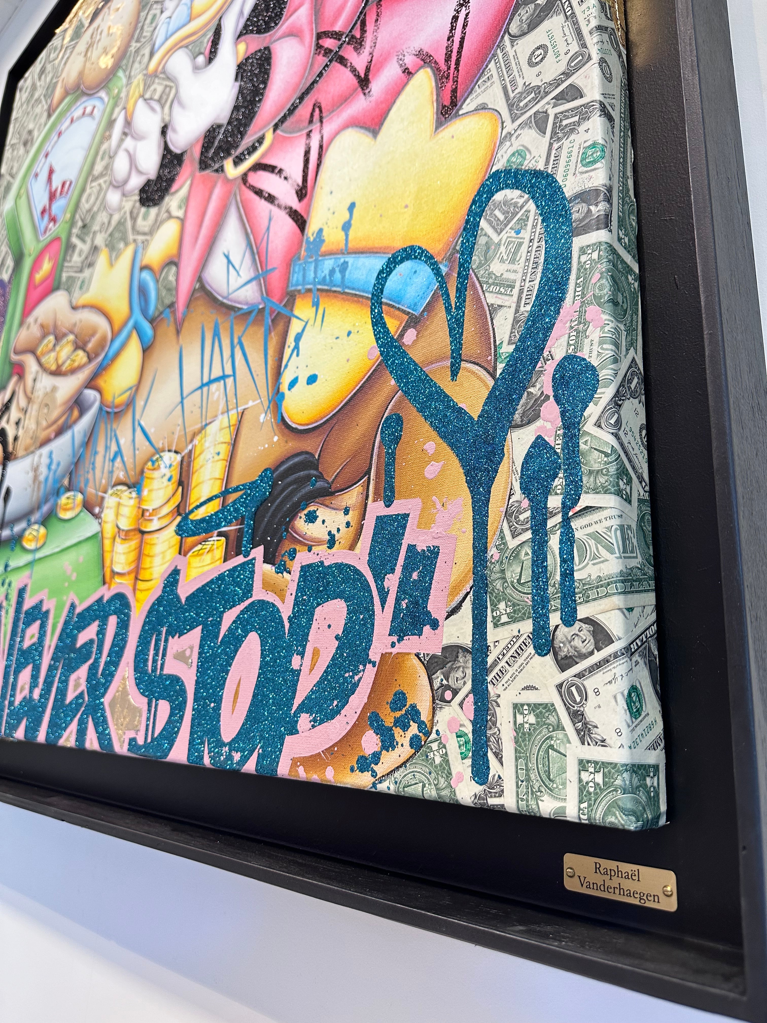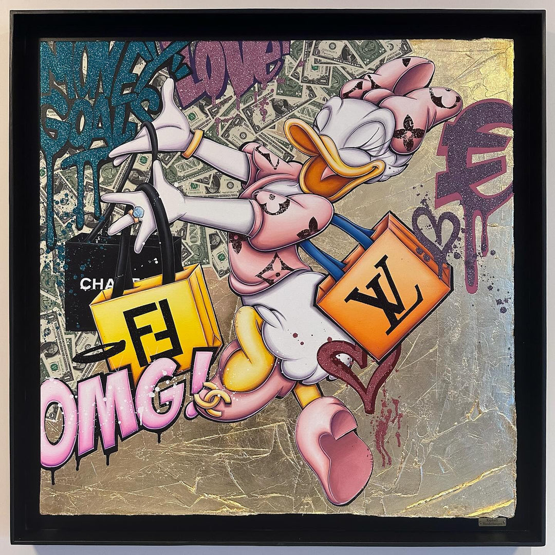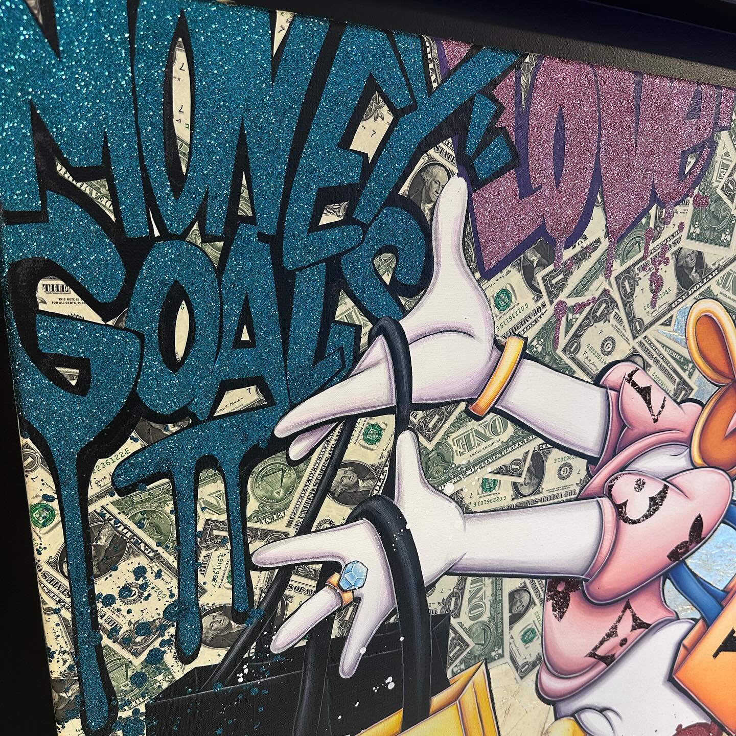A common thread running through his paintings are the subjects of money and love, often illustrated by popular cartoon characters.