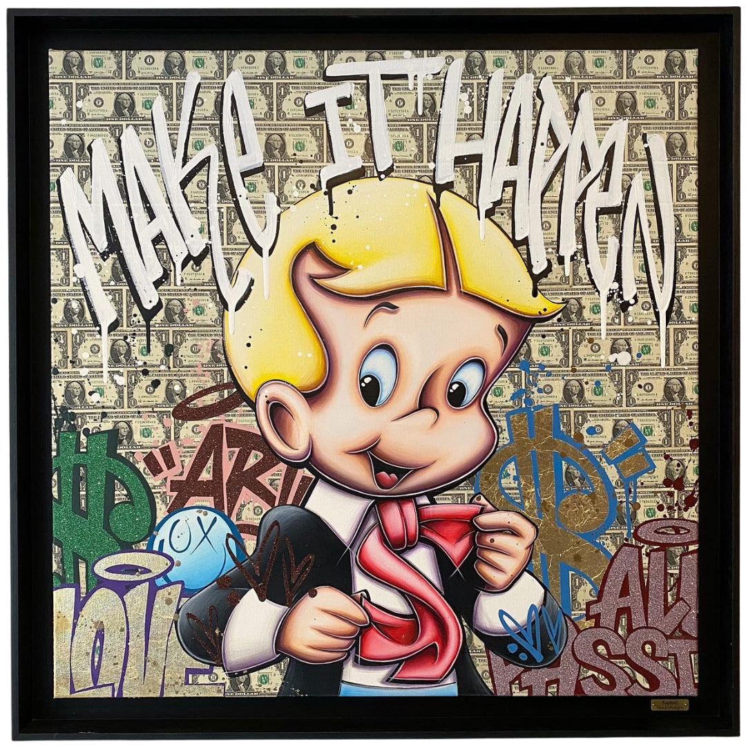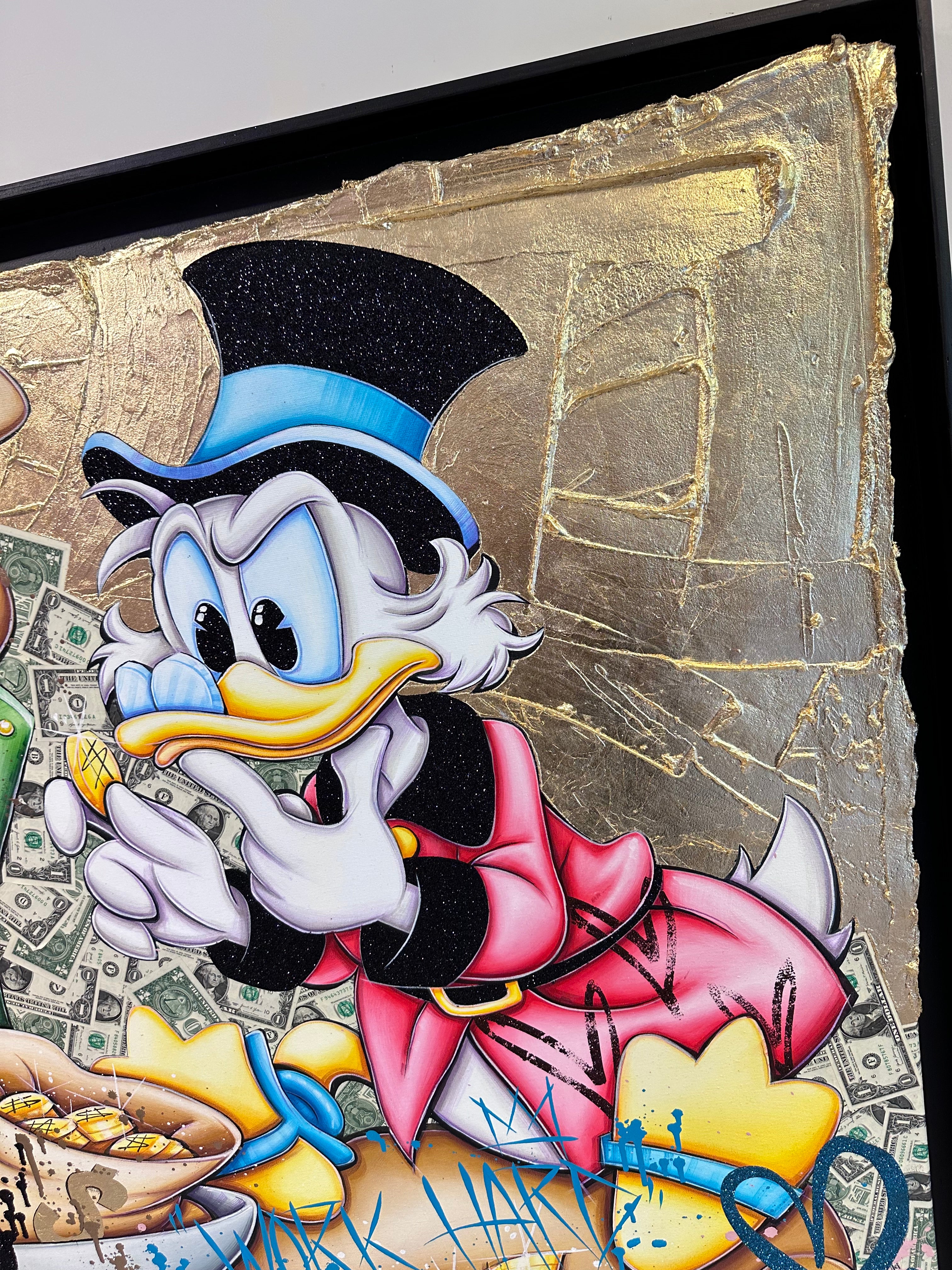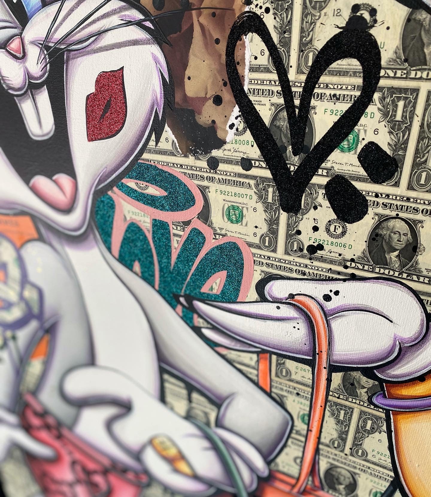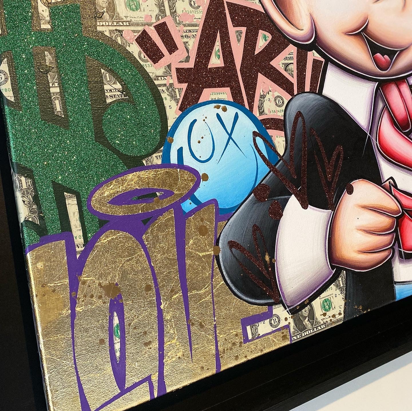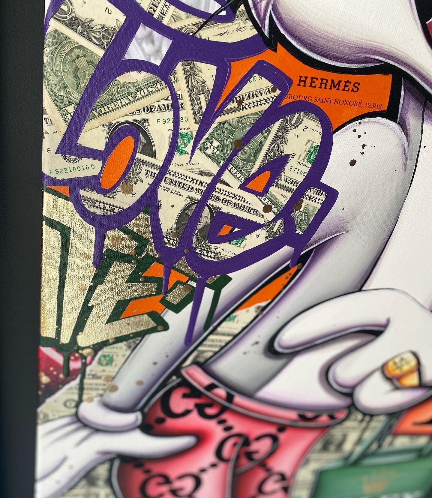 A common thread running through his paintings are the subjects of money and love, often illustrated by popular cartoon characters.