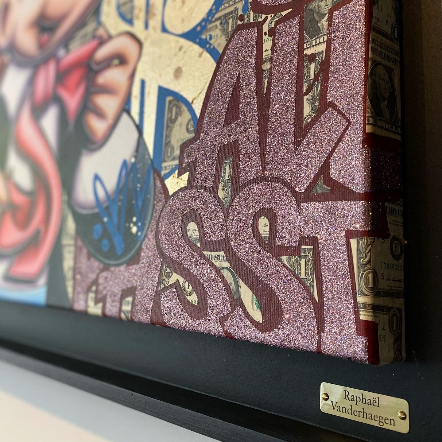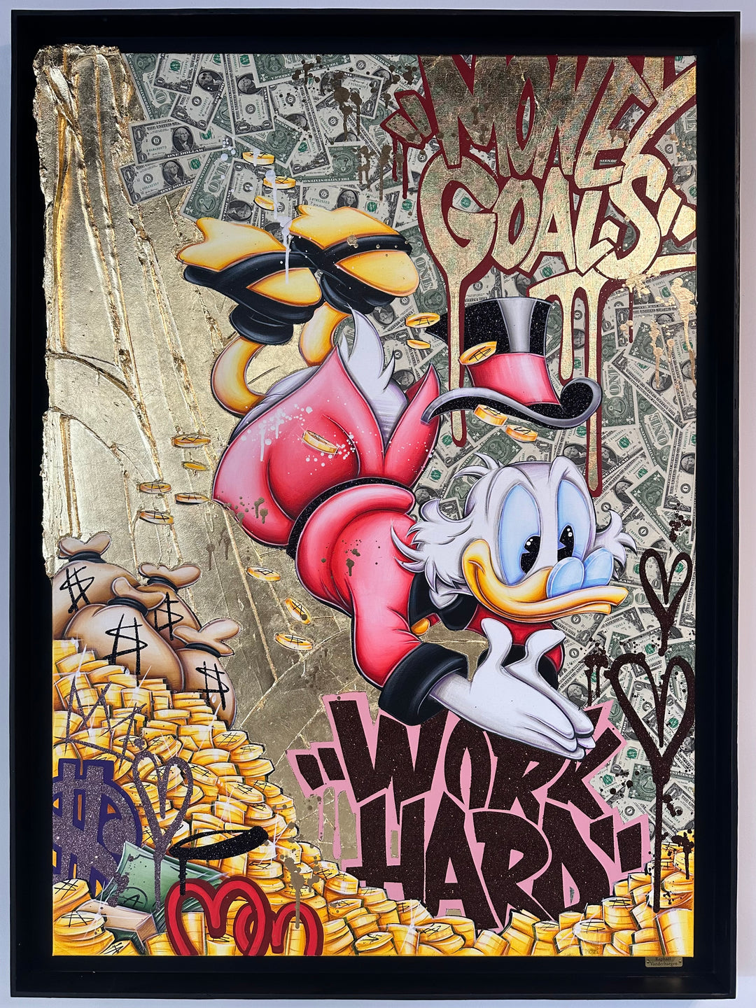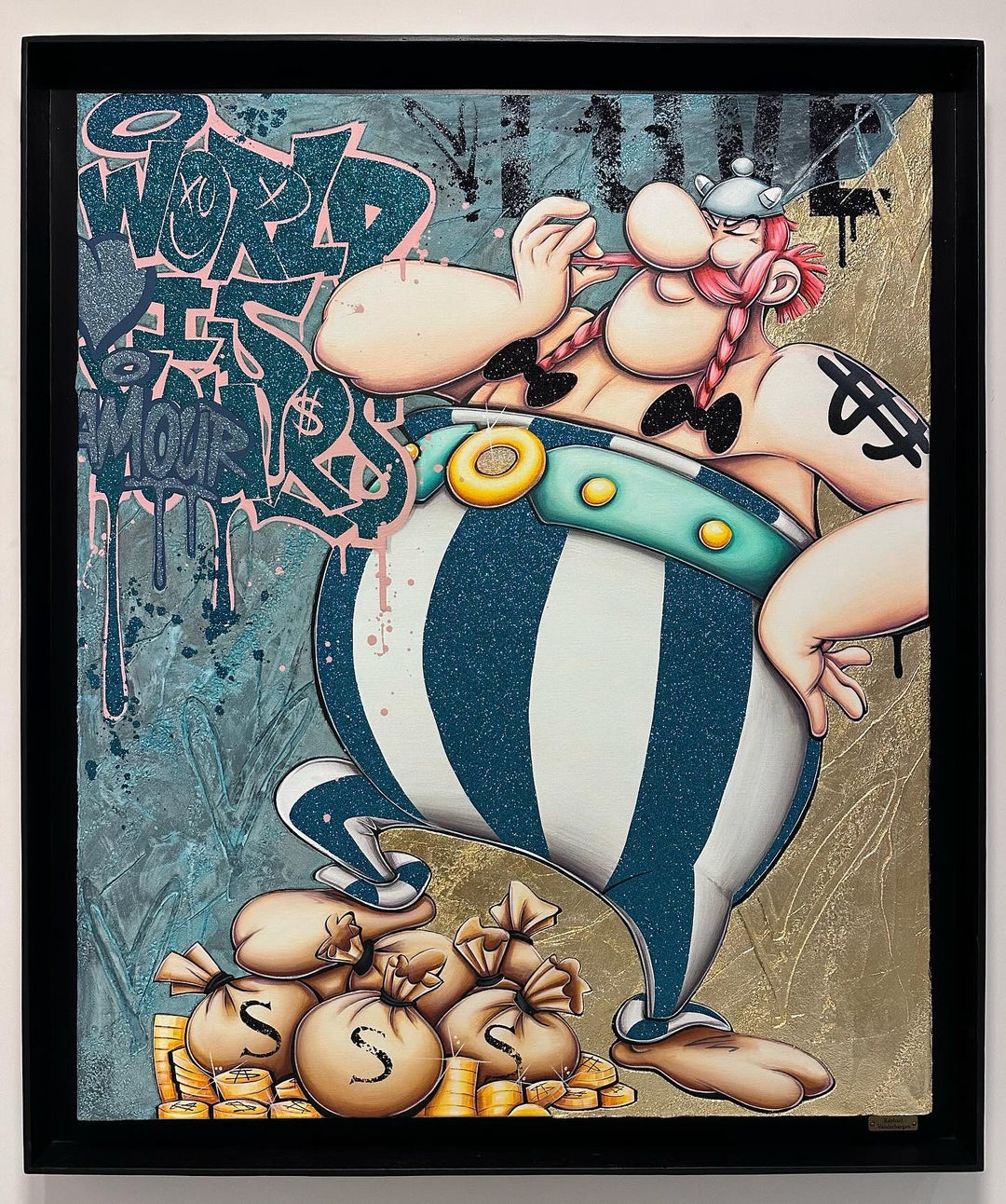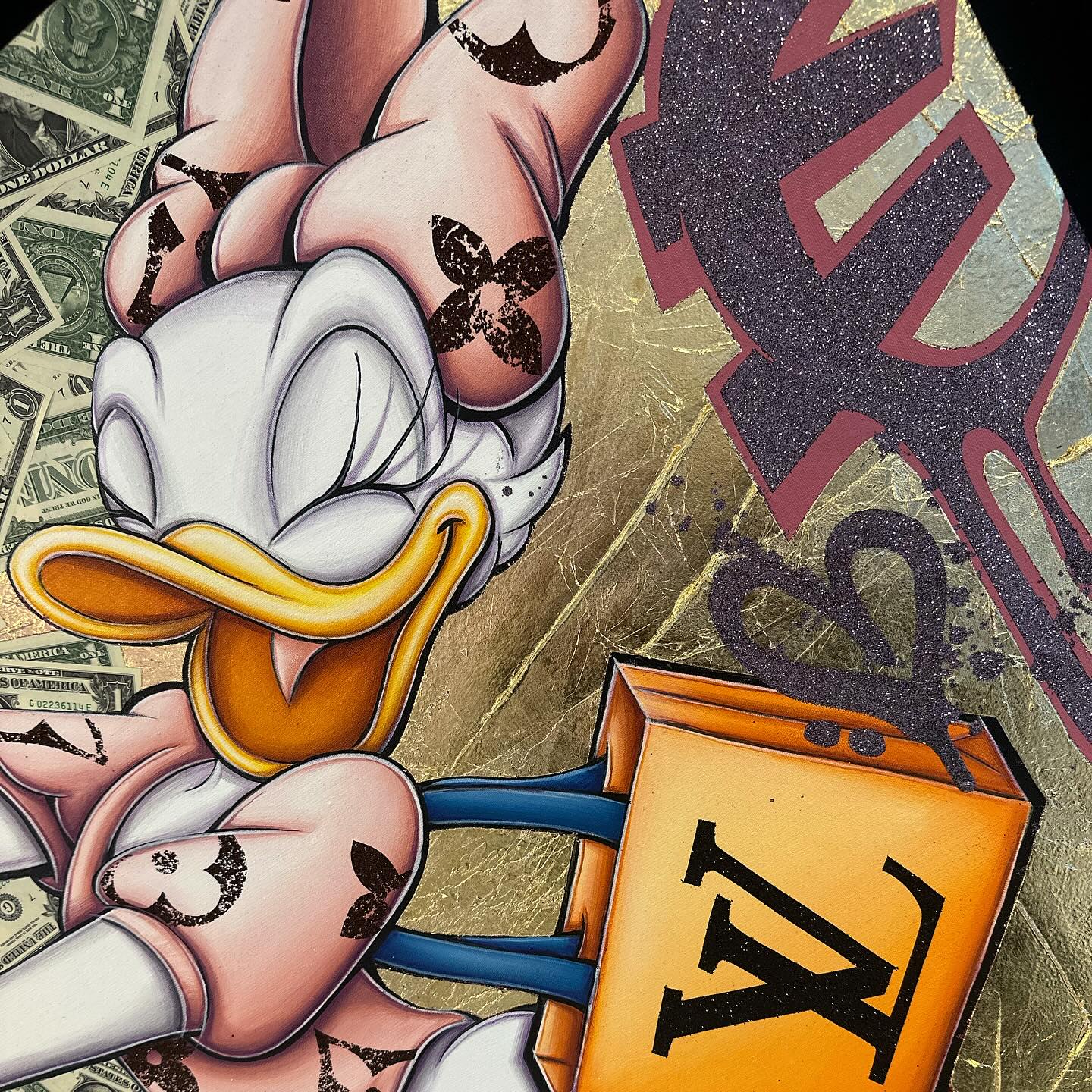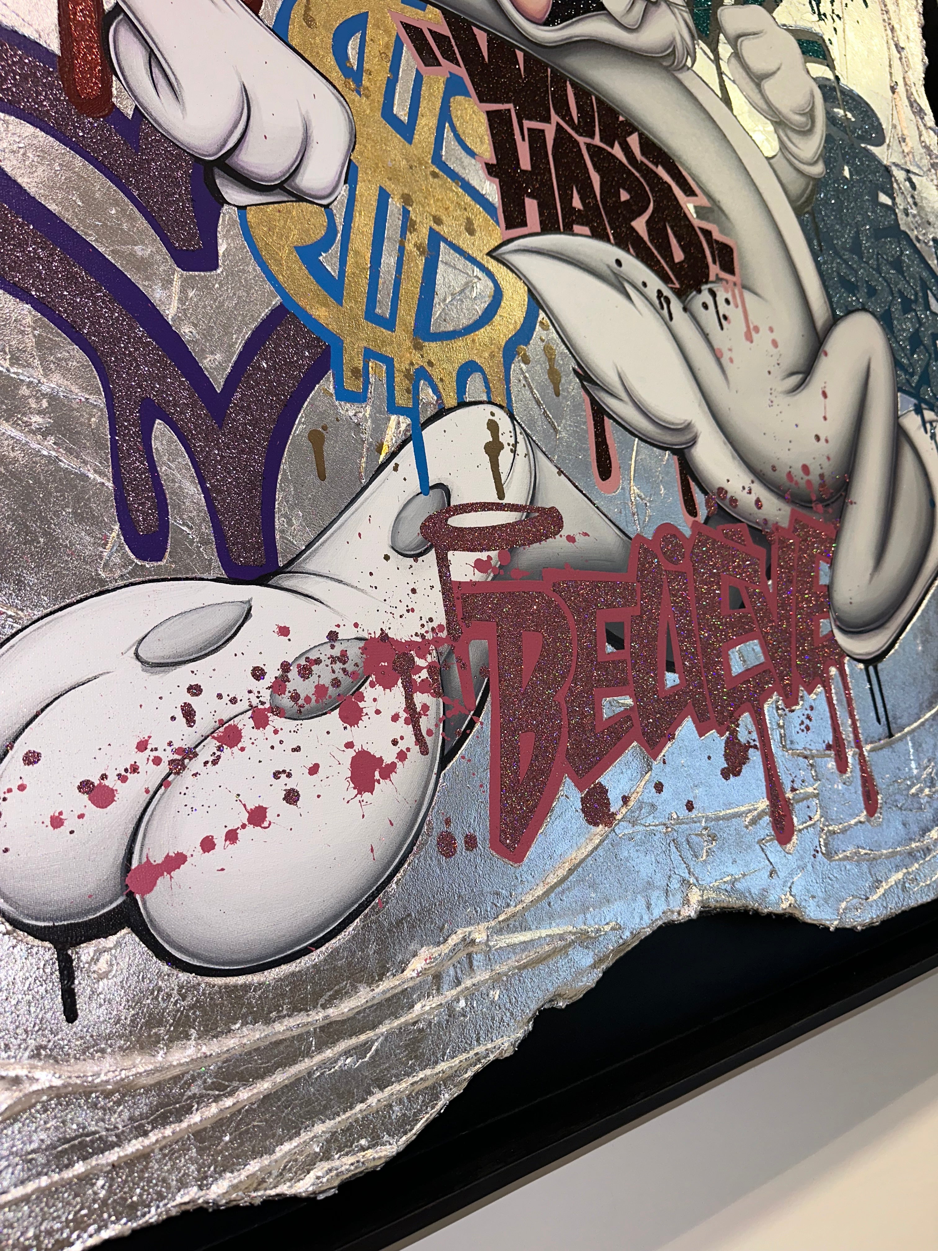 A common thread running through his paintings are the subjects of money and love, often illustrated by popular cartoon characters.