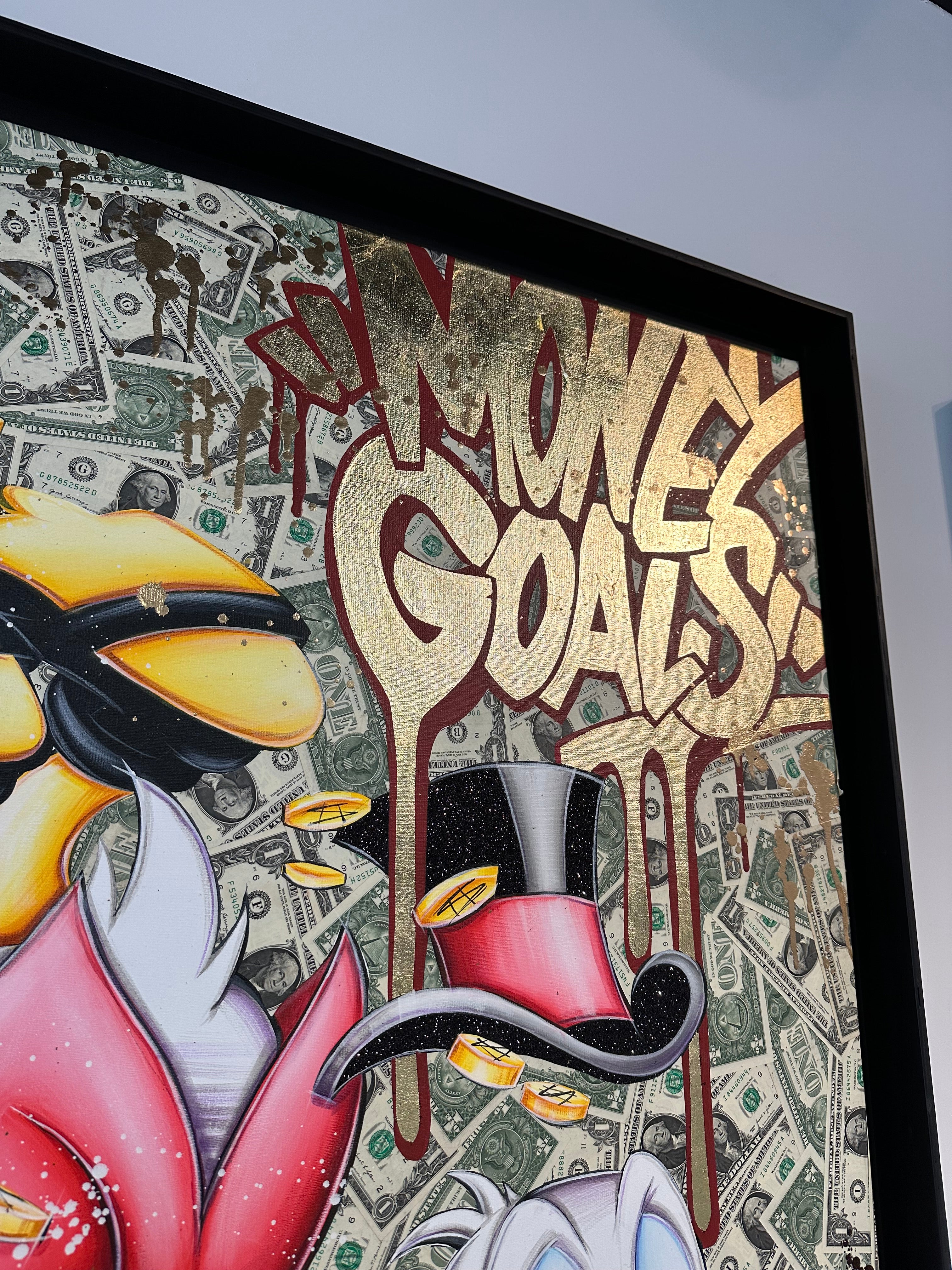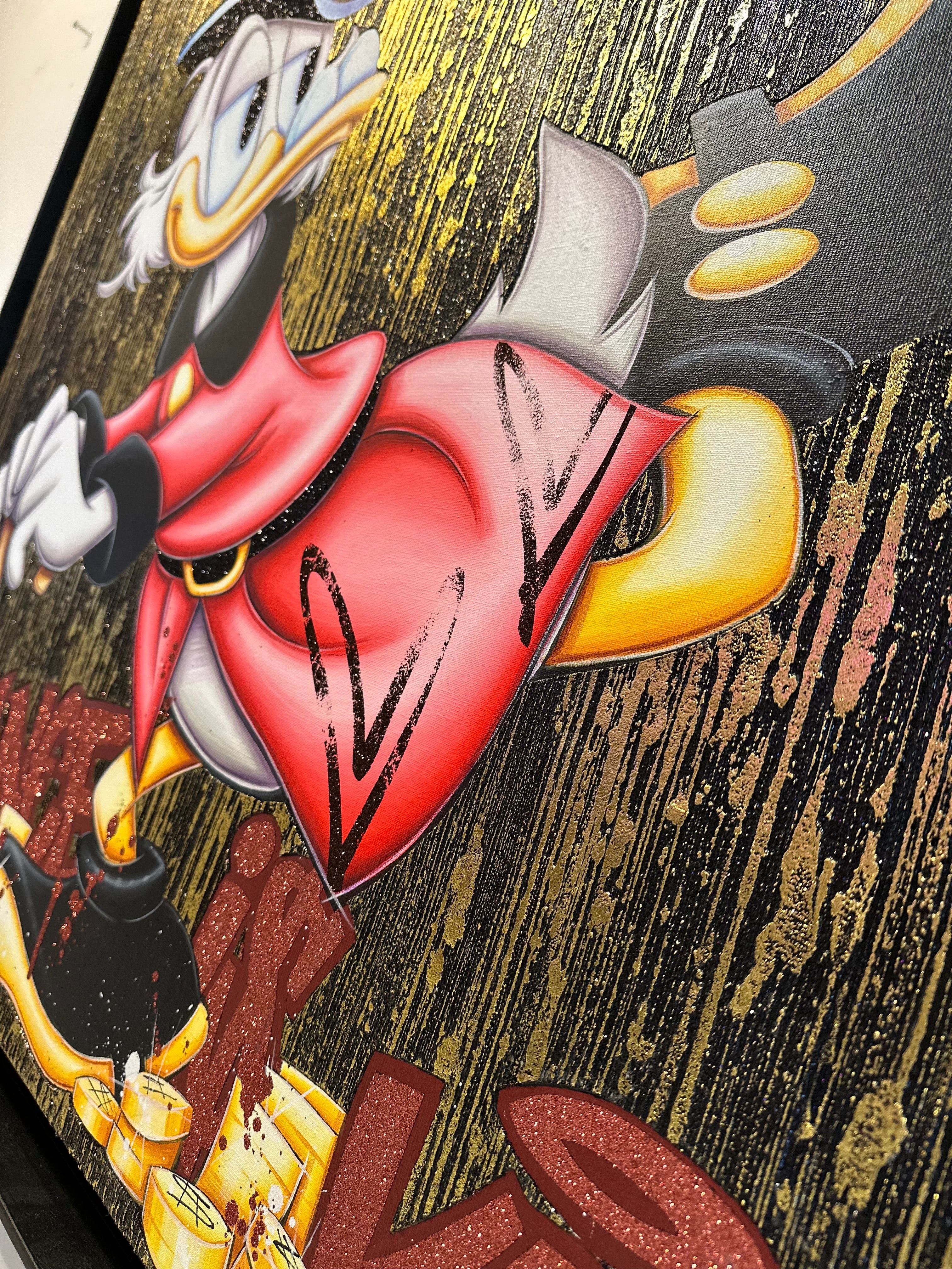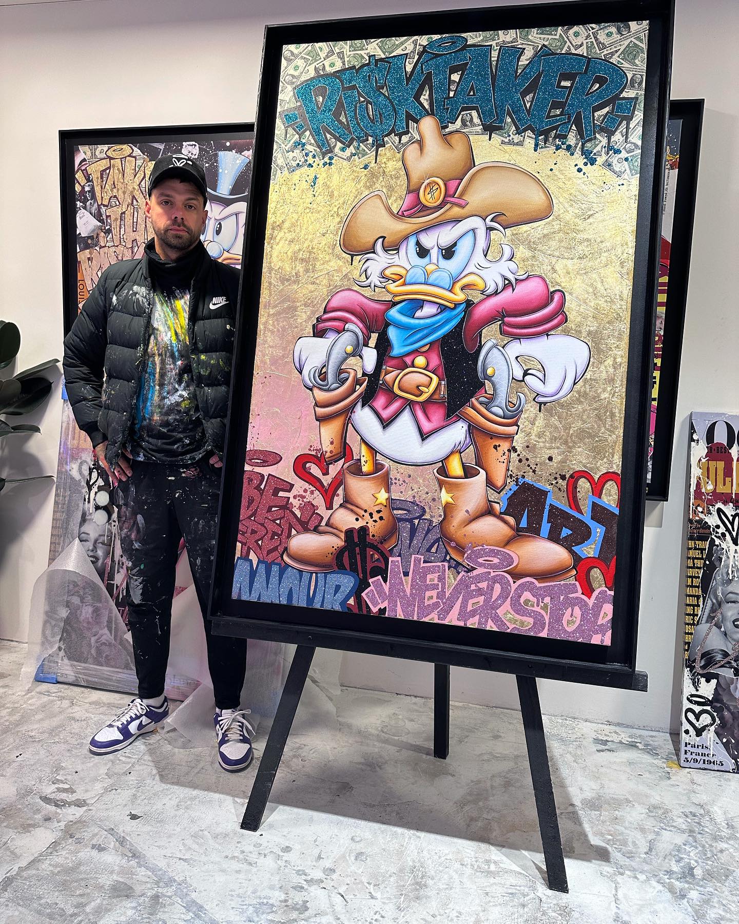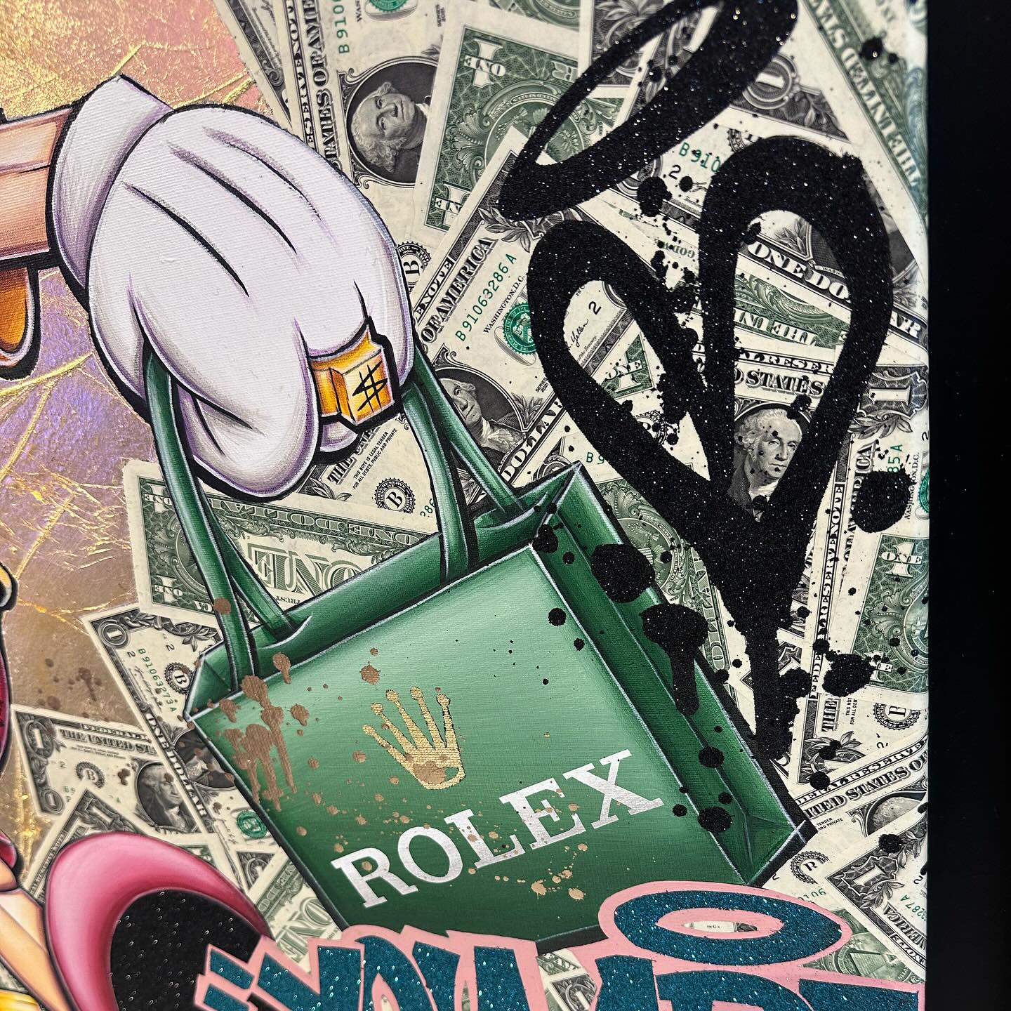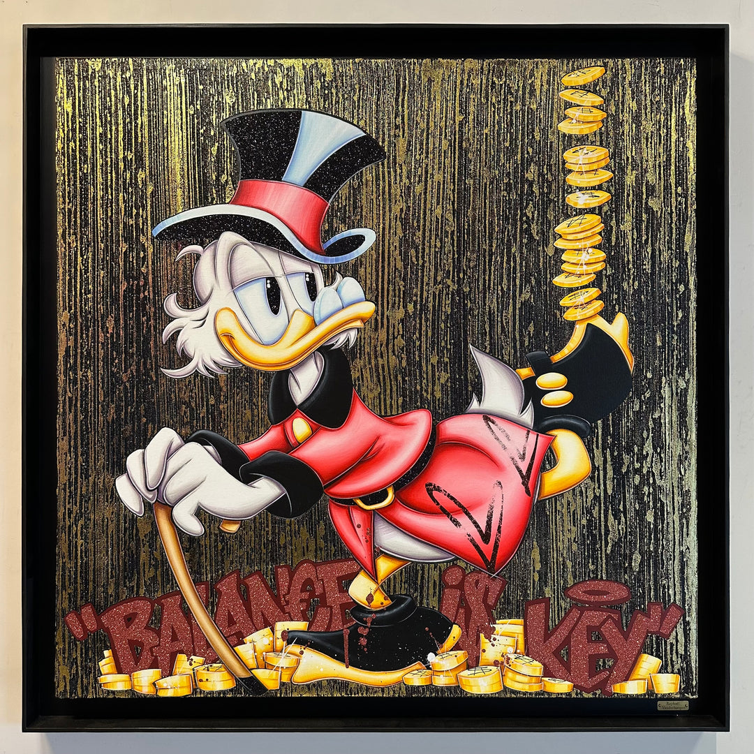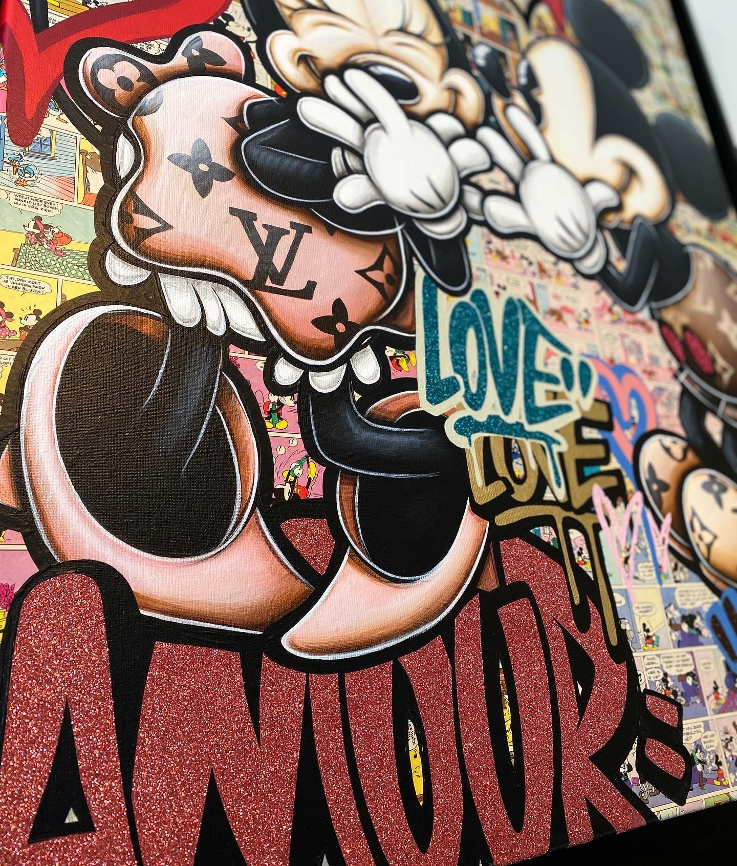 A common thread running through his paintings are the subjects of money and love, often illustrated by popular cartoon characters.