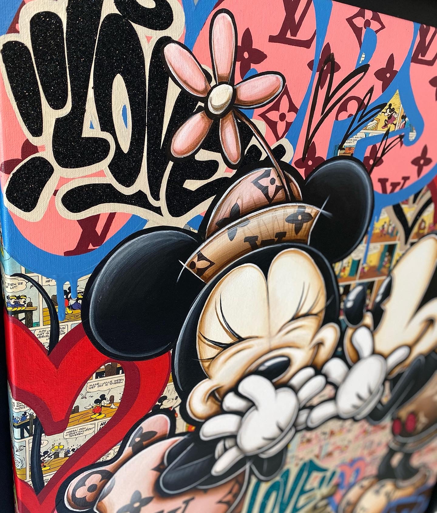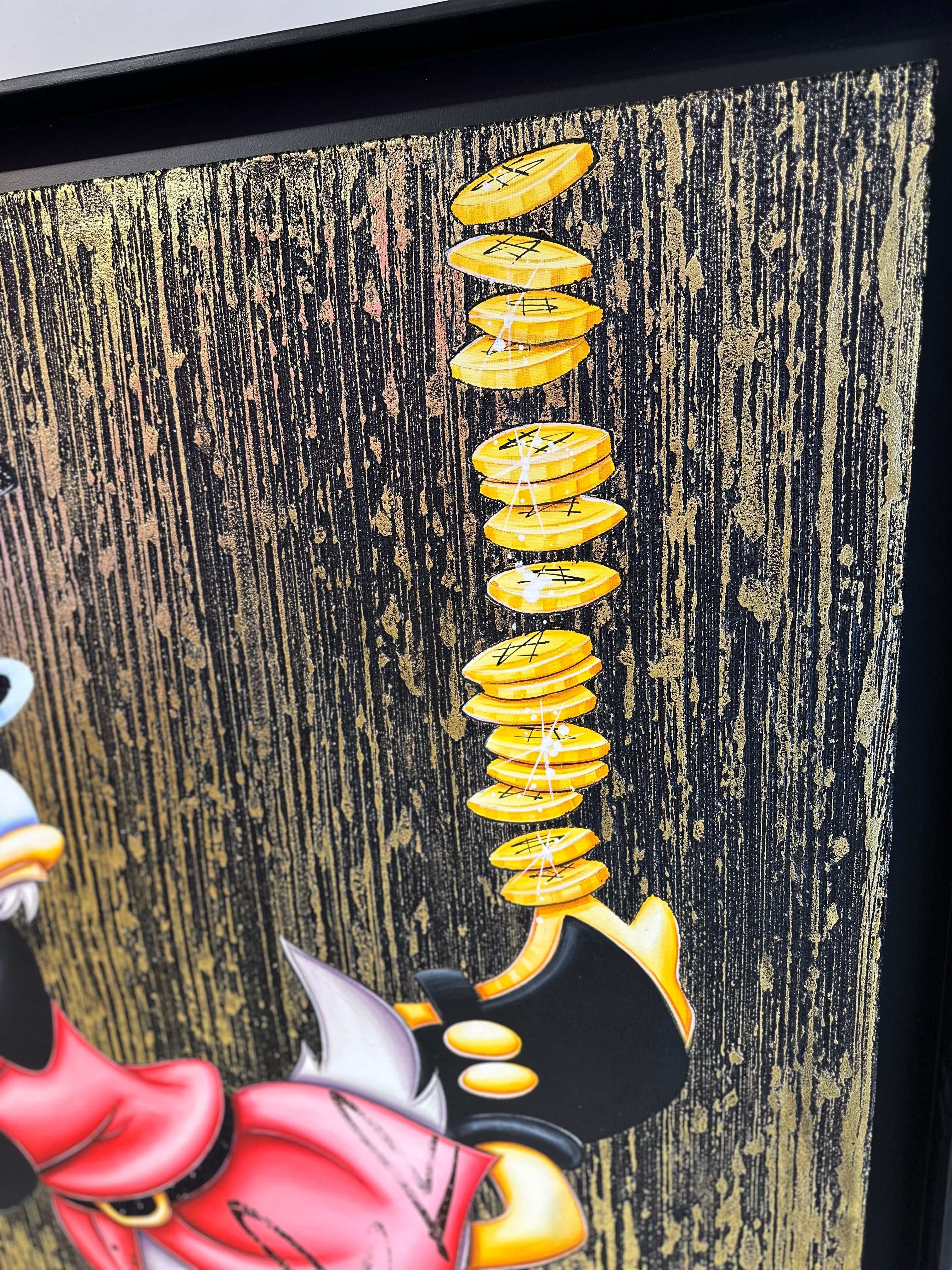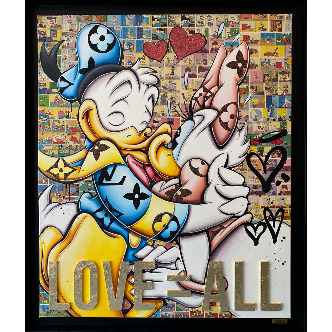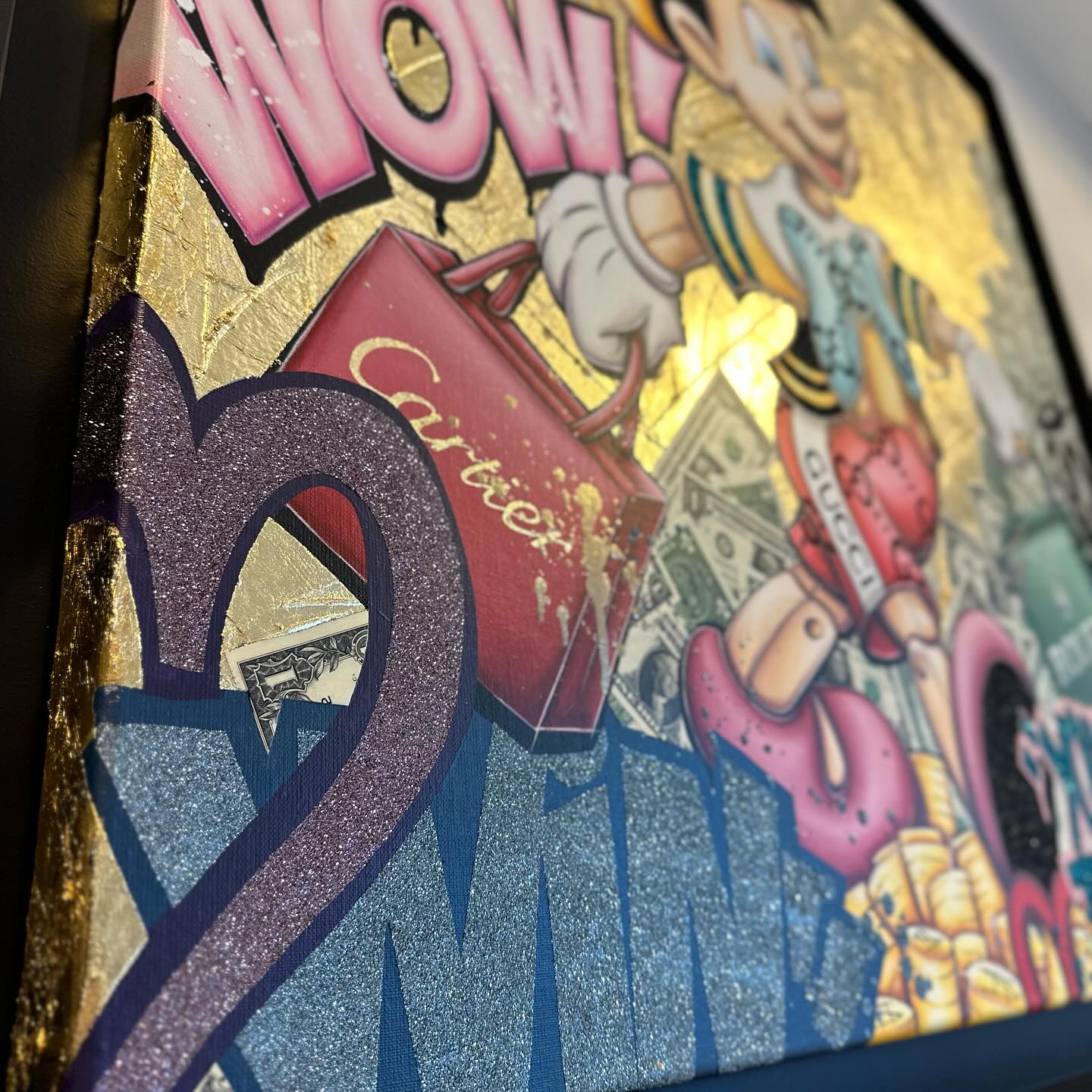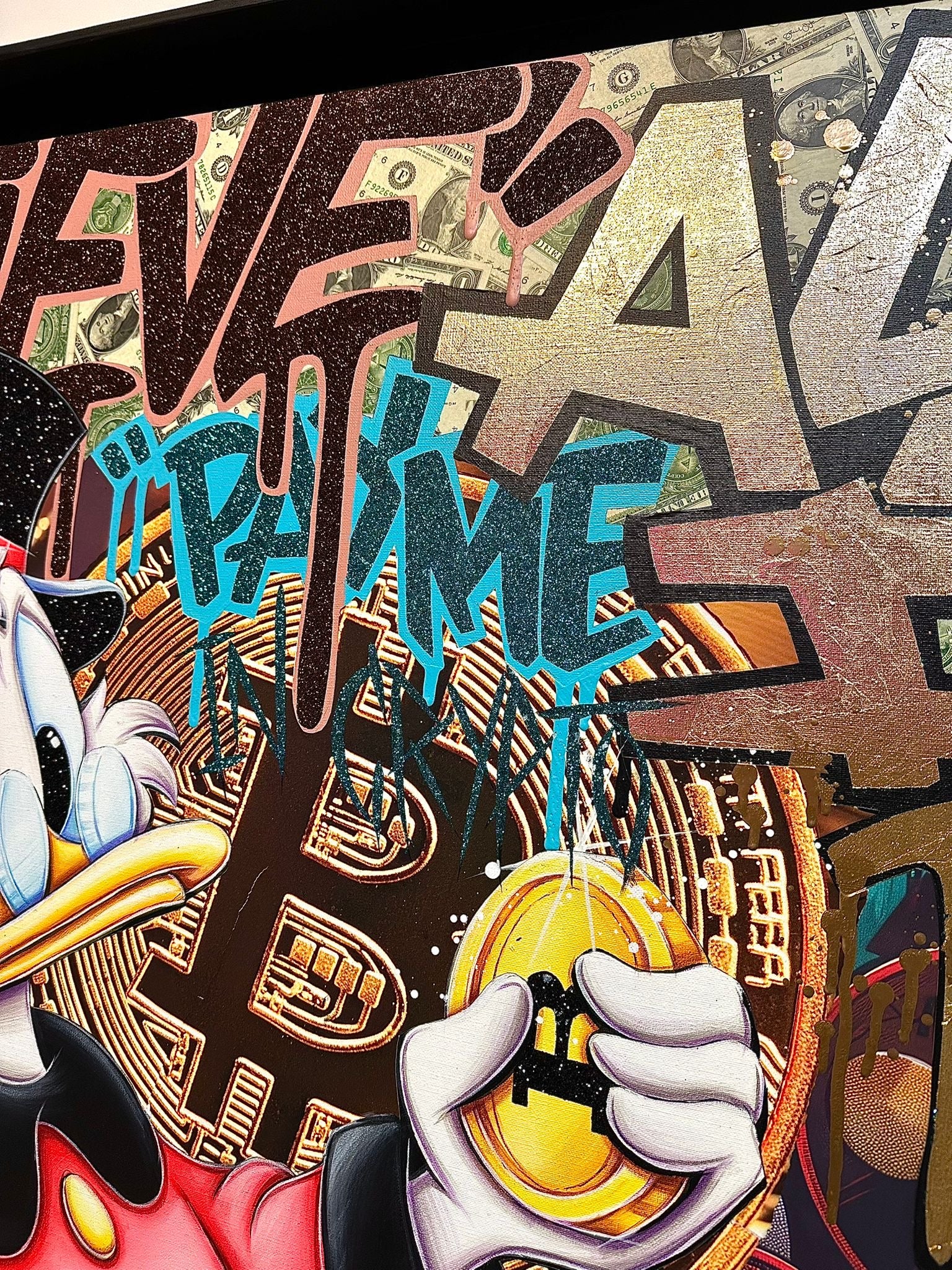 A common thread running through his paintings are the subjects of money and love, often illustrated by popular cartoon characters.