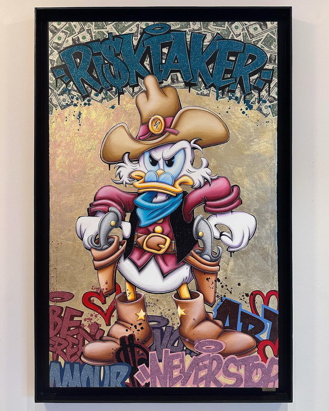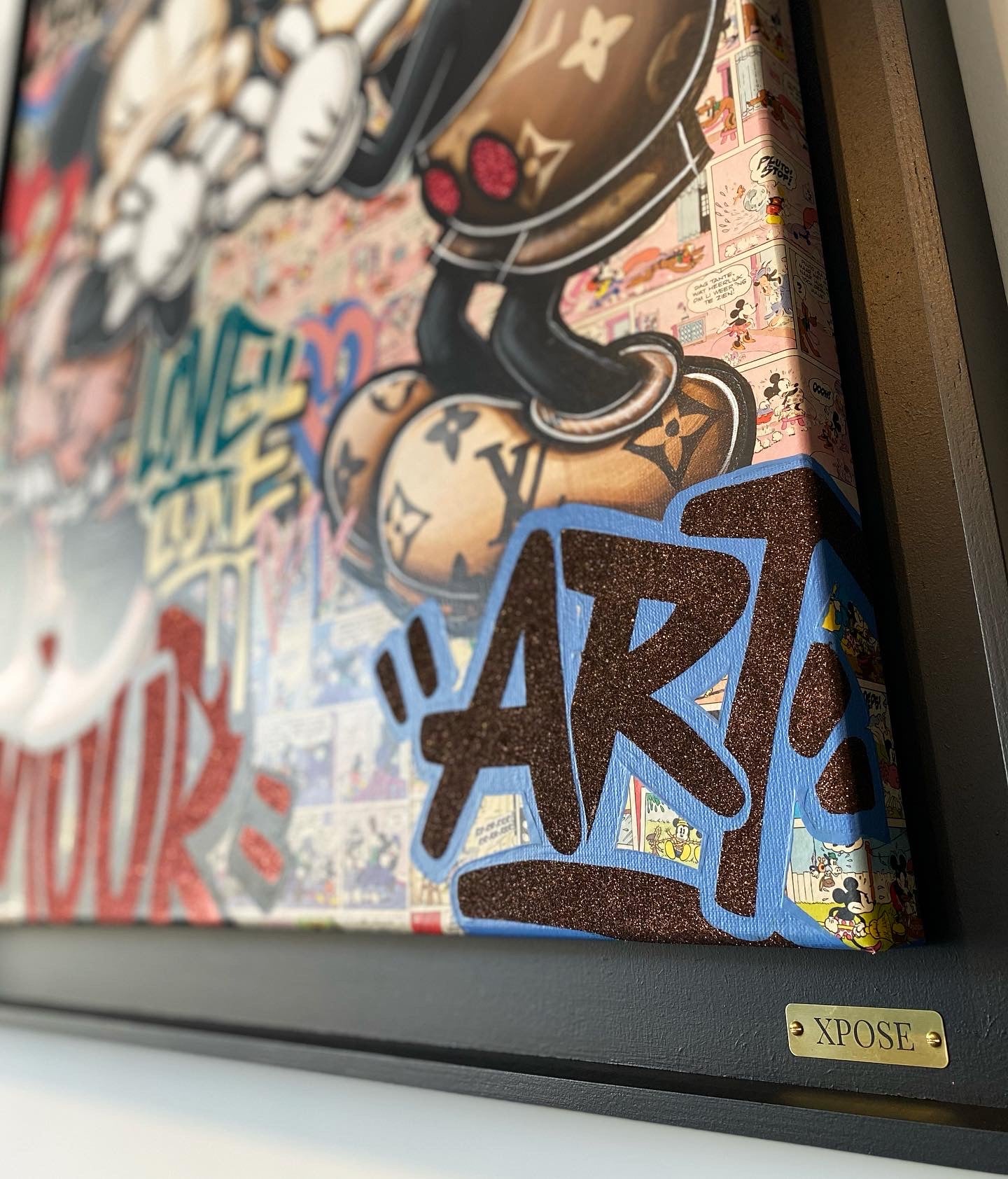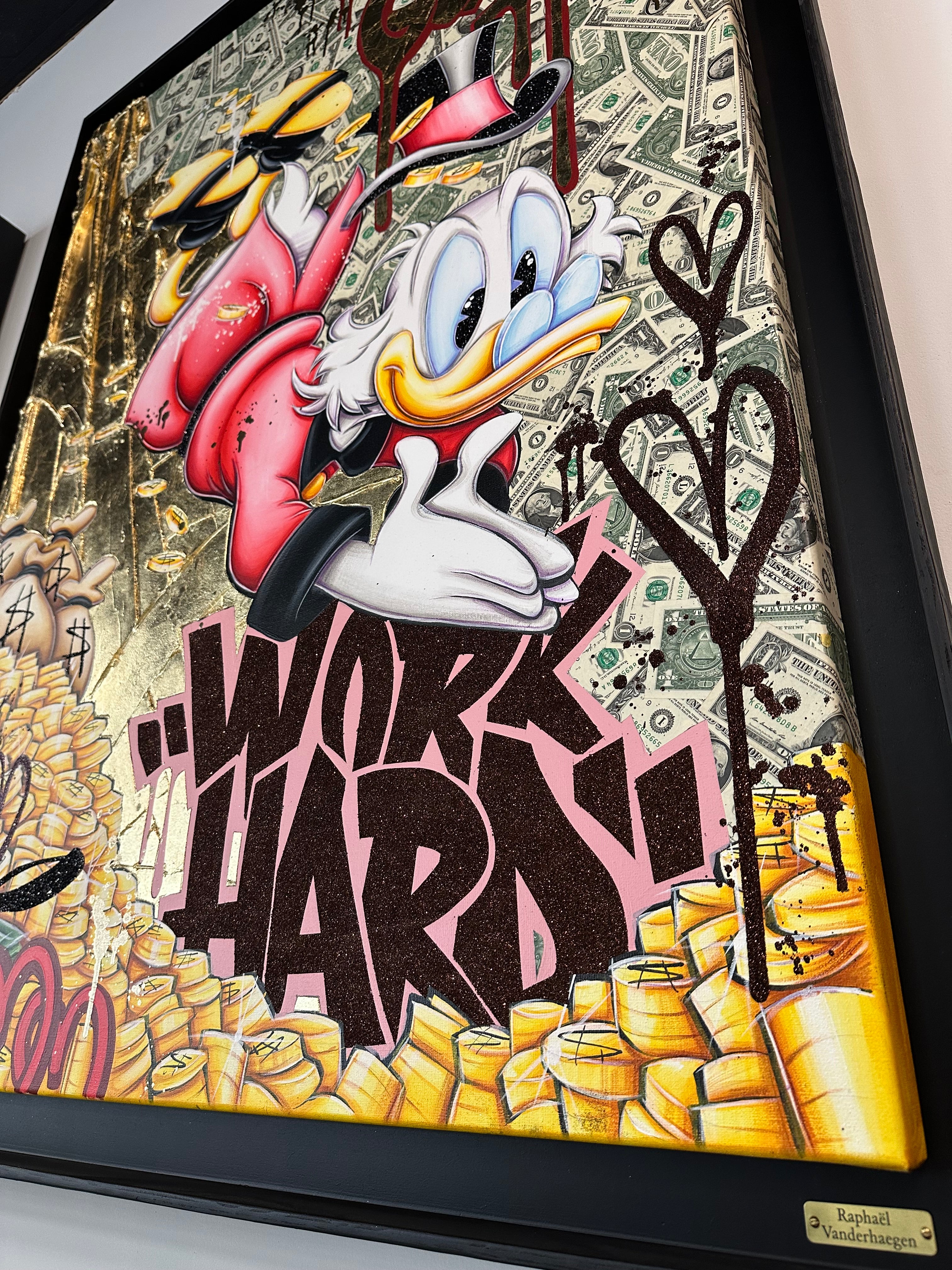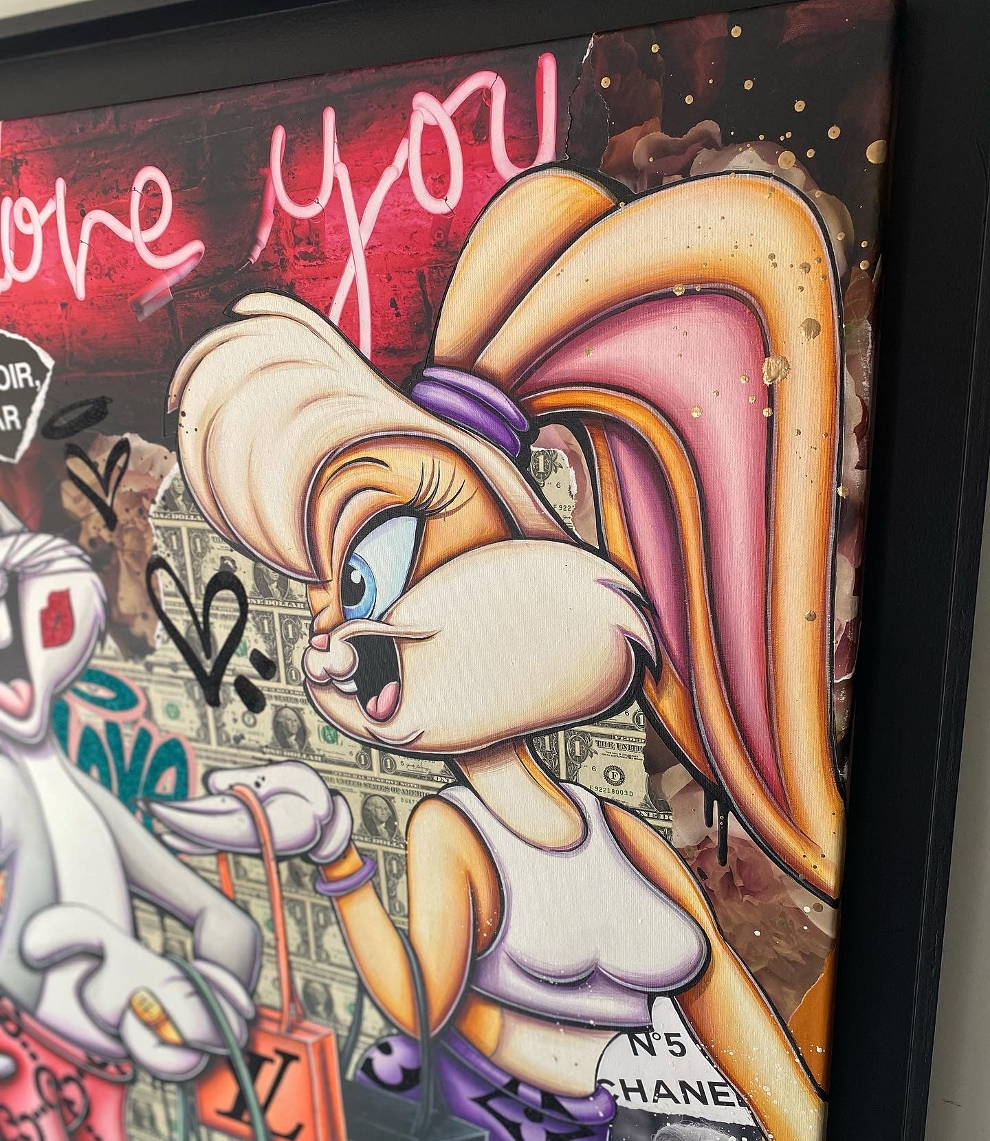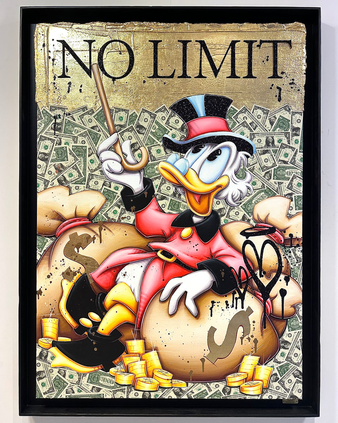 A common thread running through his paintings are the subjects of money and love, often illustrated by popular cartoon characters.