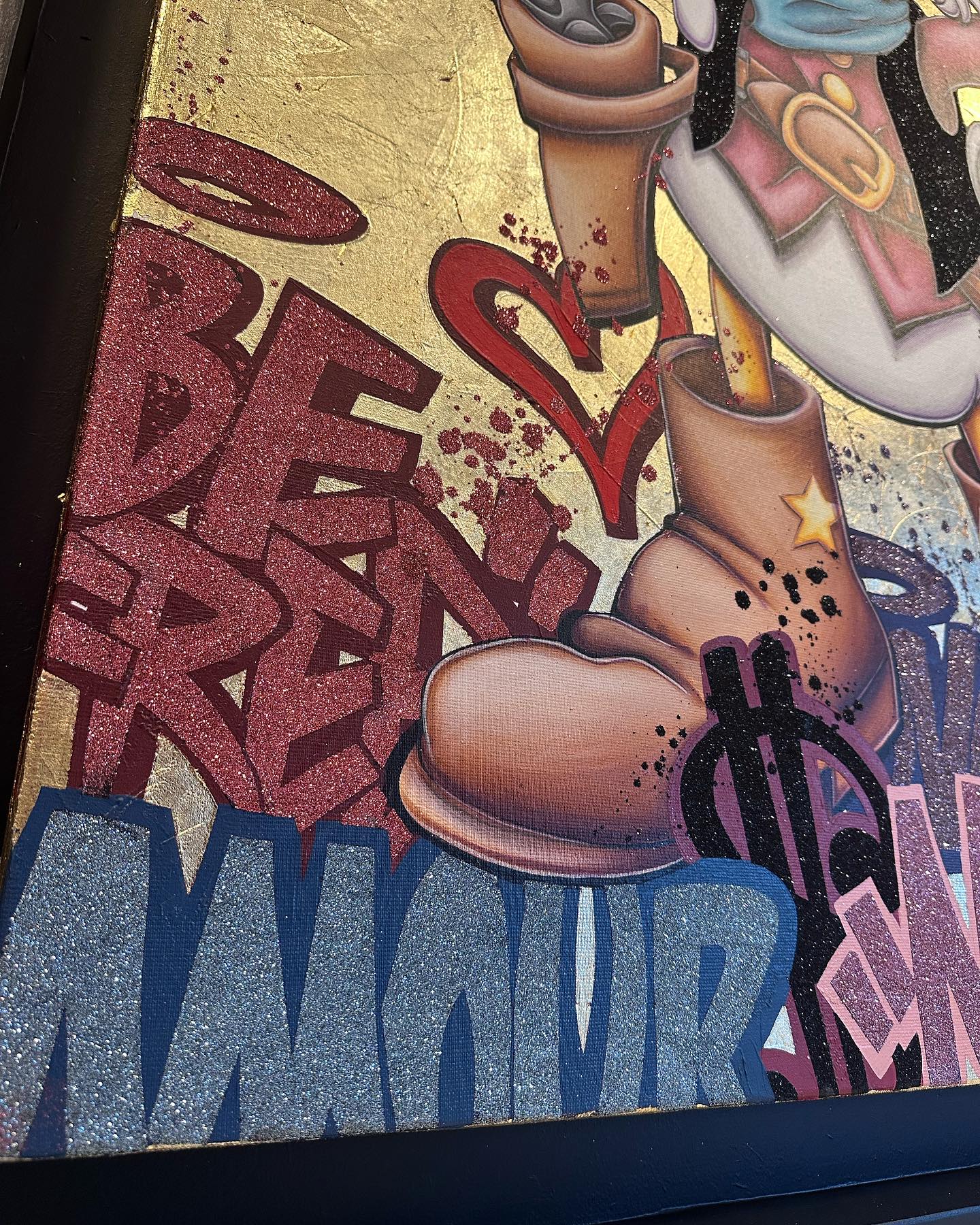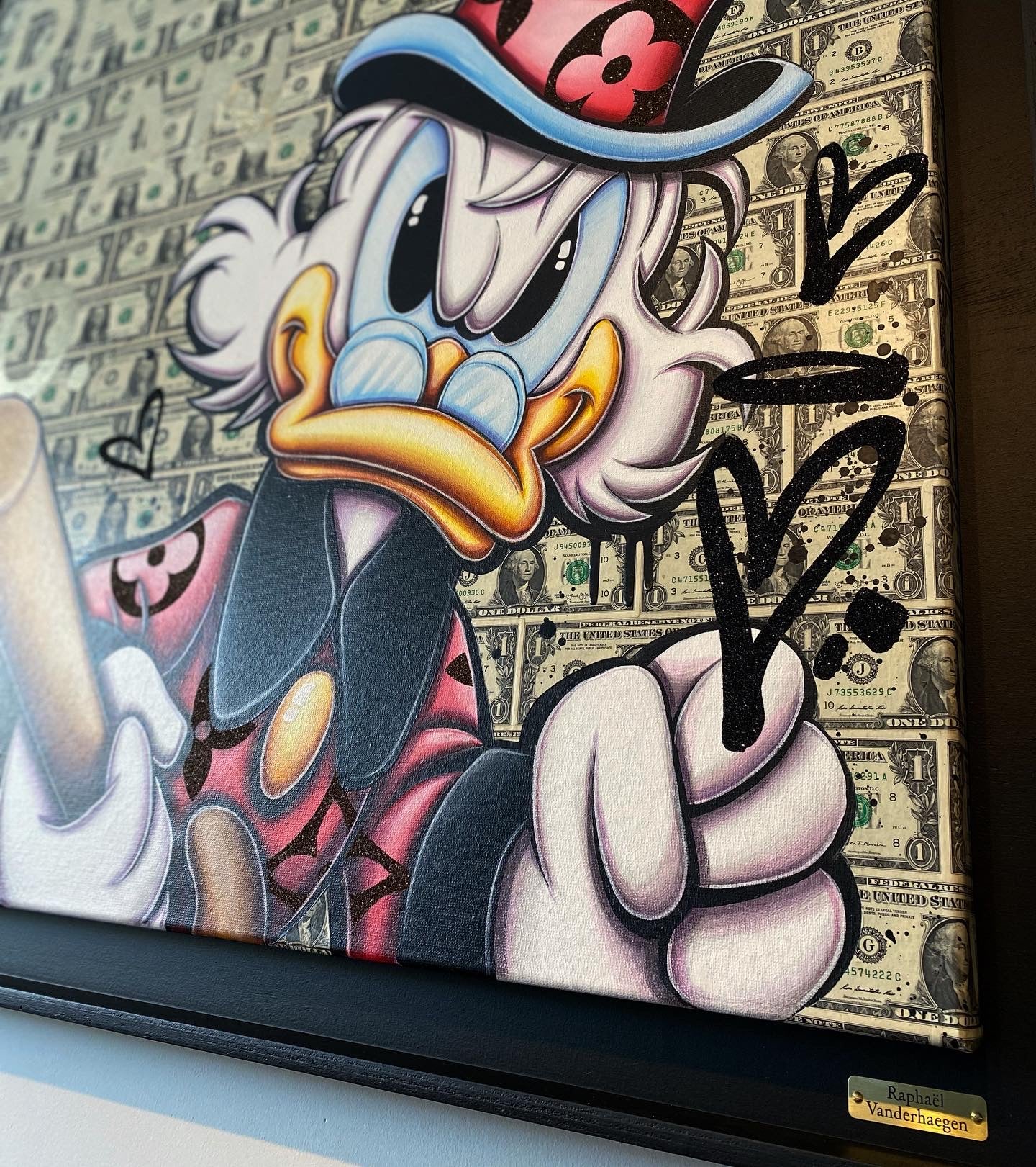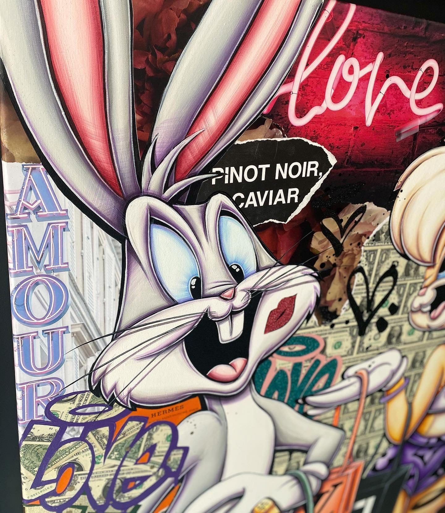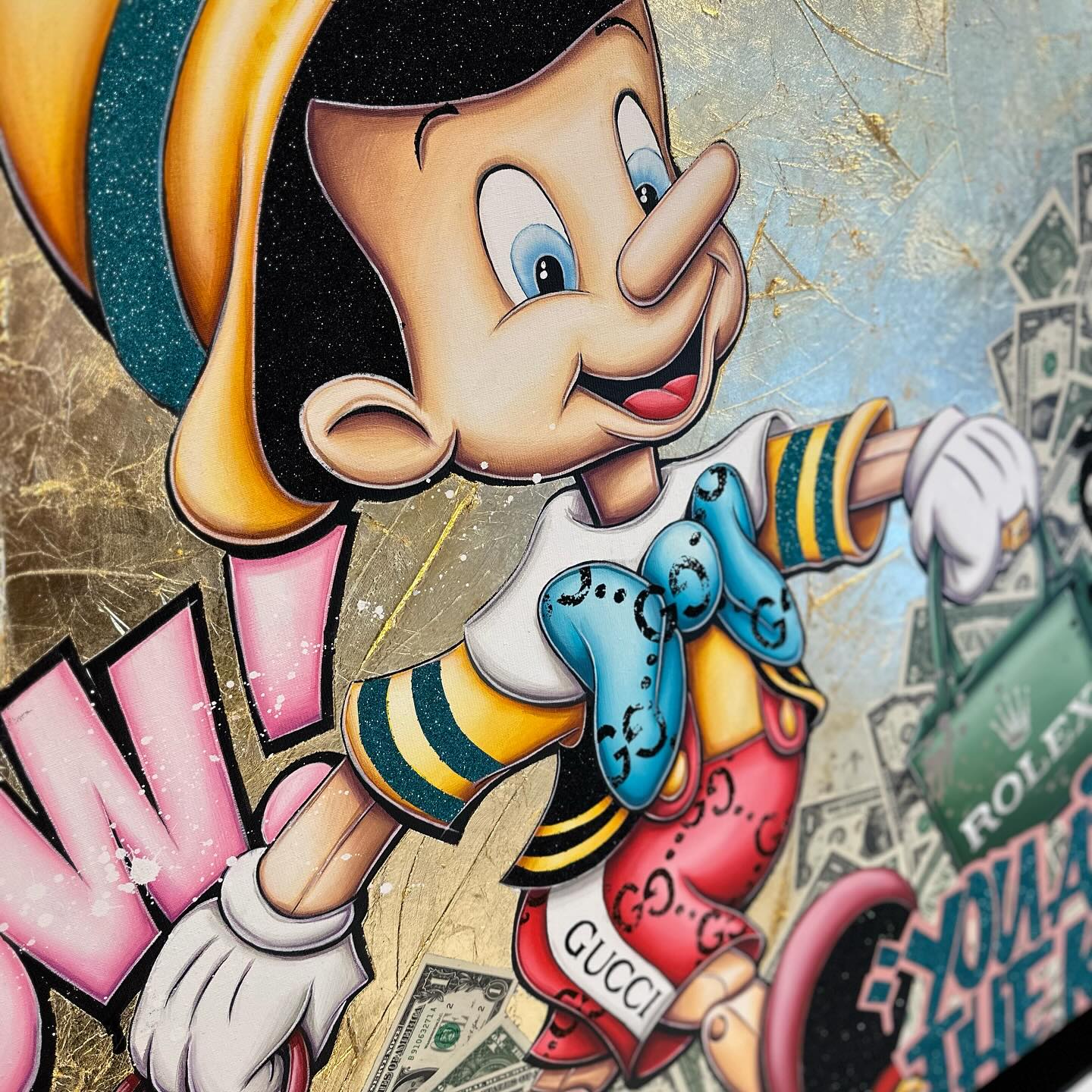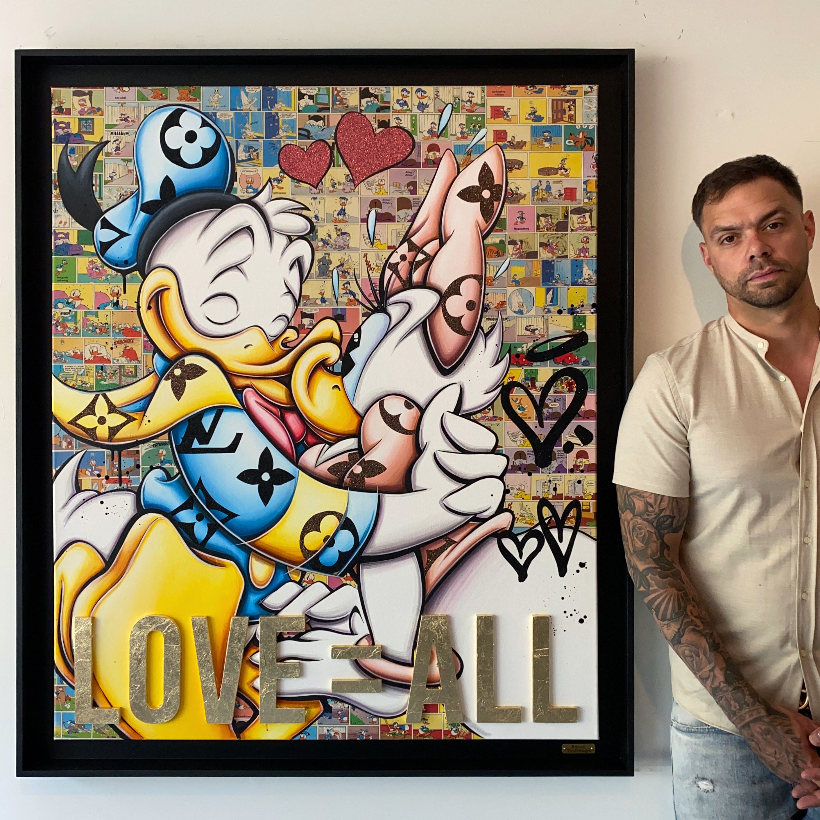 A common thread running through his paintings are the subjects of money and love, often illustrated by popular cartoon characters.