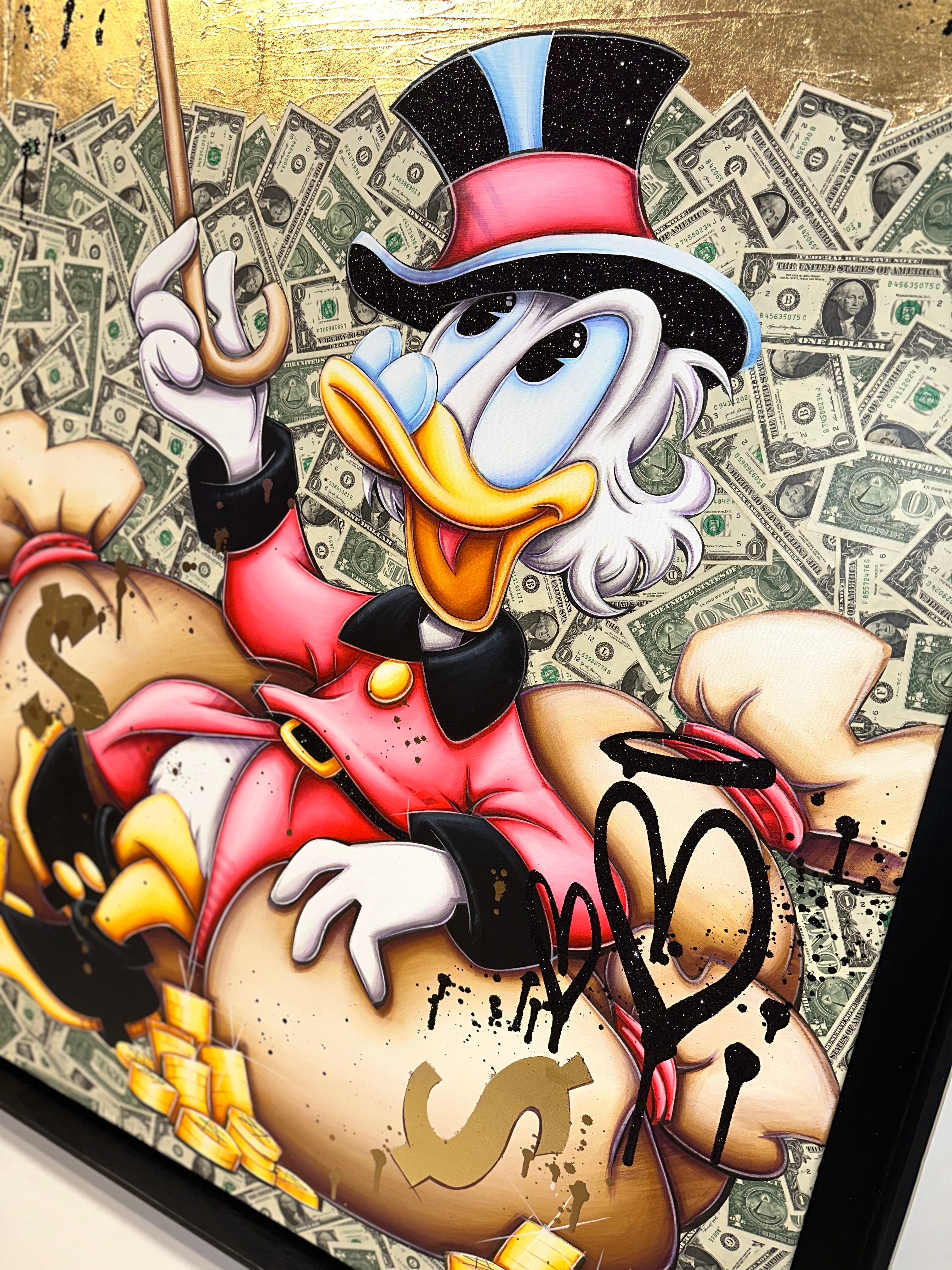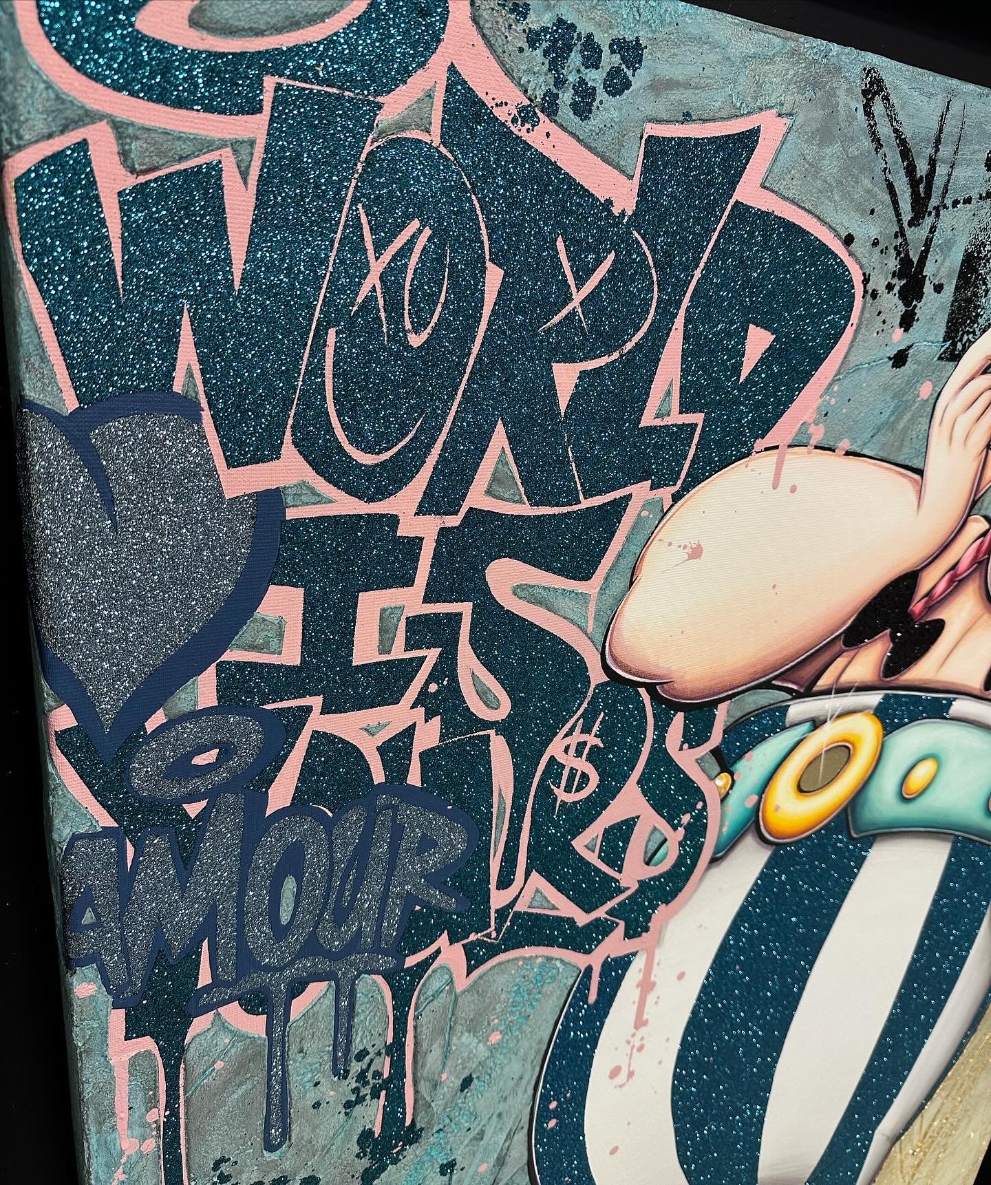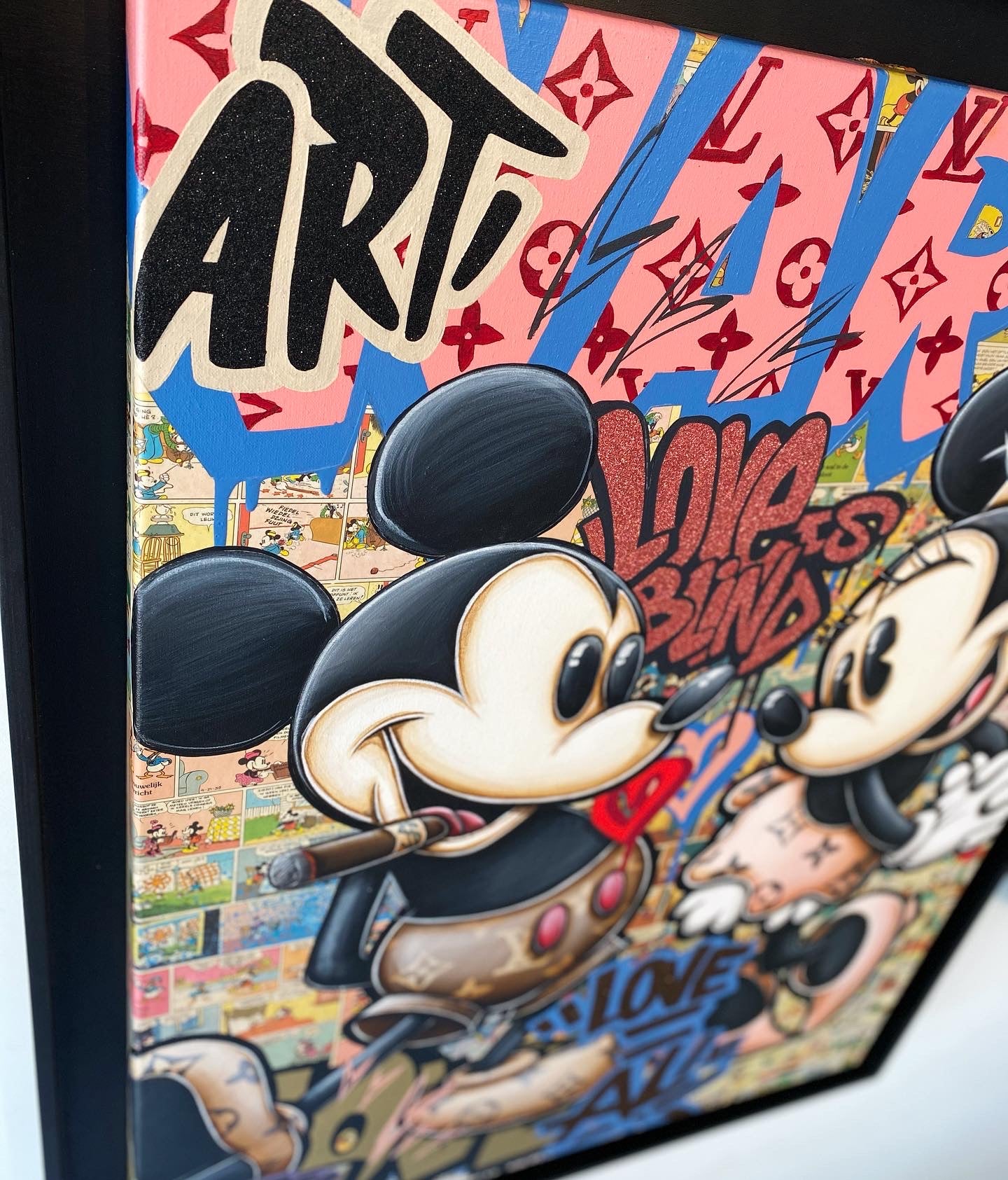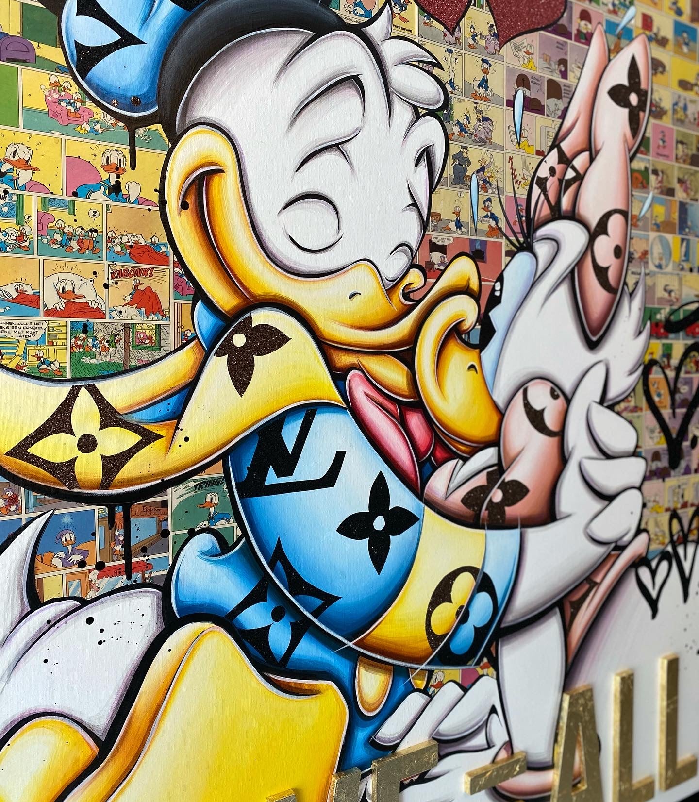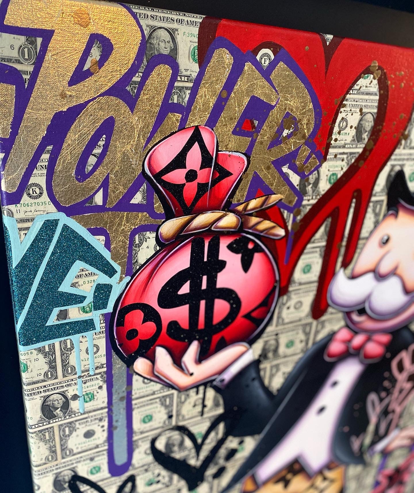 A common thread running through his paintings are the subjects of money and love, often illustrated by popular cartoon characters.