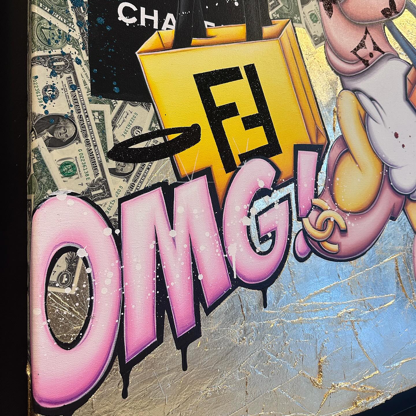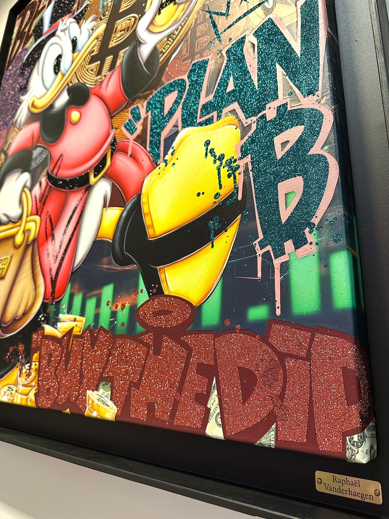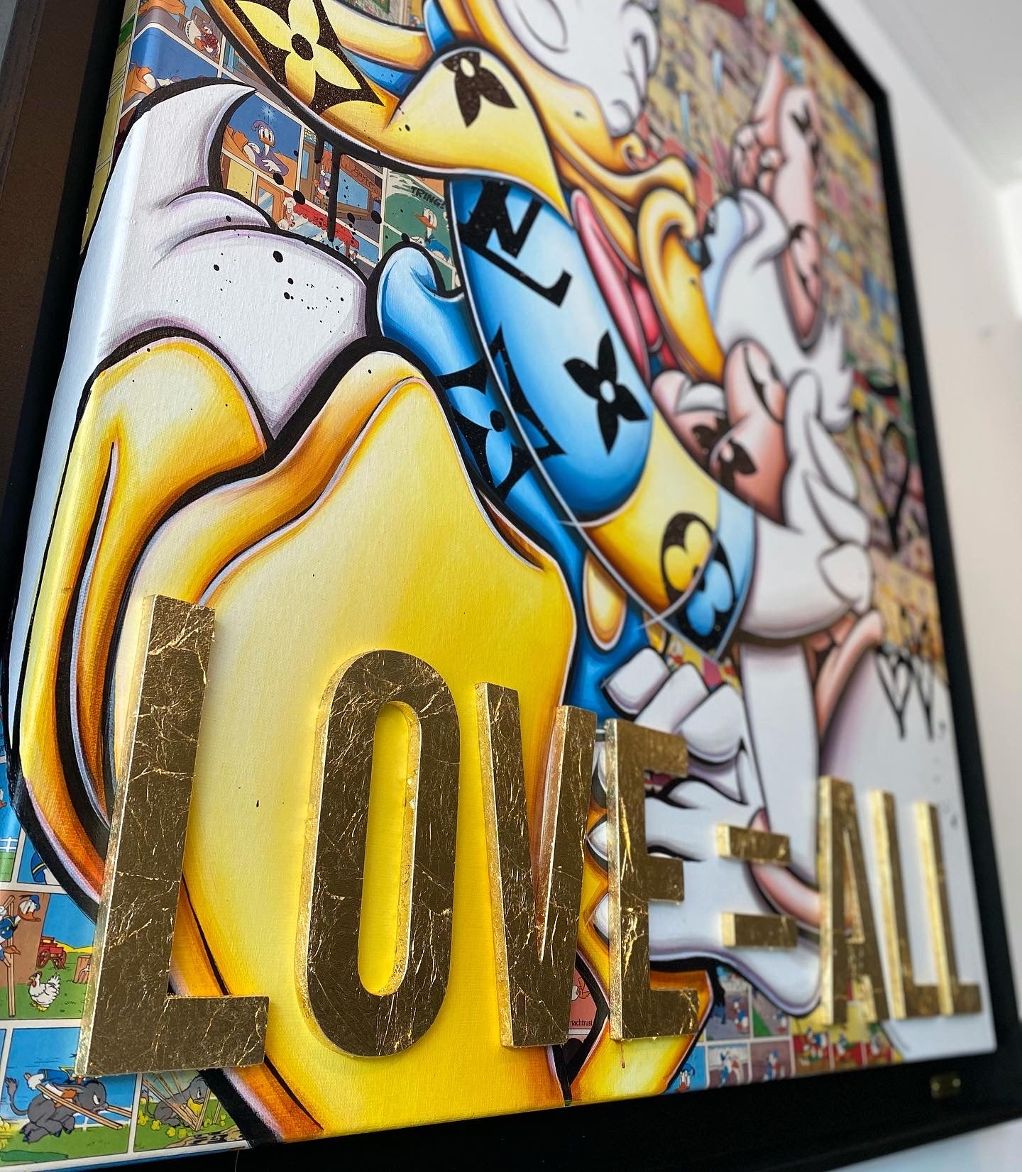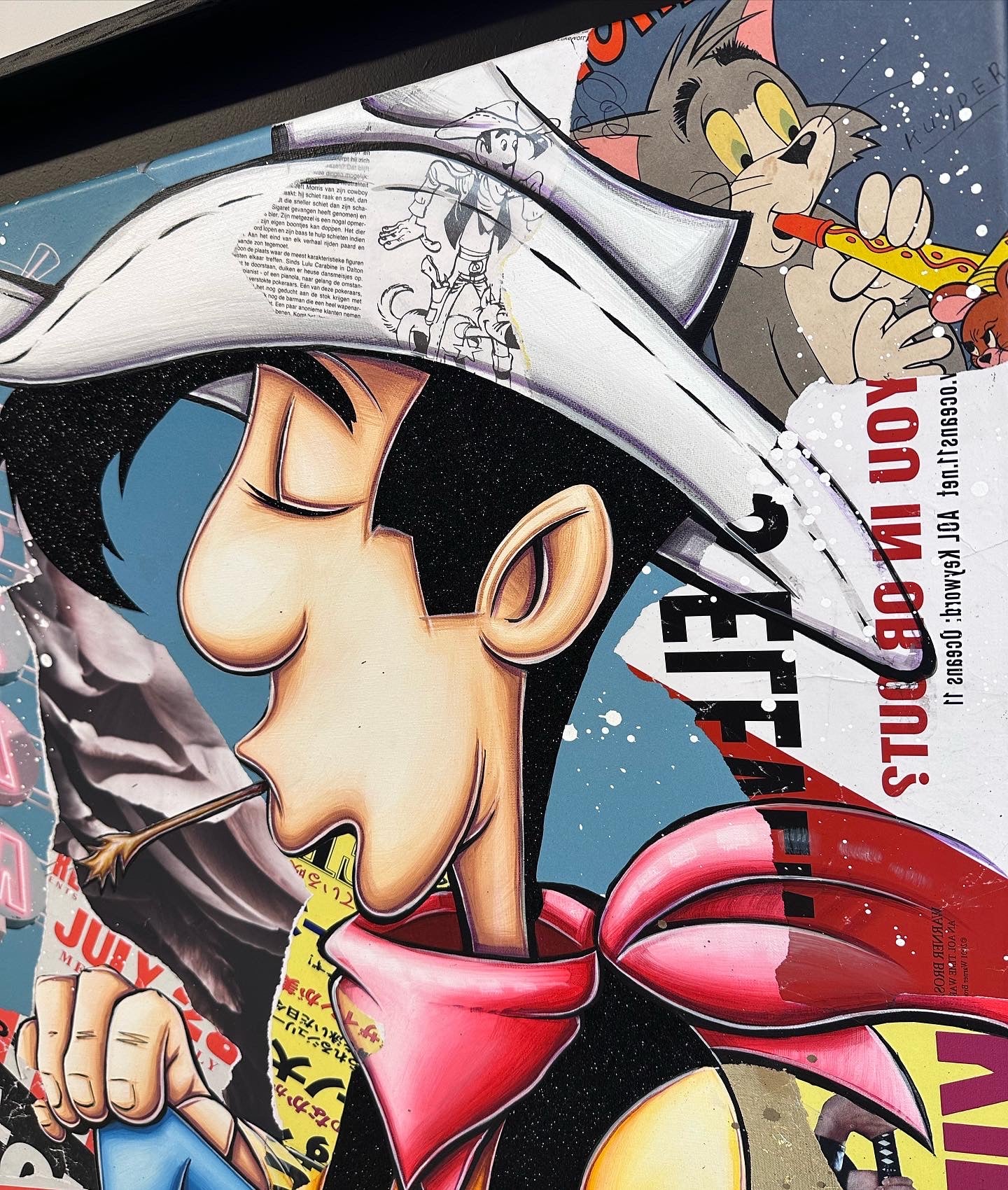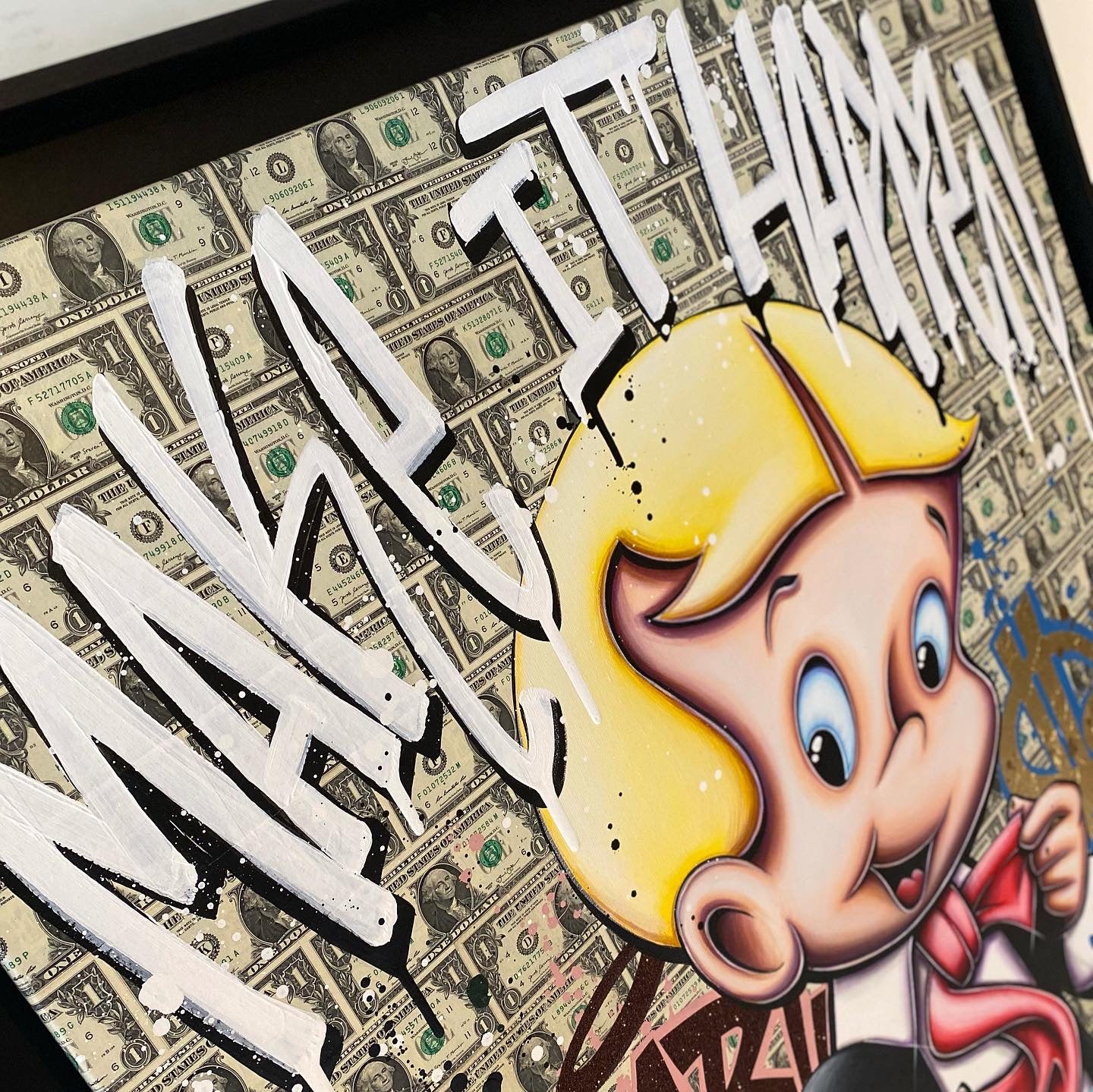 A common thread running through his paintings are the subjects of money and love, often illustrated by popular cartoon characters.