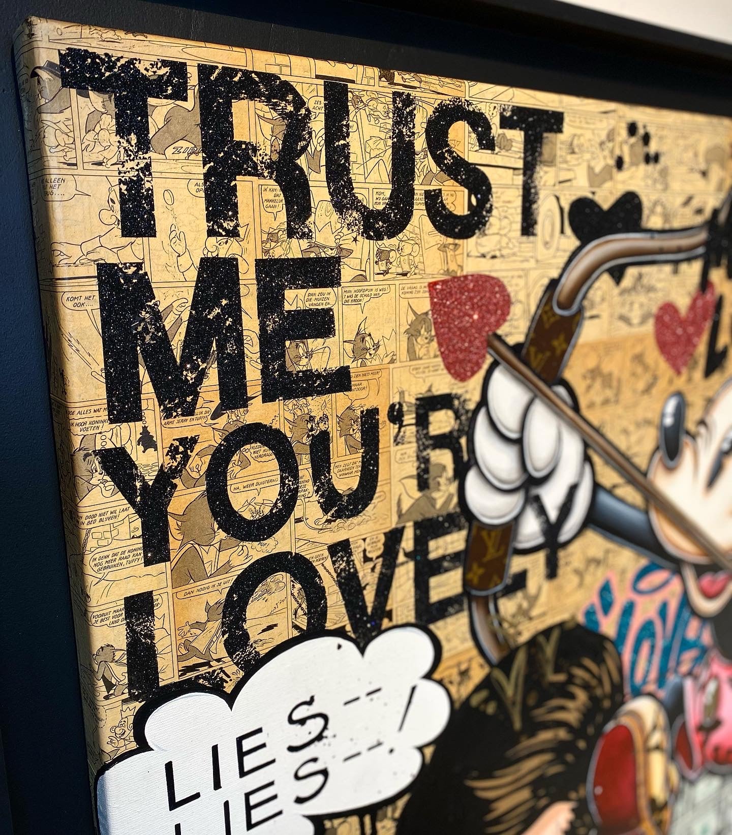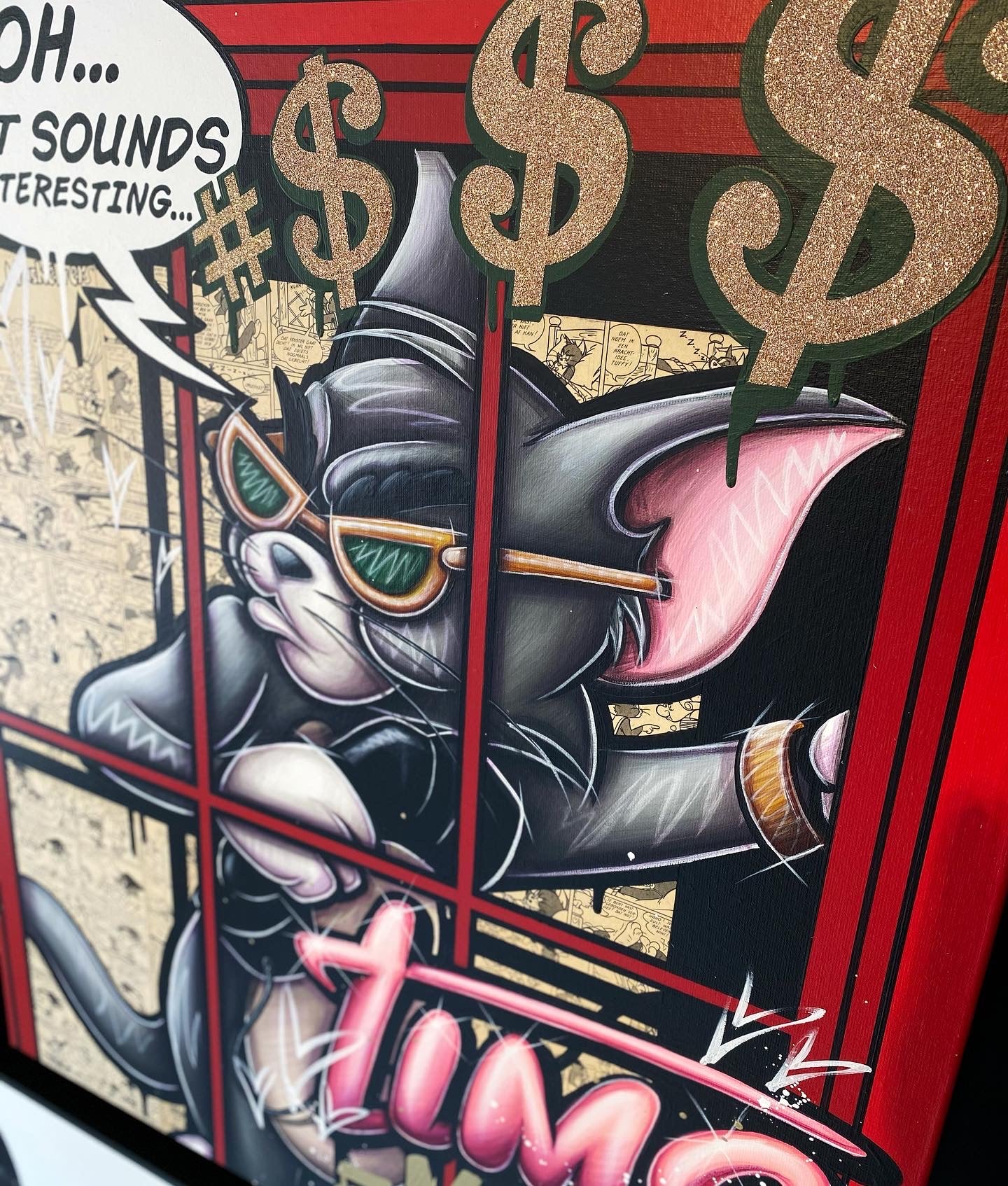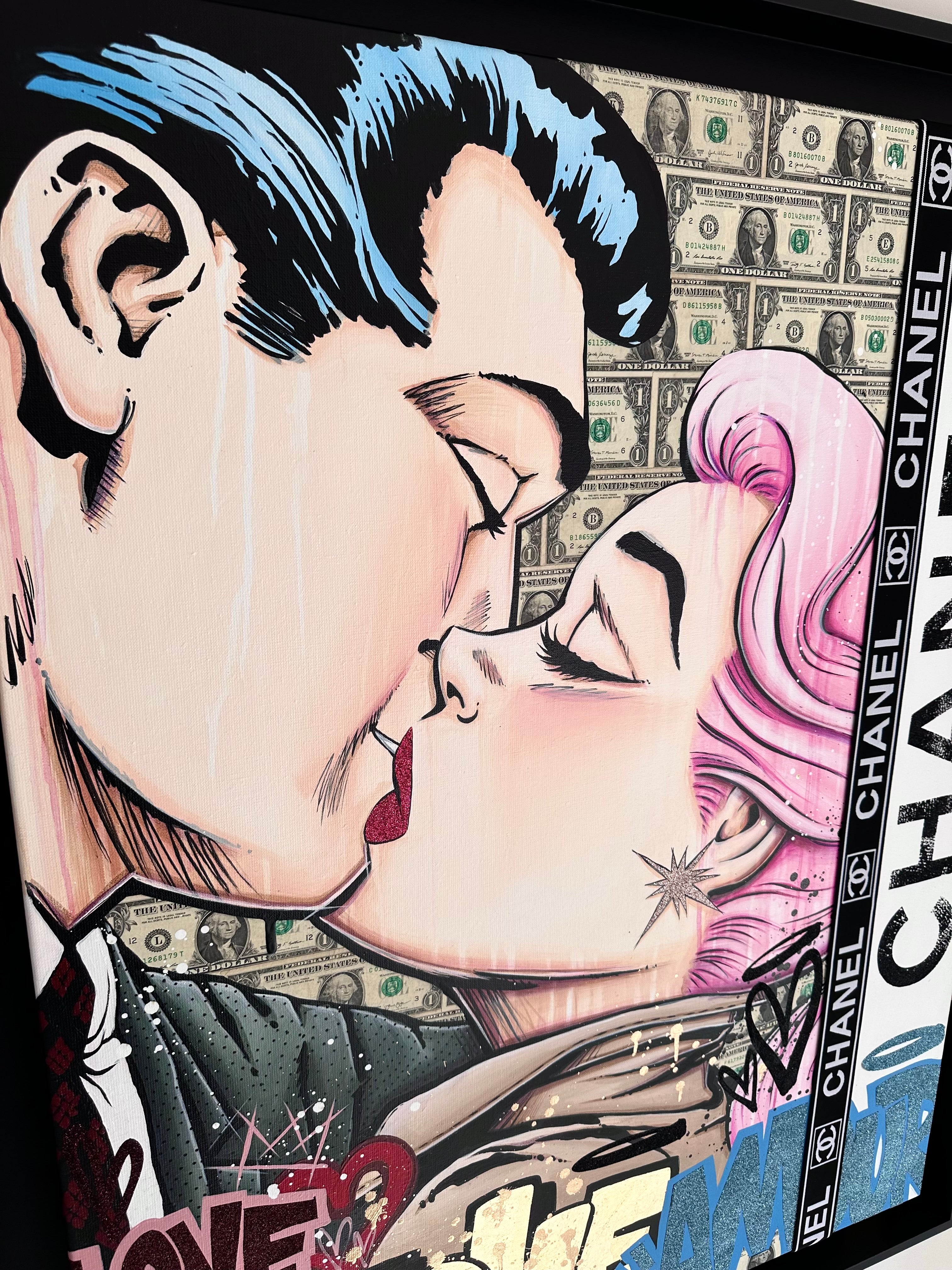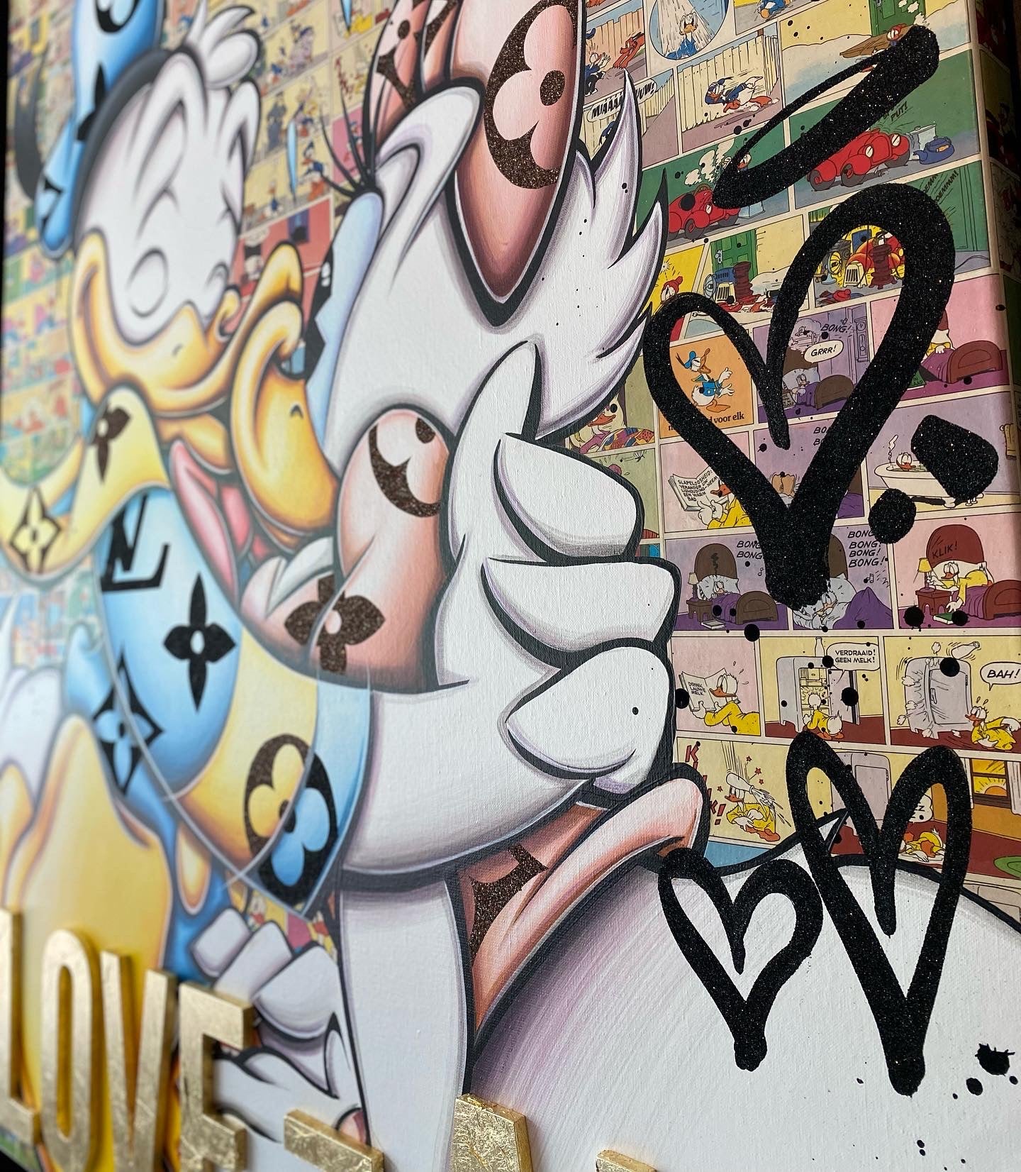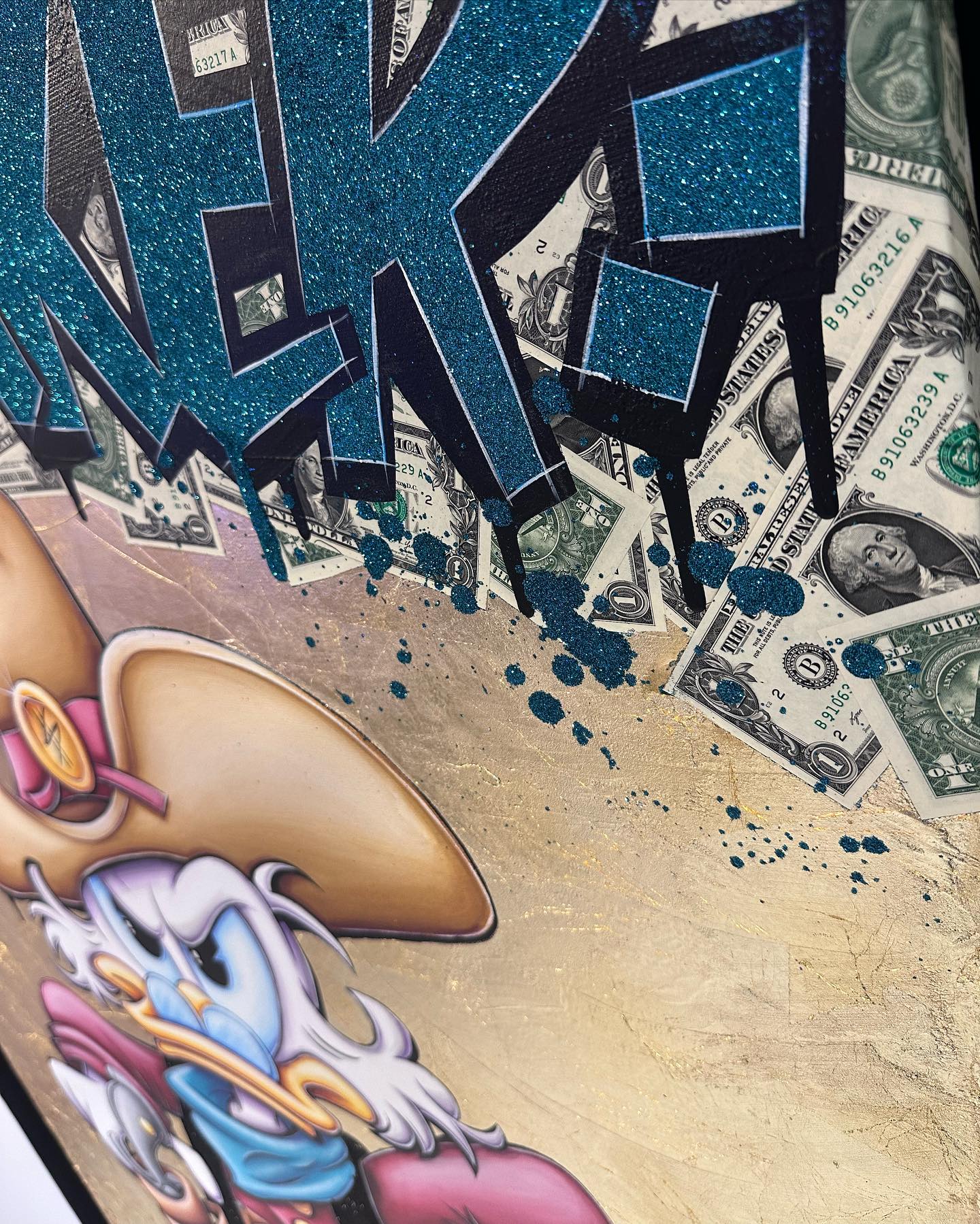 A common thread running through his paintings are the subjects of money and love, often illustrated by popular cartoon characters.
