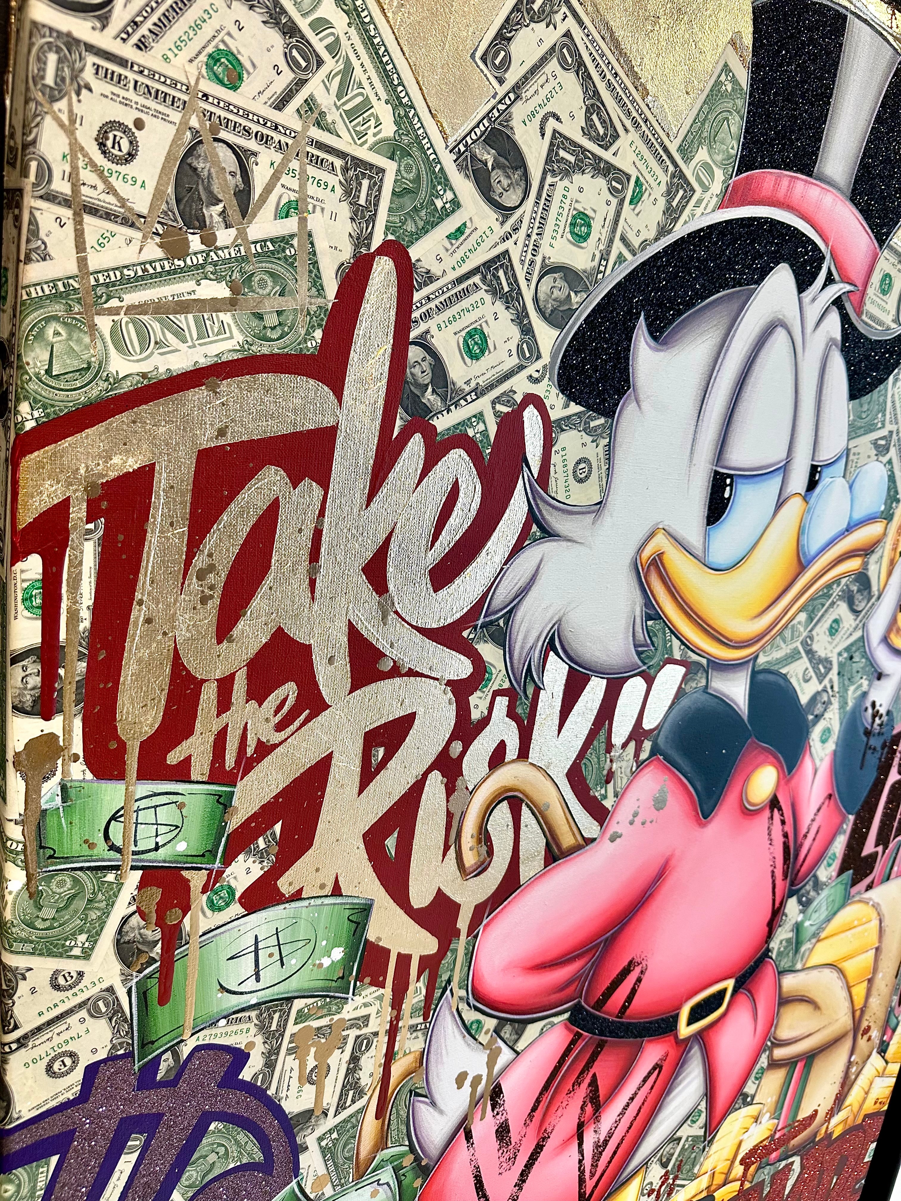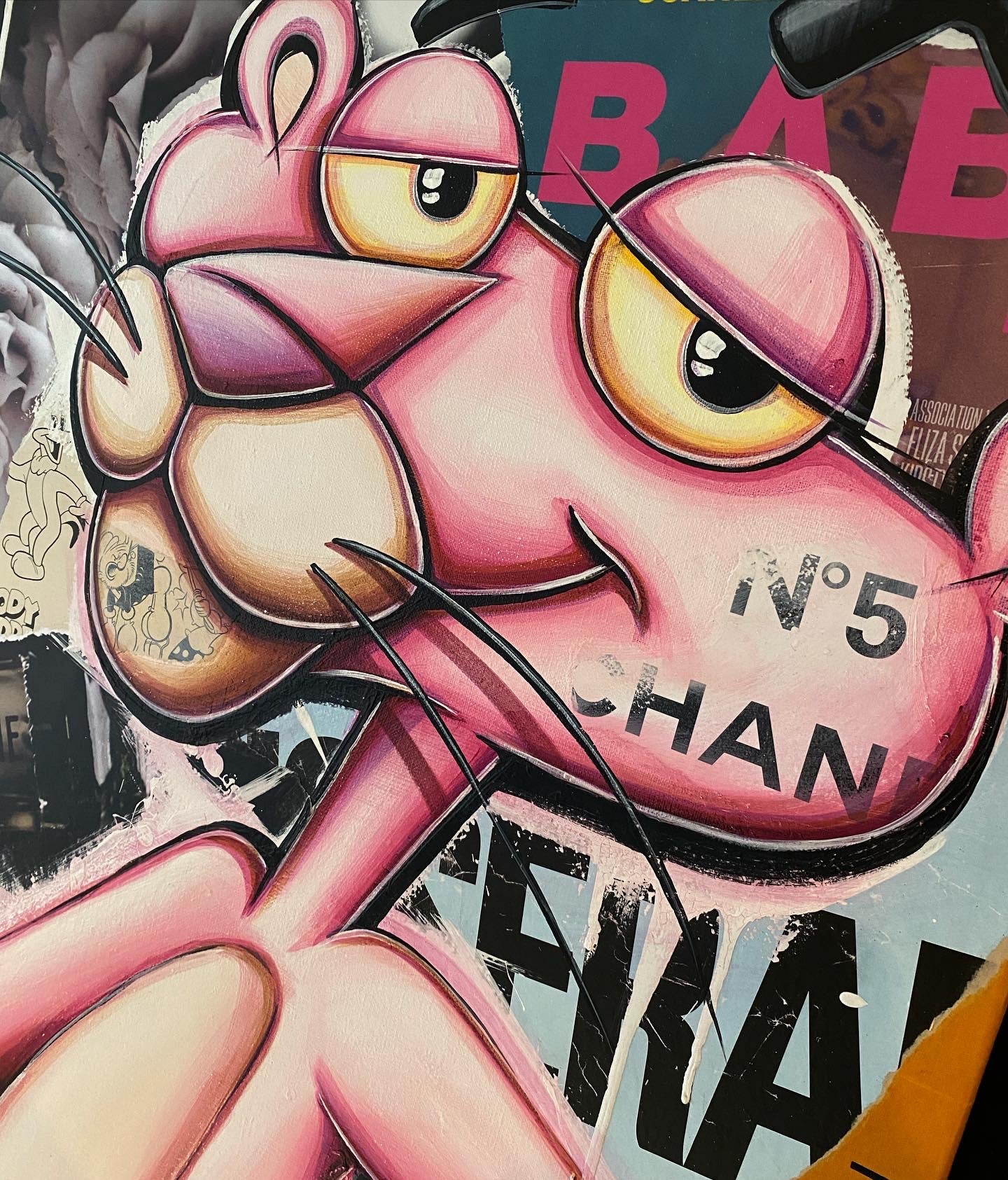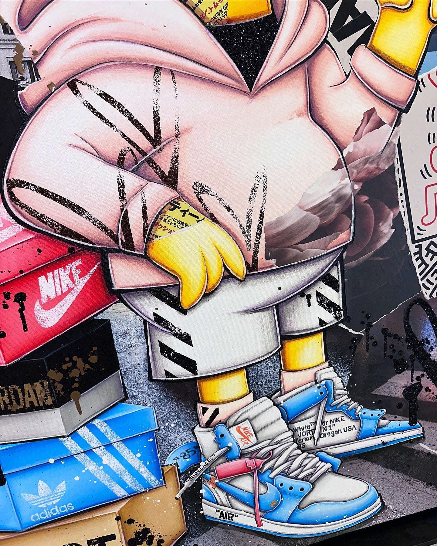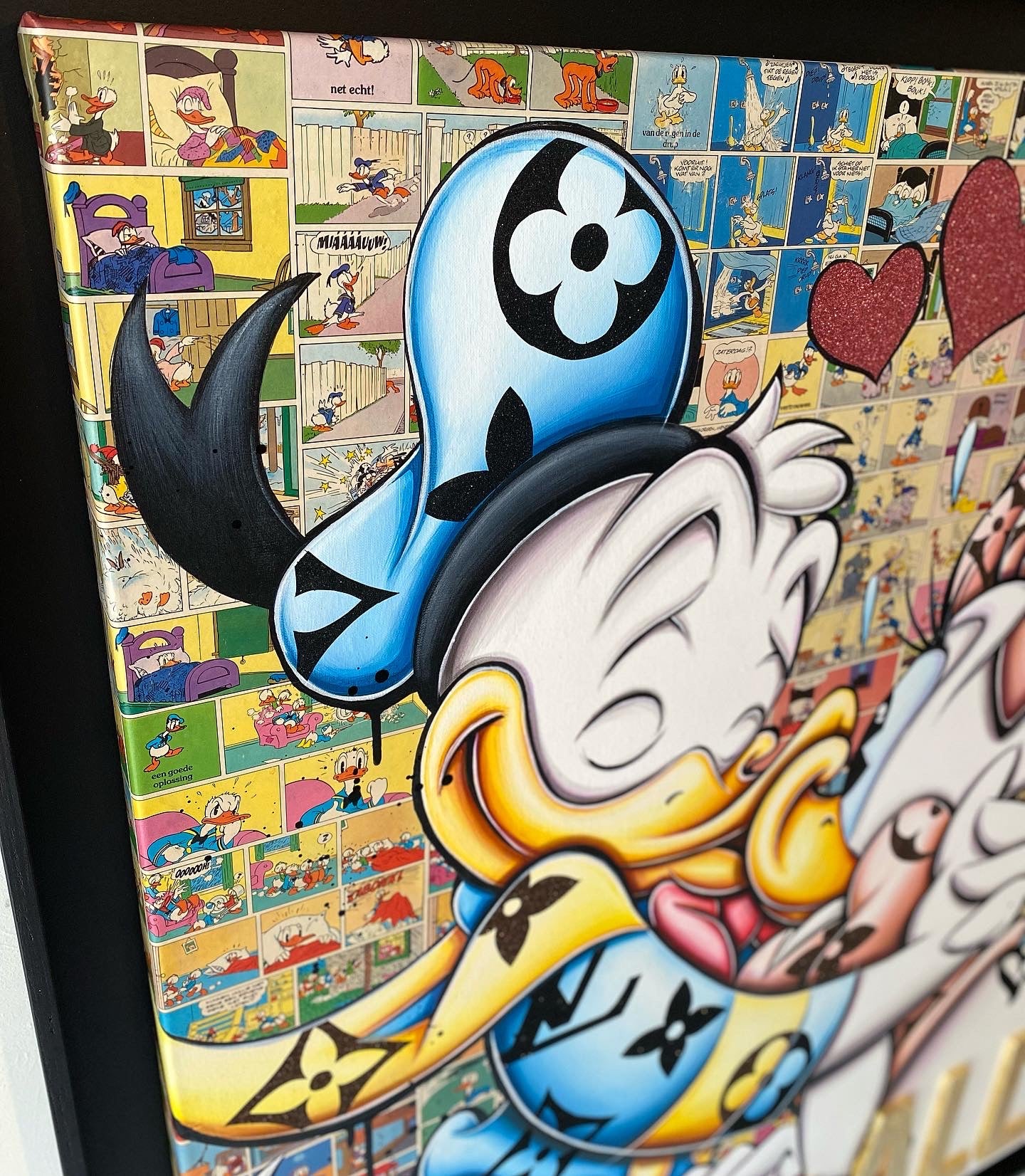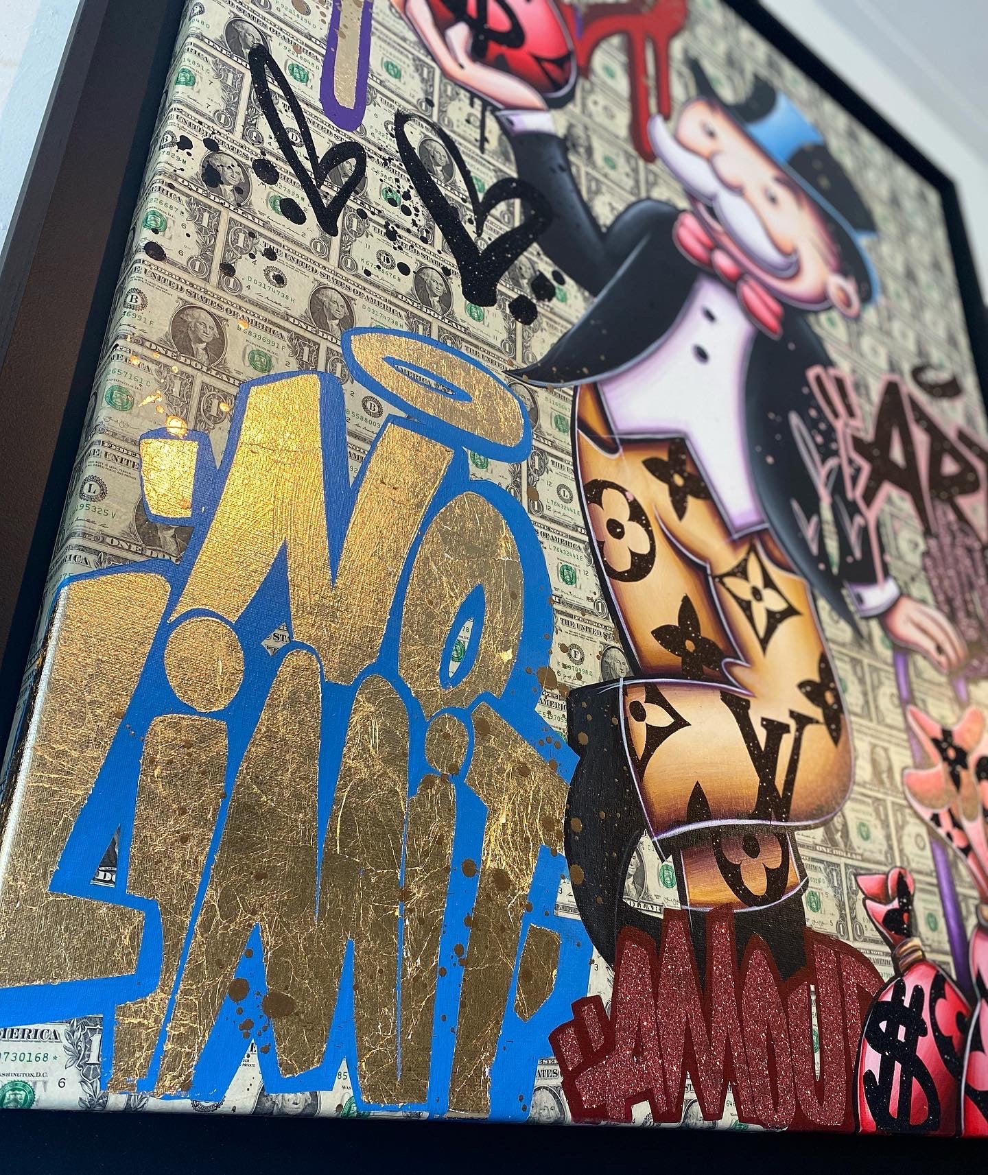 A common thread running through his paintings are the subjects of money and love, often illustrated by popular cartoon characters.