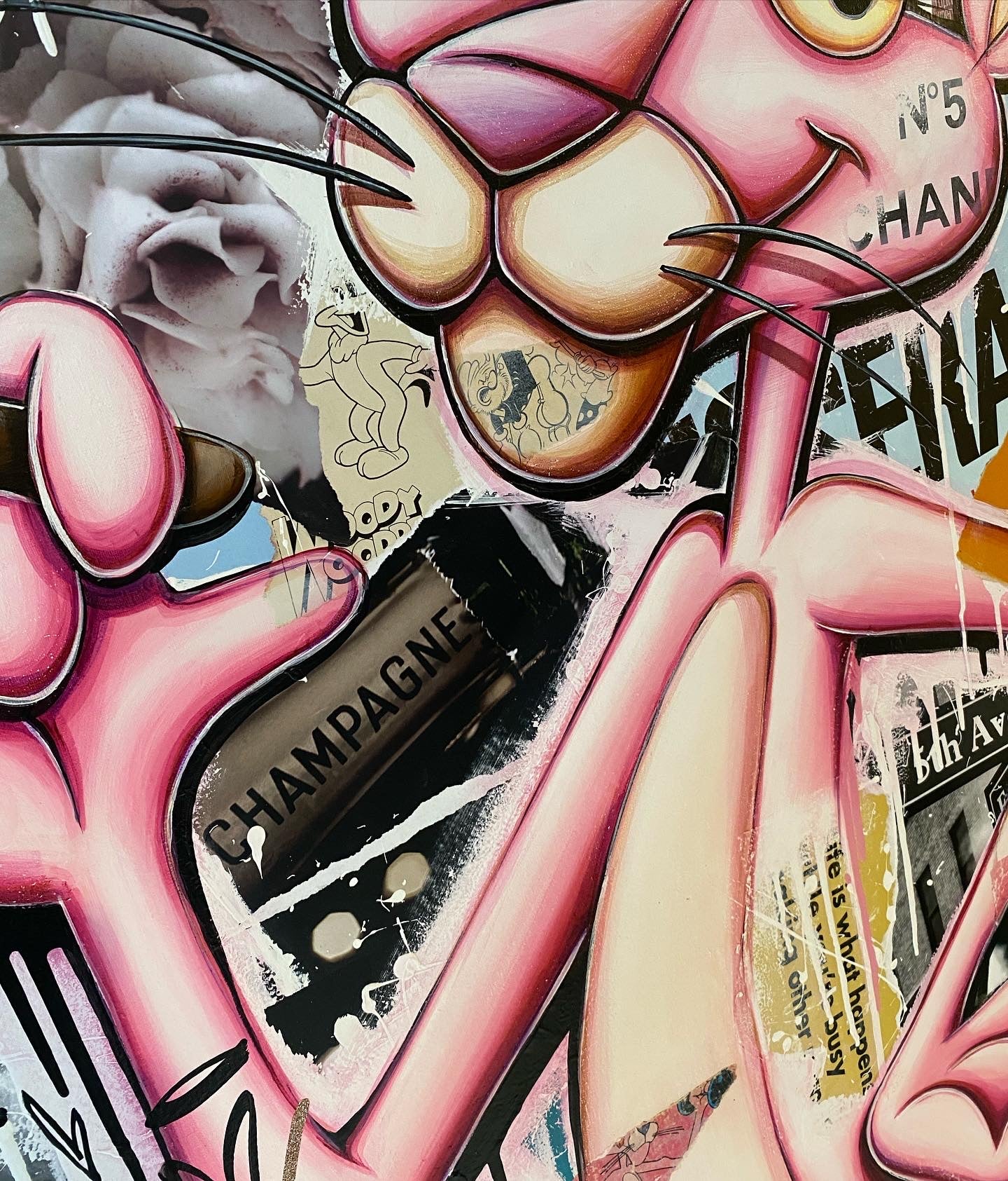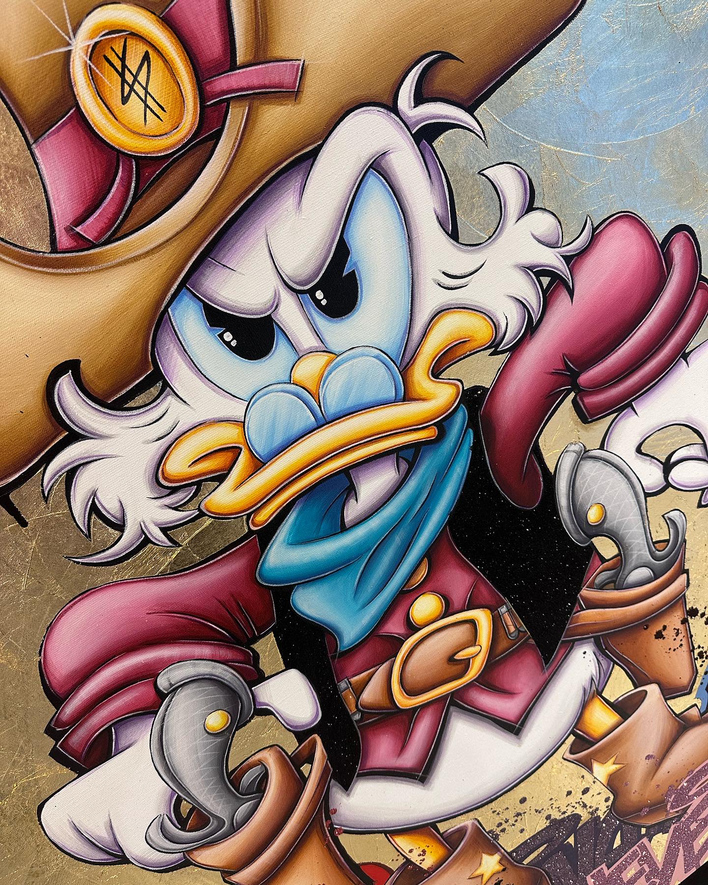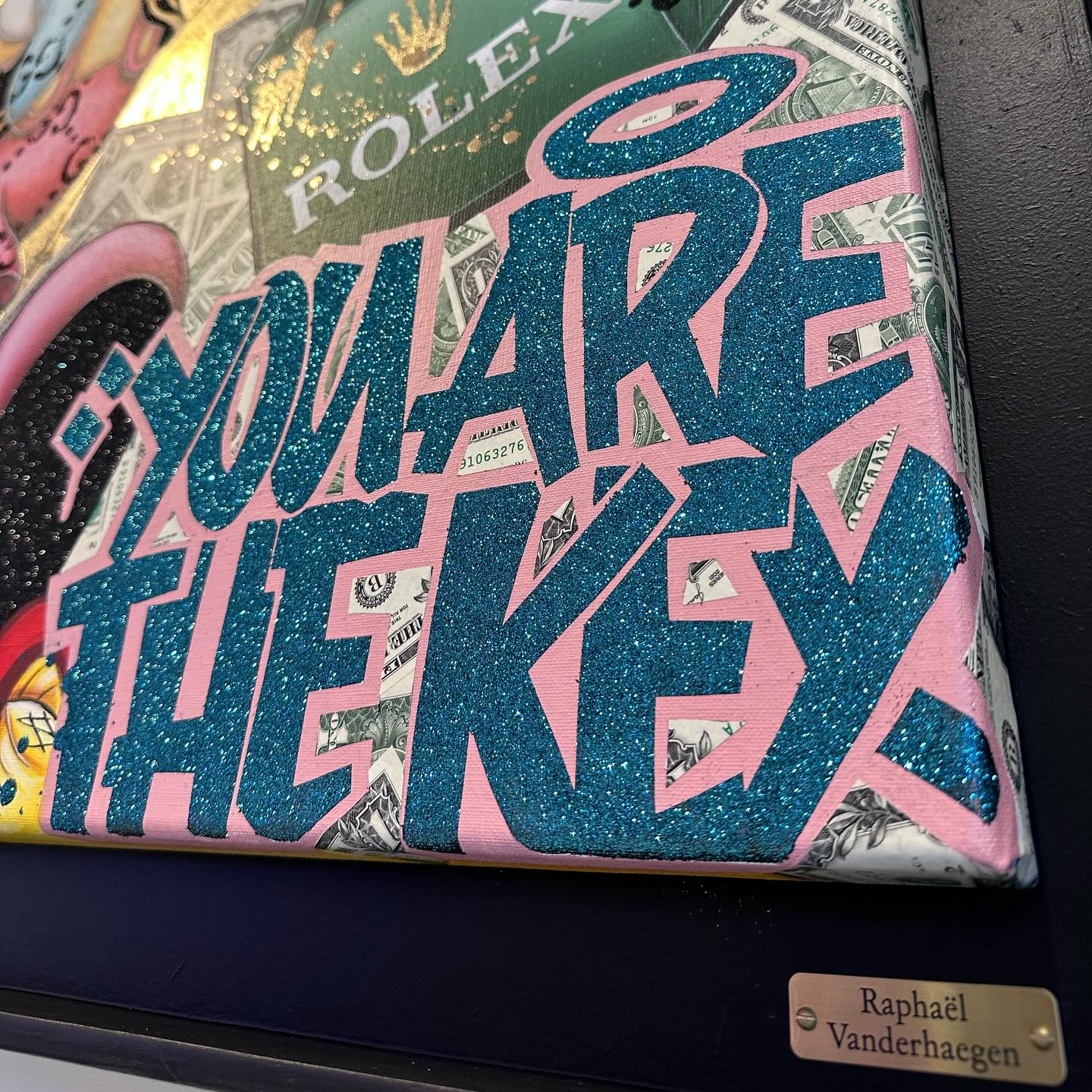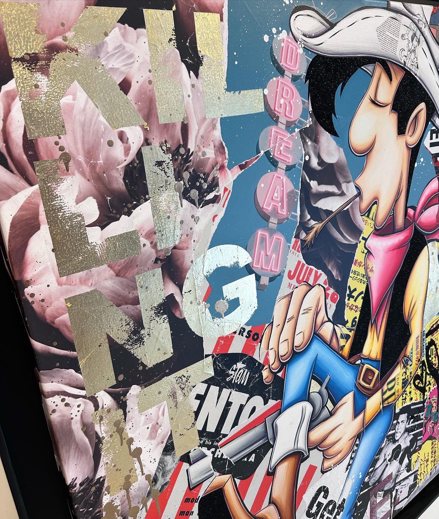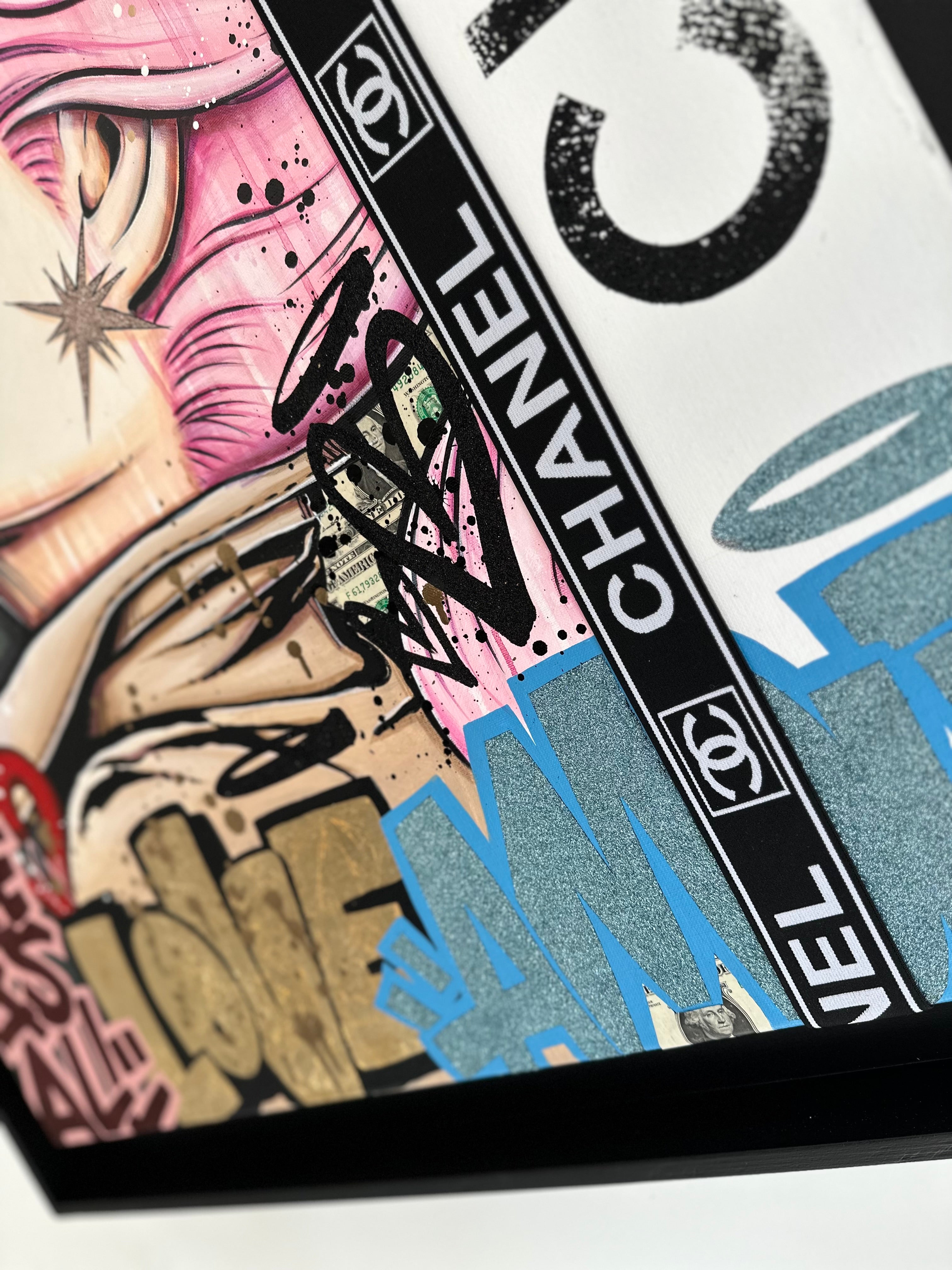 A common thread running through his paintings are the subjects of money and love, often illustrated by popular cartoon characters.